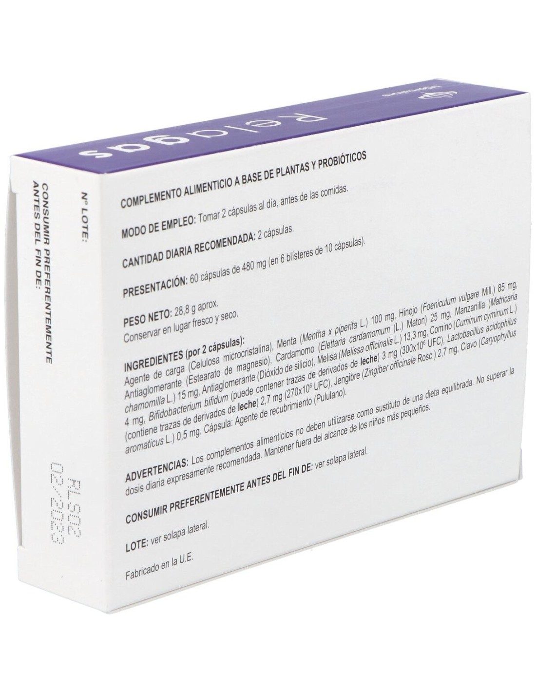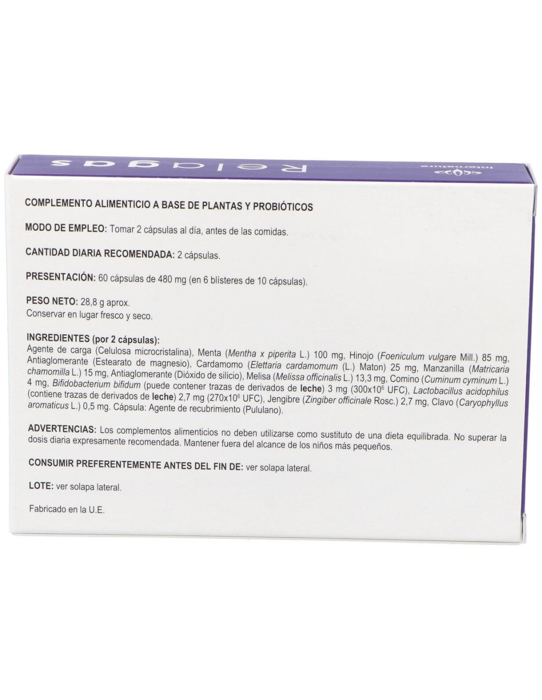 Agente de carga (celulosa microcristalina), menta (menthax piperita piperita L.) 100 mg, hinojo (foeniculum vulgare mil.) 85 mg, antiaglomerante (estearato de magnesio), cardamomo (elettaria cardamomum L. maton) 25 mg, manzanilla (matricaria chamomilla) 15 mg, antiaglomerante (dióxido de silicio), melisa (melissa officinalis L) 13.3 mg, comino (cuminum cynimum L.) 4 mg, bifidobacterium bifidum 3 mg, (300x10(6) UFC), lactobacillus acidophilus 2,7 mg (270x10 (6) UFC), jengibre (zingiber officinalis rosc) 2,7 mg, clavo (cardyophyllus aromaticus) 0,5 mg, cápsula: agente de recubrimiento (pululano).