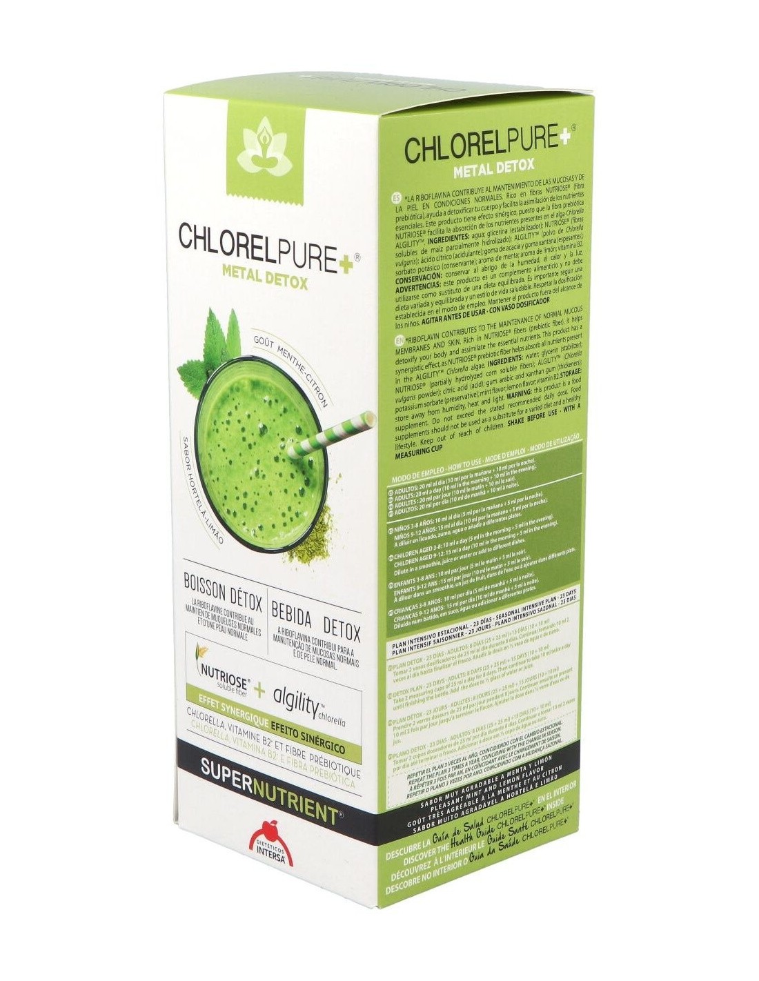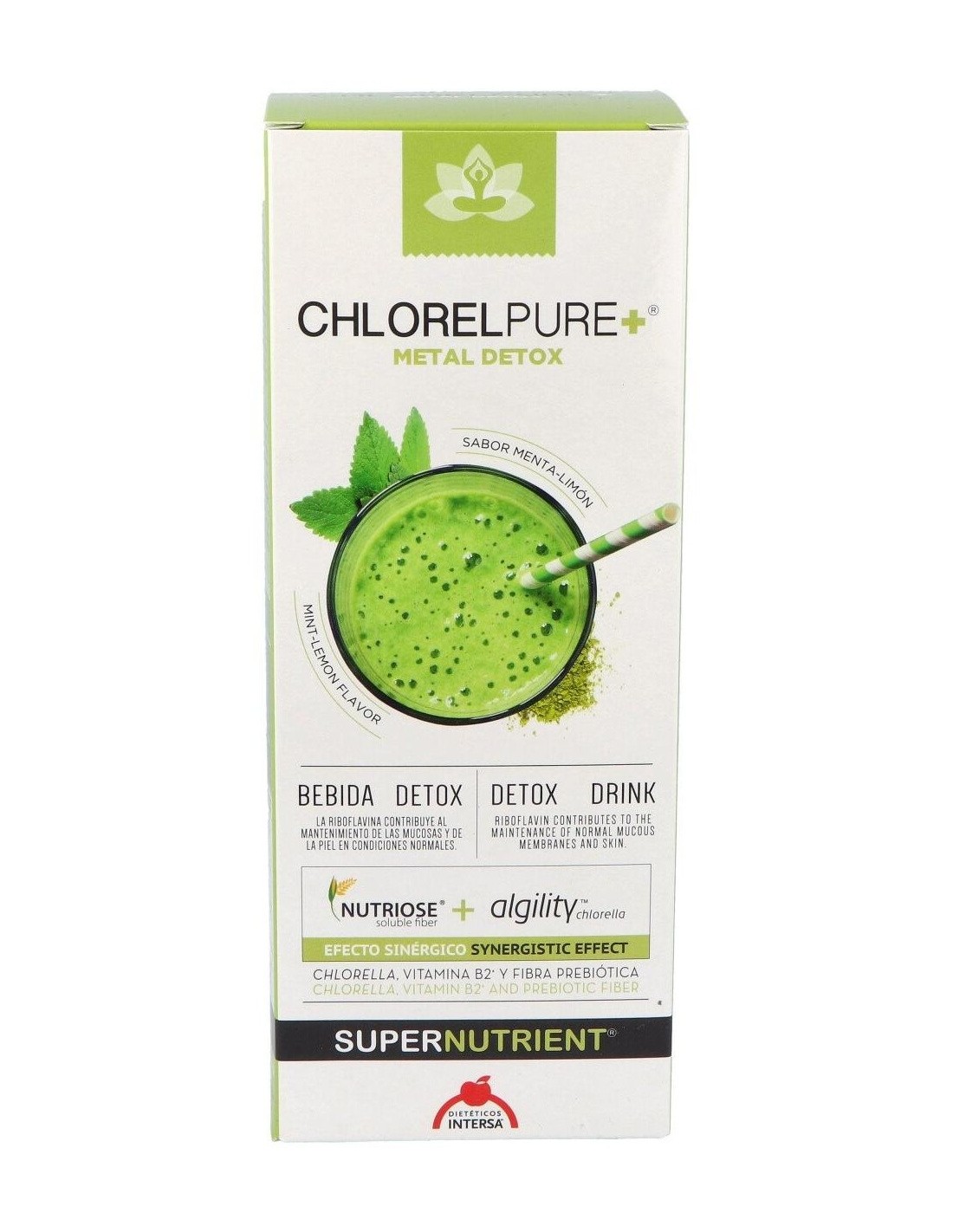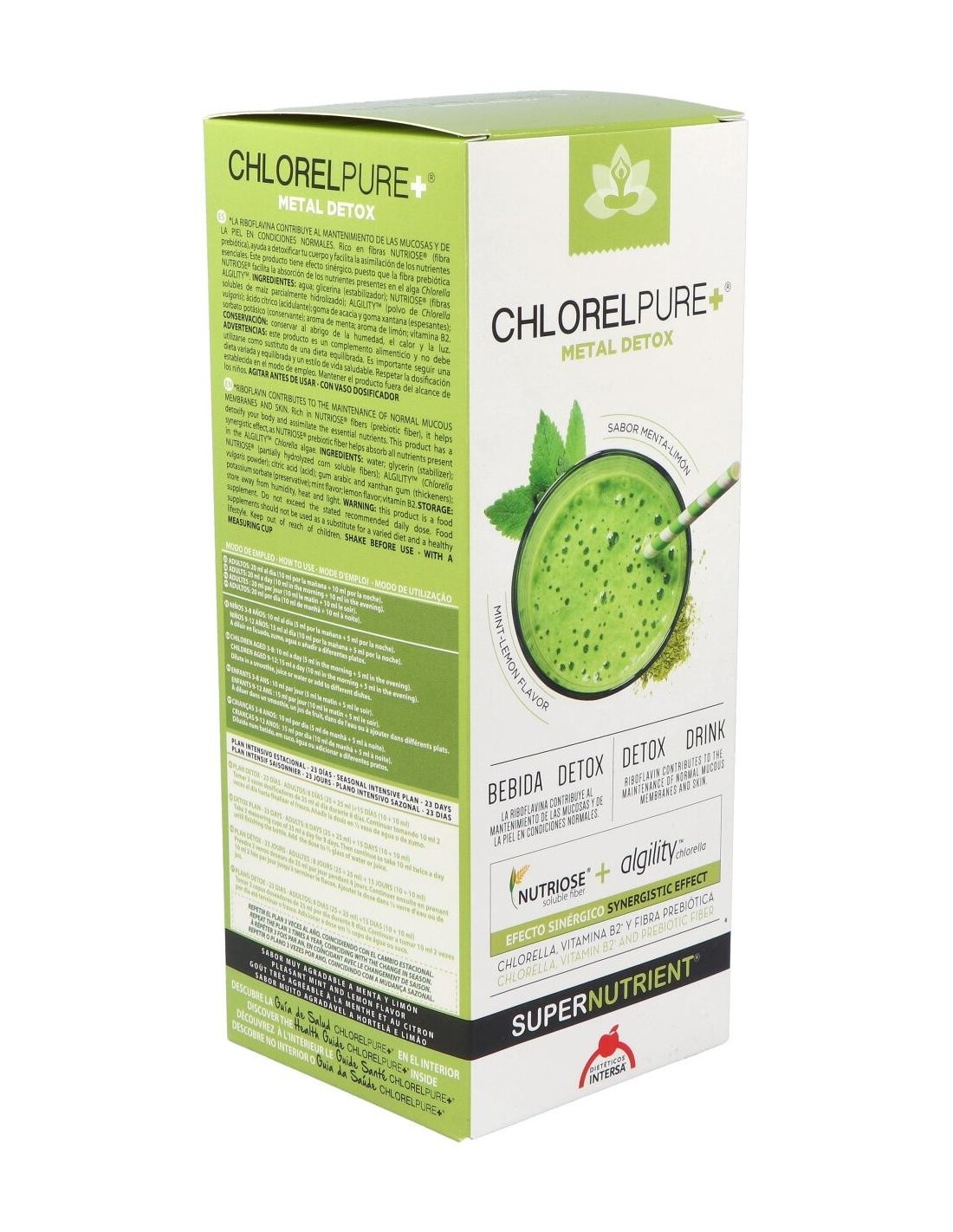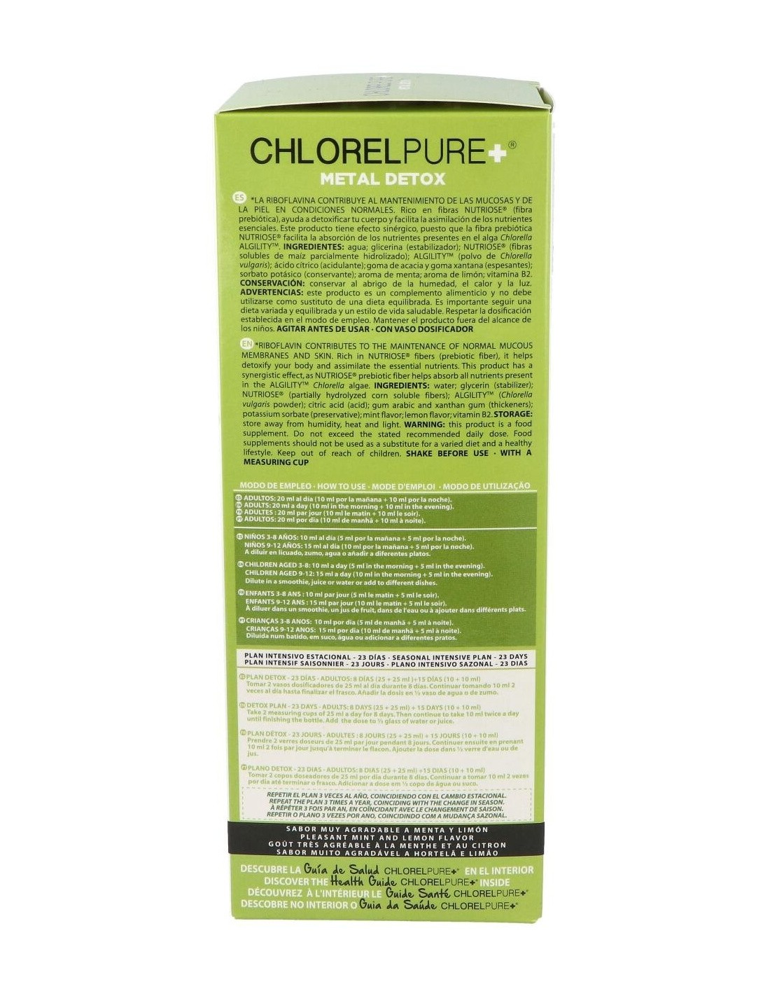 Por otro lado, a estos efectos se suman beneficios para el estado de salud general, como el aumento del status antioxidante, la mejora de las condiciones de la piel, el aumento de defensas y vitalidad general.Chlorelpure+®, puede ayudar a mejorar también, la función cognitiva en pacientes con depresión, aliviar los síntomas de la fibromialgia y resulta un complemento ideal durante el embarazo y la lactancia; para enriquecer en carotenoides y nutrientes (ácido fólico, vitamina B12...) la leche materna y disminuir la transferencia de metales pesados de la madre al feto. Chlorelpure+®, puede ayudar también en el control de peso, gracias a su bajo índice glucémico y a que proporciona una liberación prolongada de energía. Ingredientes:Agua; glicerina (estabilizador); Nutriose® (fibras solubles de maíz parcialmente hidrolizado); polvo de Chlorella vulgaris; ácido cítrico (acidulante); goma de acacia y goma xantana (espesantes); sorbato potásico (conservante); aroma de menta; aroma de limón; vitamina B2.Modo de empleo:A diluir en licuado, zumo, agua o añadir en diferentes platos.