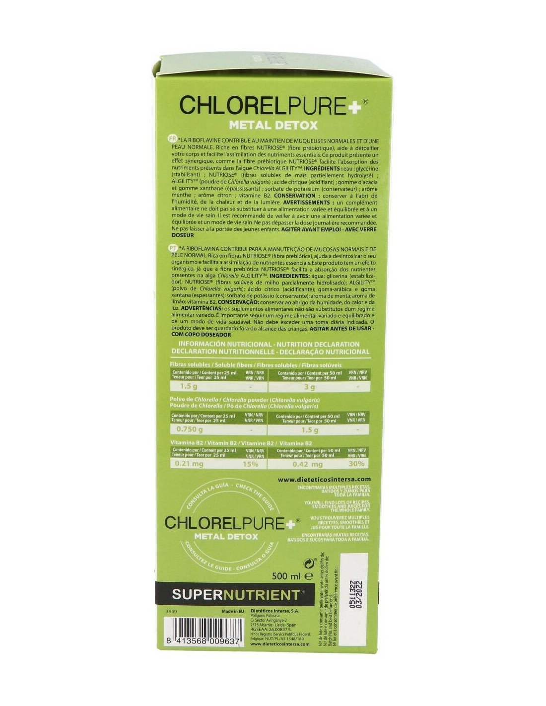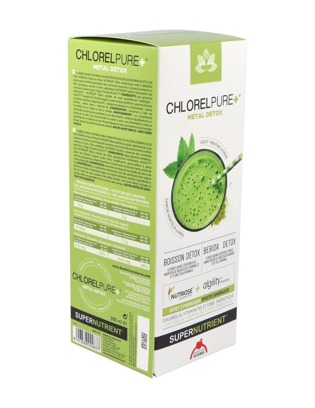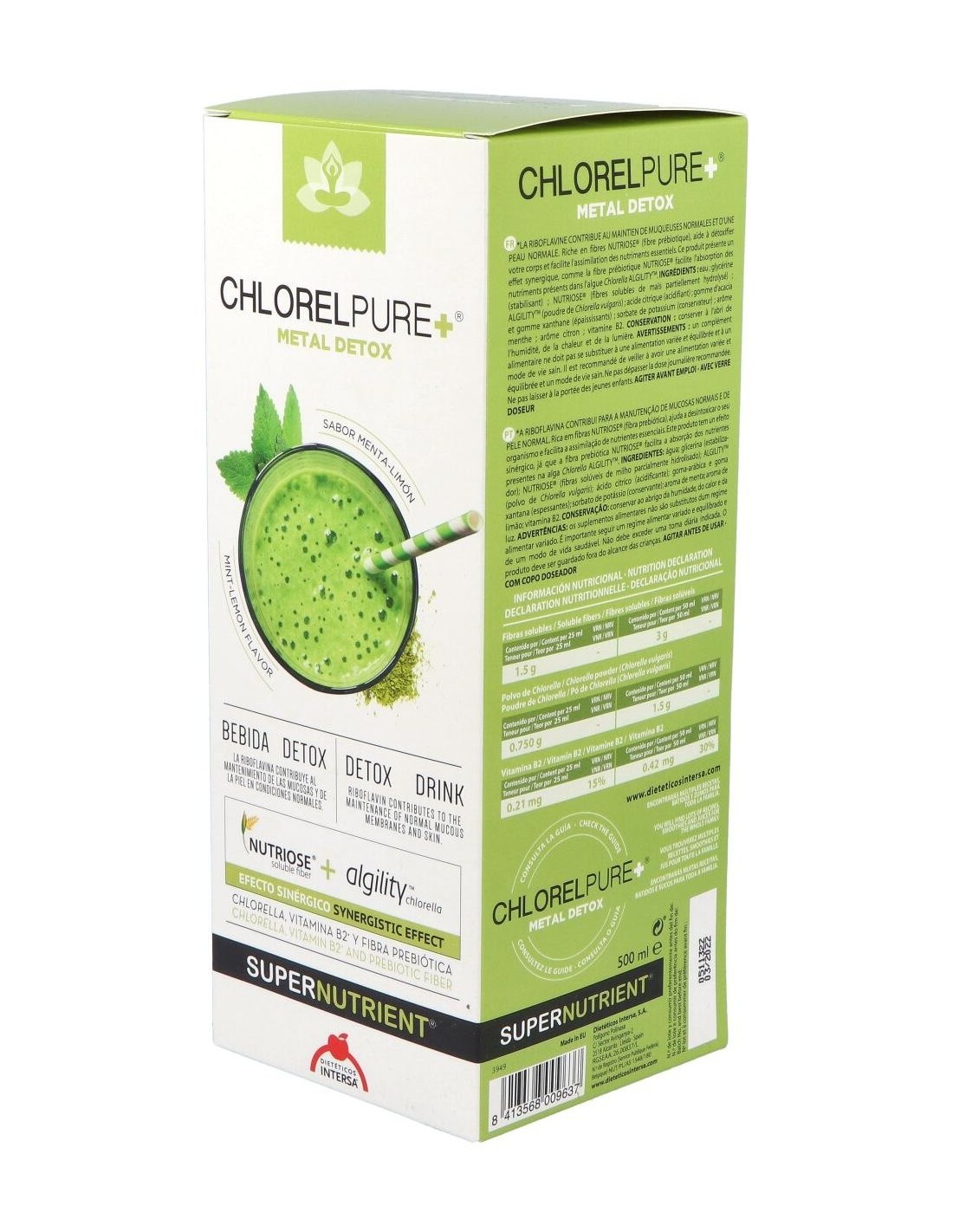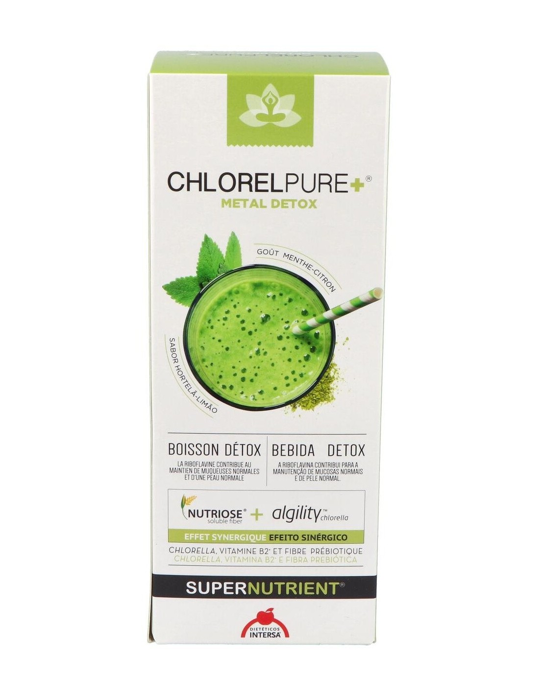 Por otro lado, a estos efectos se suman beneficios para el estado de salud general, como el aumento del status antioxidante, la mejora de las condiciones de la piel, el aumento de defensas y vitalidad general.Chlorelpure+®, puede ayudar a mejorar también, la función cognitiva en pacientes con depresión, aliviar los síntomas de la fibromialgia y resulta un complemento ideal durante el embarazo y la lactancia; para enriquecer en carotenoides y nutrientes (ácido fólico, vitamina B12...) la leche materna y disminuir la transferencia de metales pesados de la madre al feto. Chlorelpure+®, puede ayudar también en el control de peso, gracias a su bajo índice glucémico y a que proporciona una liberación prolongada de energía. Ingredientes:Agua; glicerina (estabilizador); Nutriose® (fibras solubles de maíz parcialmente hidrolizado); polvo de Chlorella vulgaris; ácido cítrico (acidulante); goma de acacia y goma xantana (espesantes); sorbato potásico (conservante); aroma de menta; aroma de limón; vitamina B2.Modo de empleo:A diluir en licuado, zumo, agua o añadir en diferentes platos.