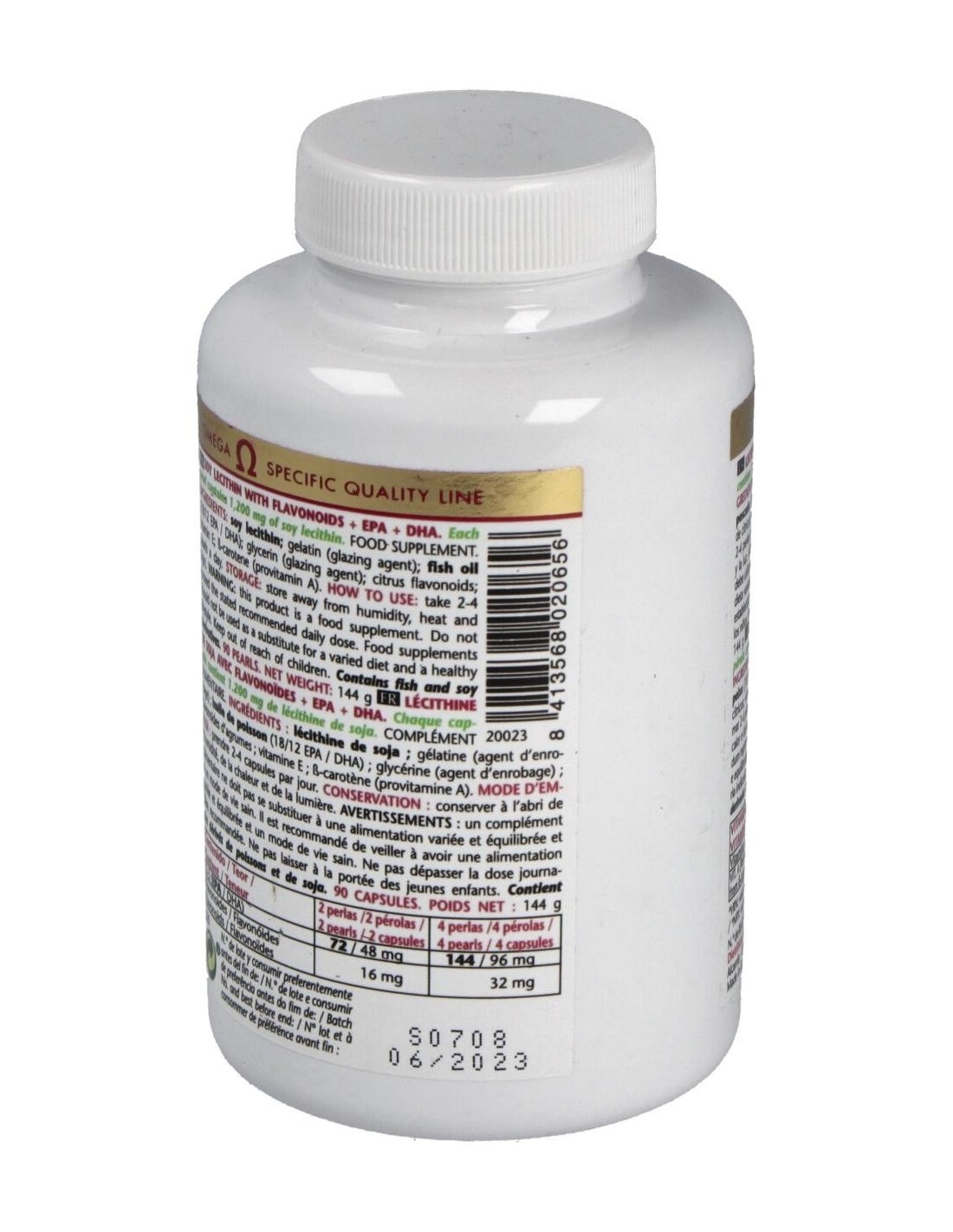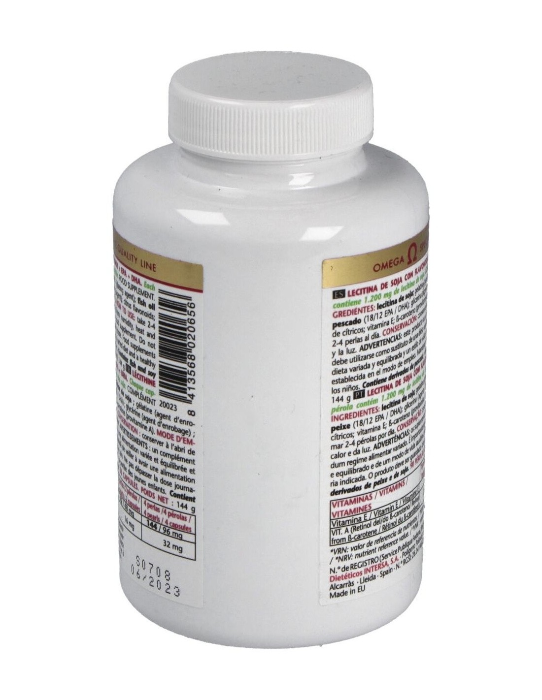 Aceite de Pescado (250 mg), DHA (Ácido Docosahexaenoico) (18 %), EPA (Ácido Eicosapentaenoico) (12 %), Vitamina E / Tocoferol, Bioflavonoides, Betacaroteno (pro-vitamina A), Glicerina (Glicerol), Lecitina de soja, Lecitina de soja con flavonoides.