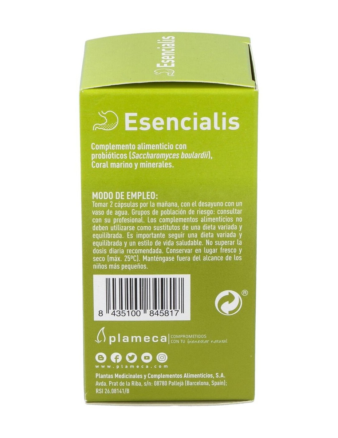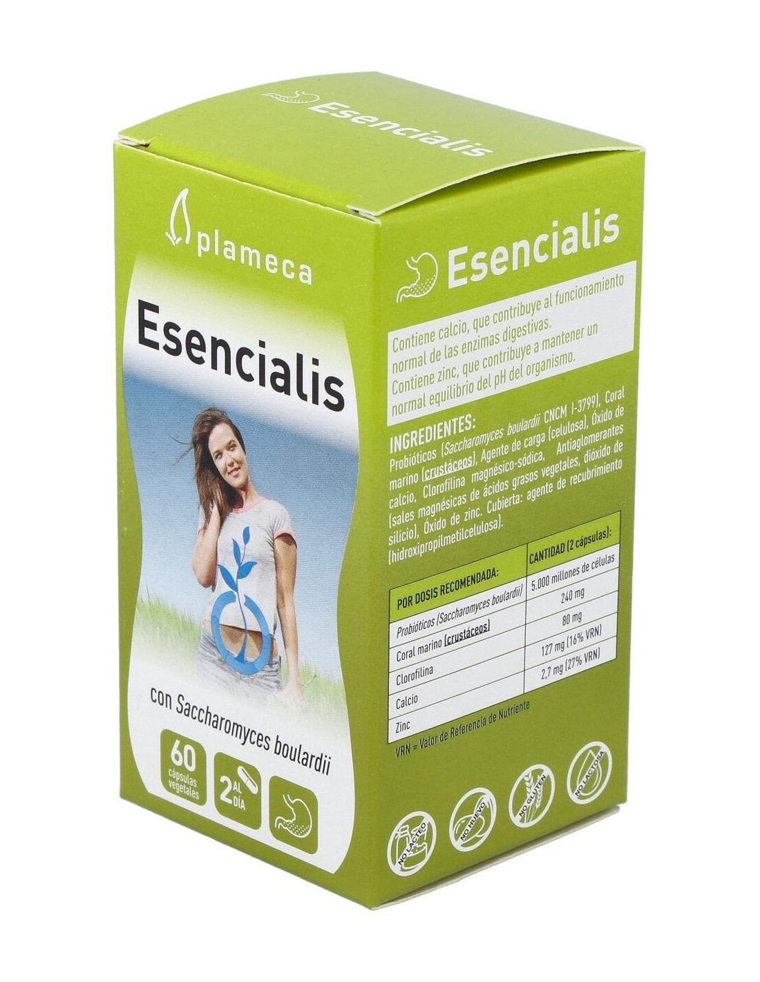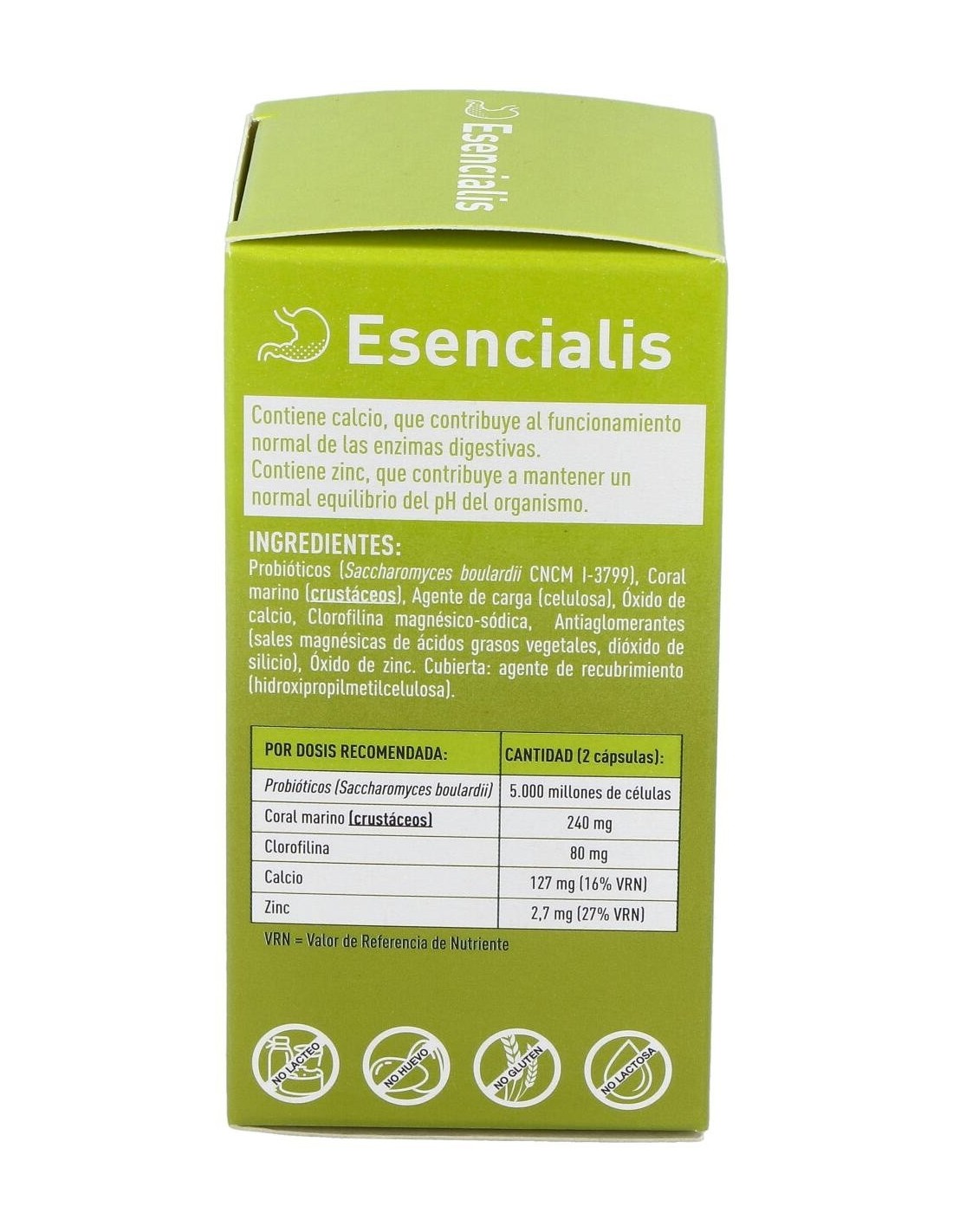 Esencialis es un probiótico reparador intestinal de fórmula novedosa, que cuenta con las ventajas de un probiótico como es el Saccharomyces boulardii, reforzado con la Clorofilina que actúa como detoxificante y reparador de la barrera intestinal y con coral marino como alcalinizante.