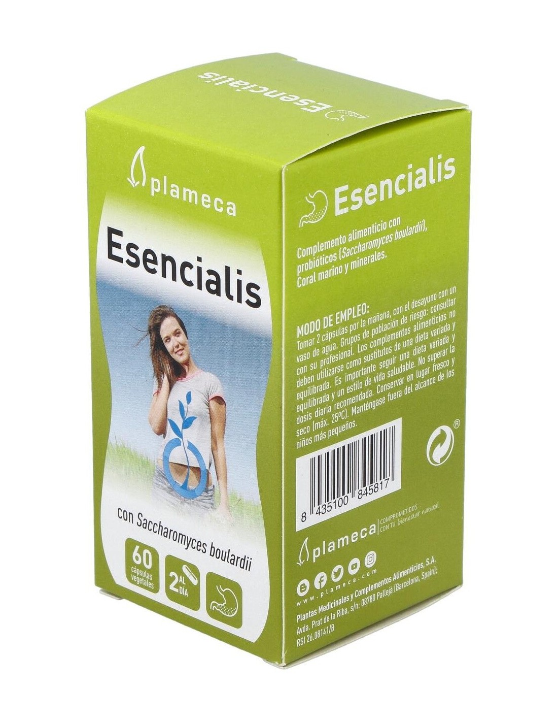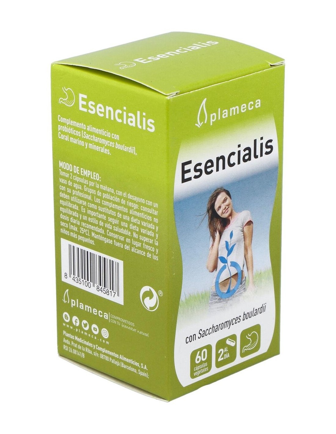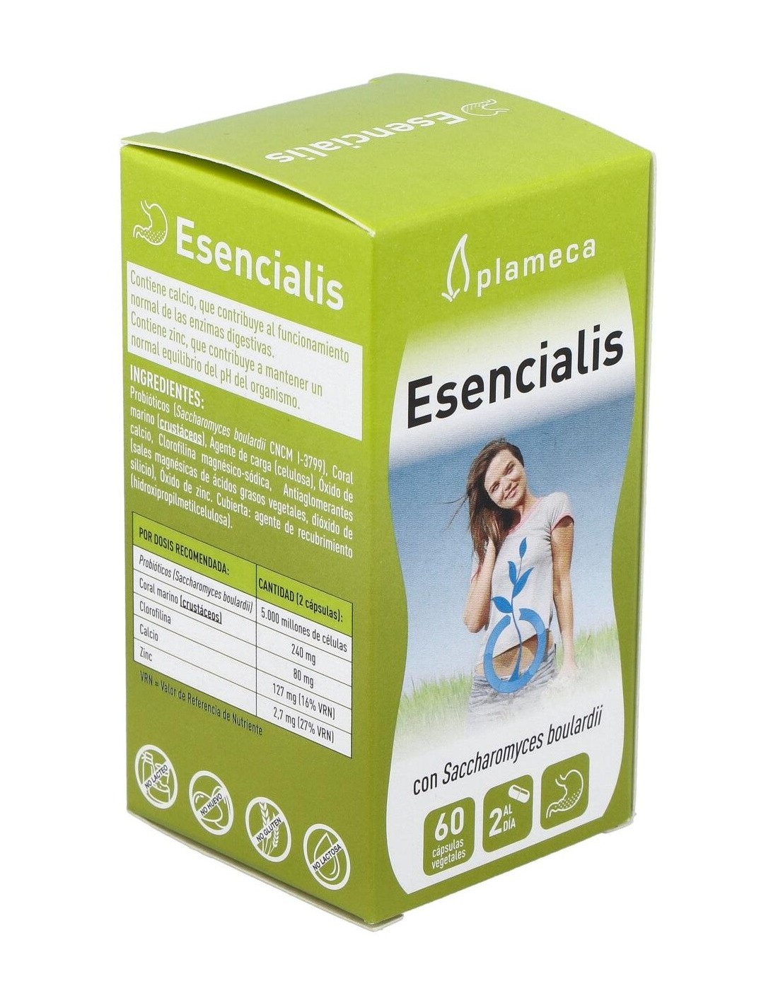 Esencialis es un probiótico reparador intestinal de fórmula novedosa, que cuenta con las ventajas de un probiótico como es el Saccharomyces boulardii, reforzado con la Clorofilina que actúa como detoxificante y reparador de la barrera intestinal y con coral marino como alcalinizante.