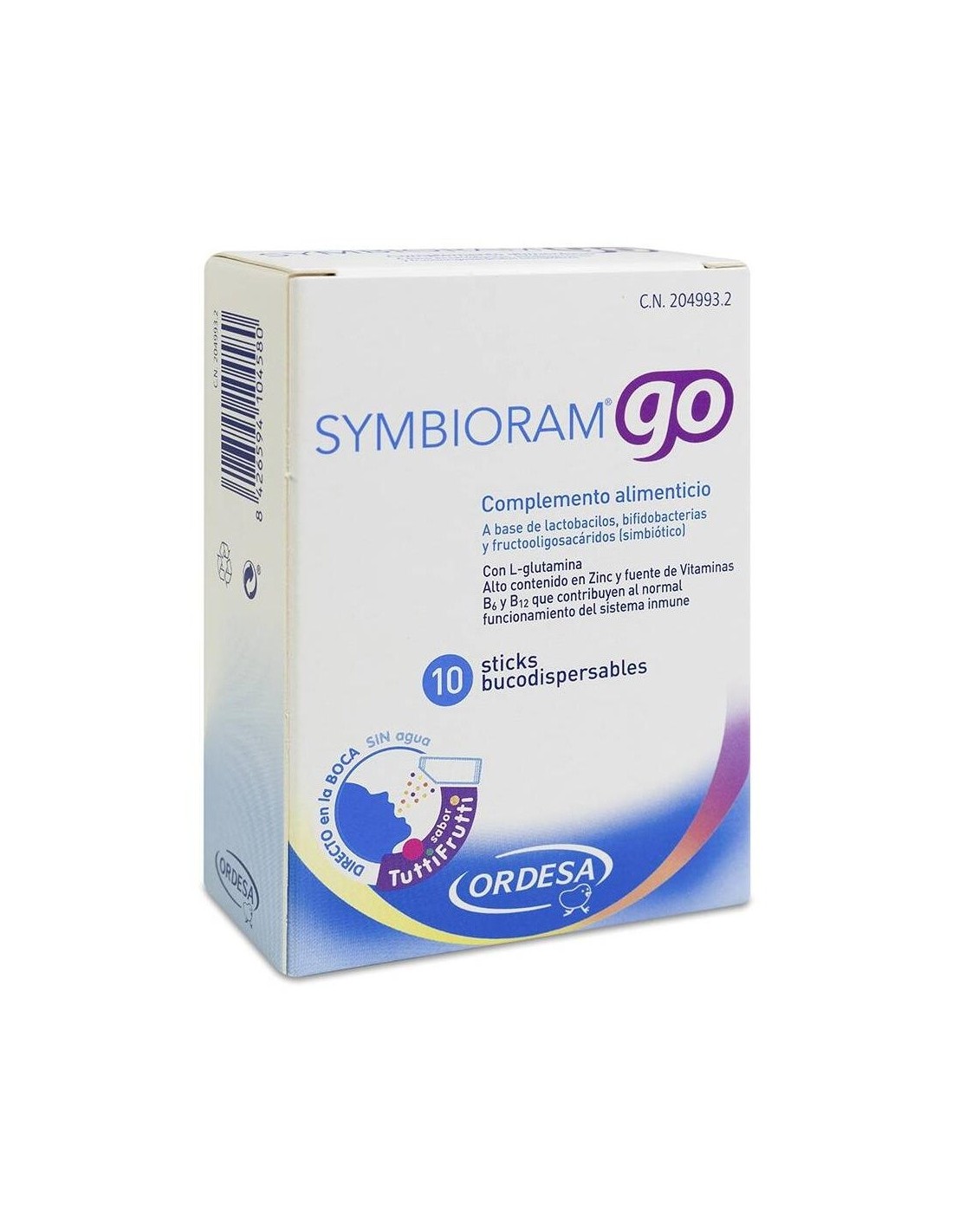 10 sticks bucodispersables con efecto simbiótico que combinan lactobacilos y bifidobacterias probióticos con fructooligosacáridos prebióticos. La fórmula se completa con vitaminas y minerales: La vitamina B2 y la niacina contribuyen al mantenimiento de las mucosas en condiciones normales (entre ellas la mucosa intestinal). El zinc y las vitaminas B6 y B12, contribuyen al normal mantenimiento del sistema inmune. Formato para llevar a cualquier parte. Se toma diretamente sin necesidad de agua. Con sbaor a tutti frutti.