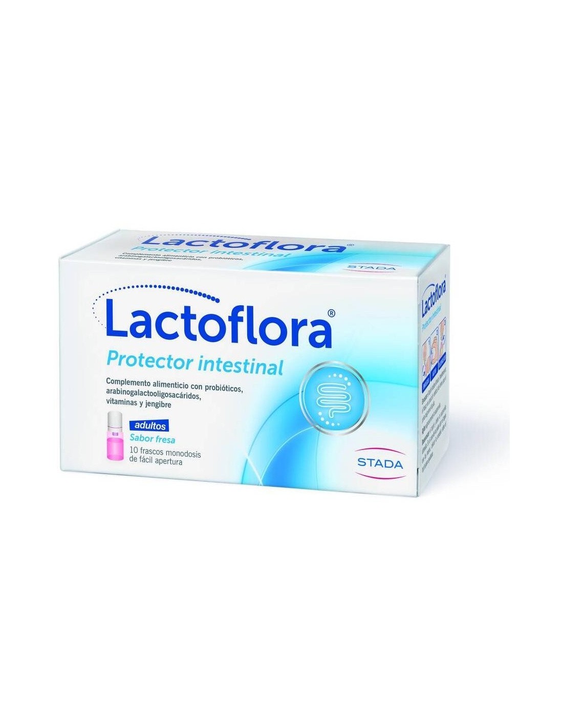 Lactoflora Probiótico Protector Intestinal para Adultos 10 frascos es un suplemento formulado con lactobacilos y bifidobacterias, fibra prebiótica, vitaminas del grupo B y aloe vera. Ayuda a mejorar la función intestinal y la salud gastrointestinal.