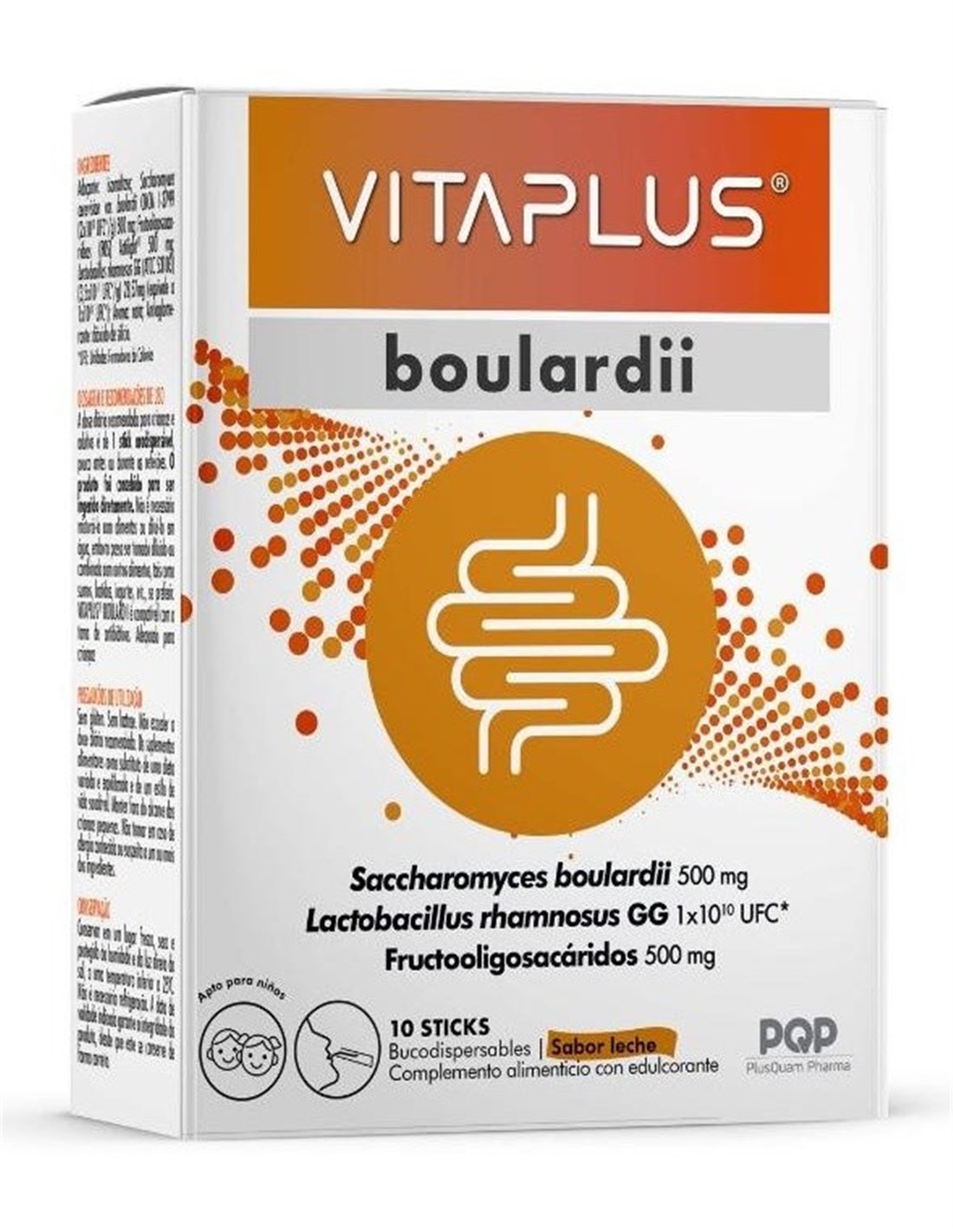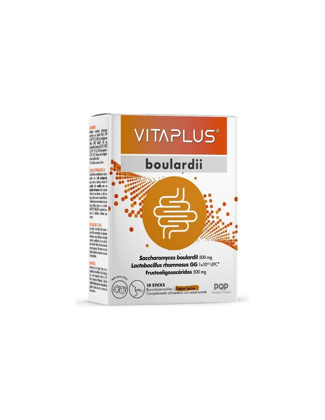 Vitaplus® Boulardii combina 500 mg de una levadura probiótica denominada Saccharomyces boulardii CNCM I-3799, con 1x10(10) de la bacteria láctica Lactobacillus rhamnosus GG (ATCC 53103) y 500 mg de fructooligosacáridos (FOS-Actilight®). Saccharomyces boulardii y Lactobacillus rhamnosus GG son las 2 cepas probióticas más estudiadas y con mayor evidencia según las guías internacionales ESPGHAN y WGO, y se consideran de utilidad en caso de diarrea. VitaPLUS® Boulardii no contiene gluten ni lactosa, es apto para vegetarianos. Apto para embarazadas y compatible con la lactancia. Es compatible con la toma de antibióticos. Puede administrarse a niños a partir de los 3 años de edad.