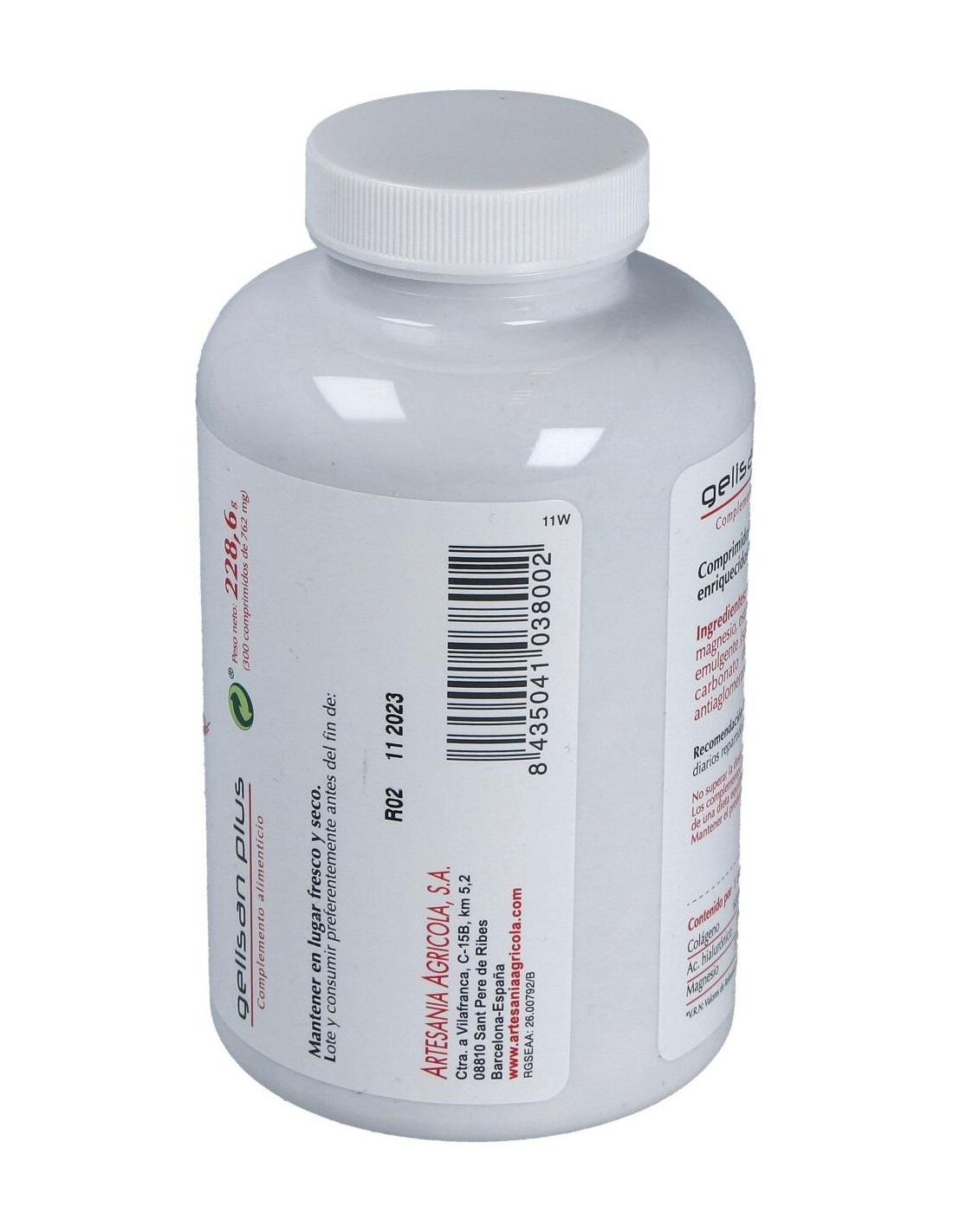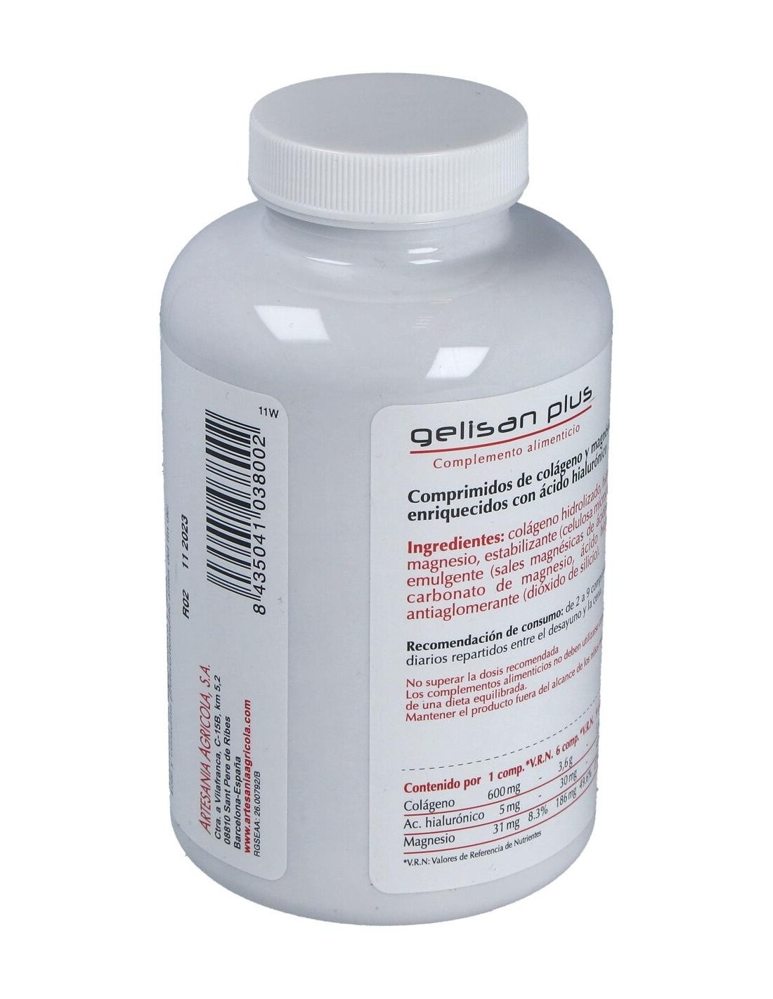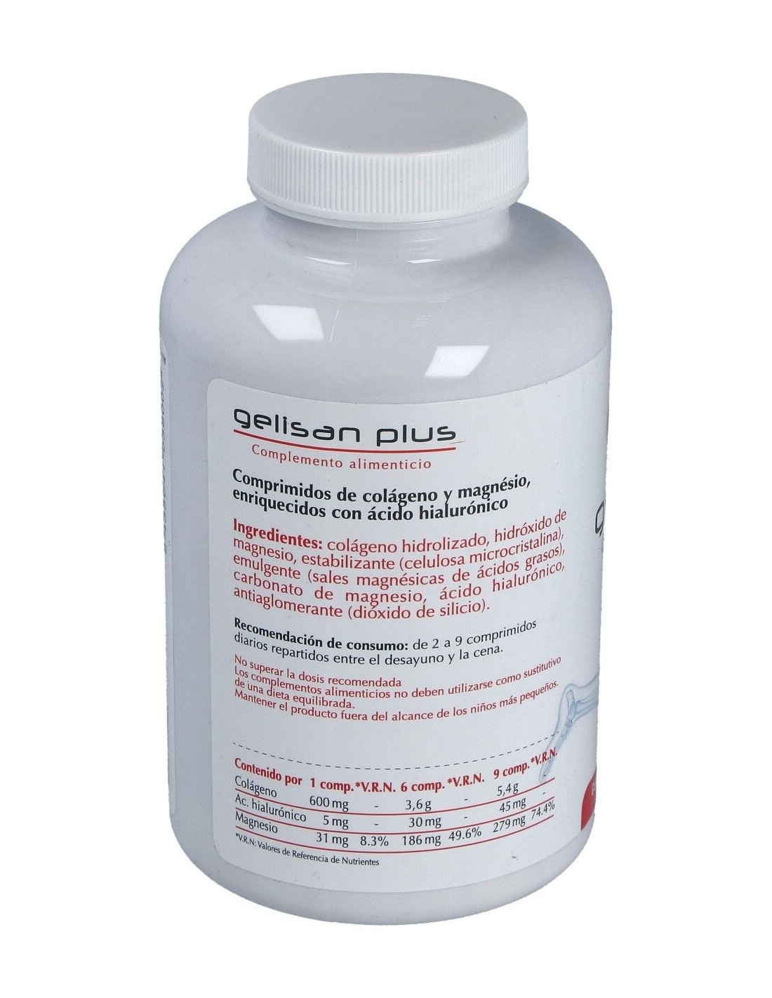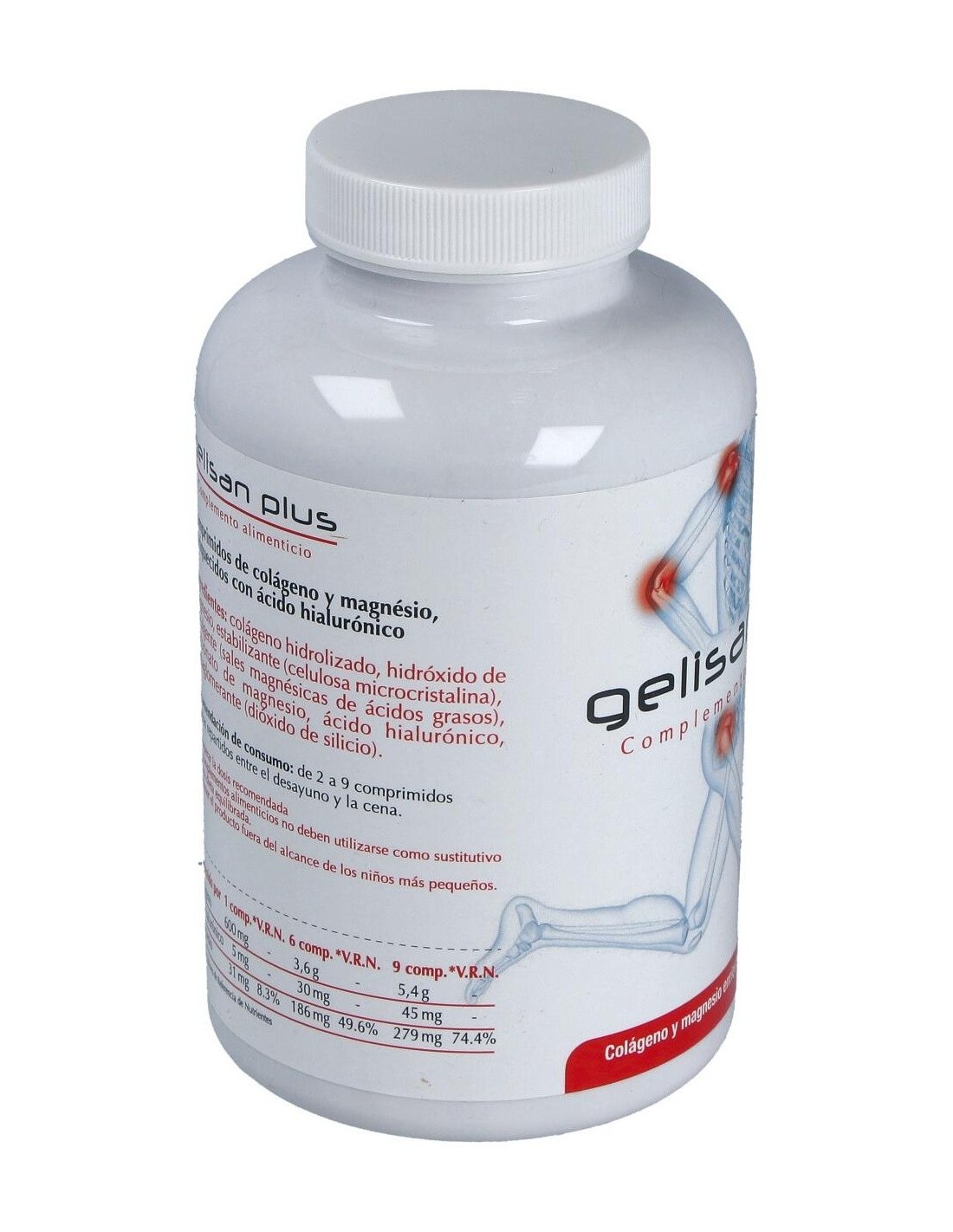 El colágeno de Gelisan Plus comprimidos proviene de proteína hidrolizada de origen natural. Se caracteriza por un elevado contenido en prolina e hidroxiprolina (11.9%) aminoácidos fundamentales para la normal formación y mantenimiento del cartílago y por contener también un 22.6% de glicina, aminoácido que junto a otros es un componente principal de numerosos tejidos.El colágeno se considera la proteína anti-envejecimiento, su ingesta contribuye a nutrir y proteger los tejidos colagénicos, especialmente, articulaciones, huesos y piel.El magnesio es el quinto mineral por su abundancia en el organismo y es imprescindible para la correcta asimilación del calcio y de la vitamina C, para activar numerosas enzimas y las vitaminas del grupo B. También interviene en la síntesis de las proteínas, en la excitabilidad de los músculos y en la liberación de la energía.El ácido hialurónico contiene un 90% de polisacáridos del tipo glycosaminglicanos (GAGs) y se caracteriza por su gran capacidad para retener agua. En nuestro organismo es un elemento natural del líquido sinovial y actúa en las articulaciones como lubrificante para los cartílagos y ligamentos, también actúa como protector frente a las fuerzas mecánicas.Composición activa por comprimido: