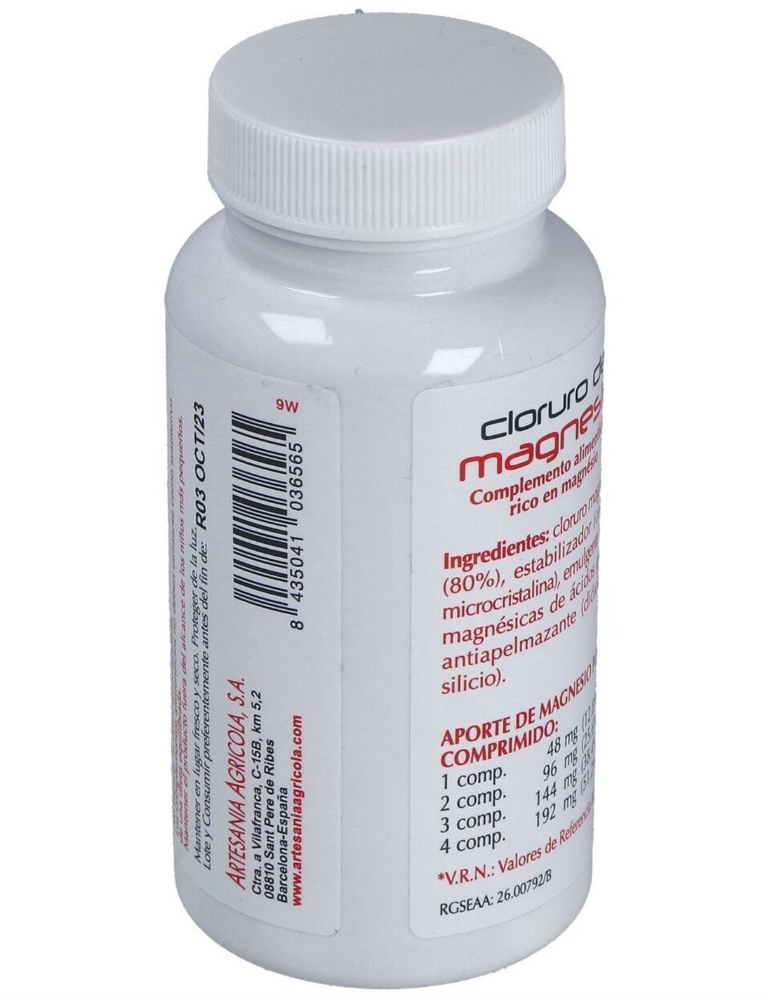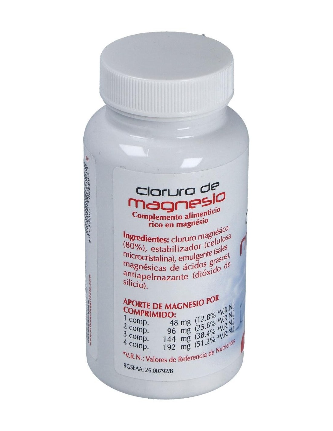 El magnesio es un elemento con mucha presencia en nuestro organismo y es indispensable para la correcta asimilación del calcio y la vitamina C; también es necesario para activar numerosas enzimas y vitaminas del grupo B.El magnesio interviene en la síntesis de las proteínas, en la excitabilidad de los músculos y en la liberación de energía. El magnesio equilibra el sistema nervioso central (acción sedante), aumenta la secreción de la bilis e interviene en la secreción y en la acción de la insulina.El magnesio es necesario y su déficit puede provocar falta de memoria, dificultades para concentrarse y por tanto puede disminuir la capacidad de retención, también puede propiciar un estado de excitación que desemboca en situaciones de stress.Composición activa por comprimido:400 mg de cloruro magnésico (48 mg de magnesio).Ingredientes:Cloruro magnésico (400 mg/comp.), estabilizador (celulosa microcristalina), emulgente (sales magnésicas de ácidos grasos), antiapelmazante (dióxido de silicio).Modo de empleo:Tomar de de 2 a 4 comprimidos diarios.Presentación:Envase de 100 comprimidos.