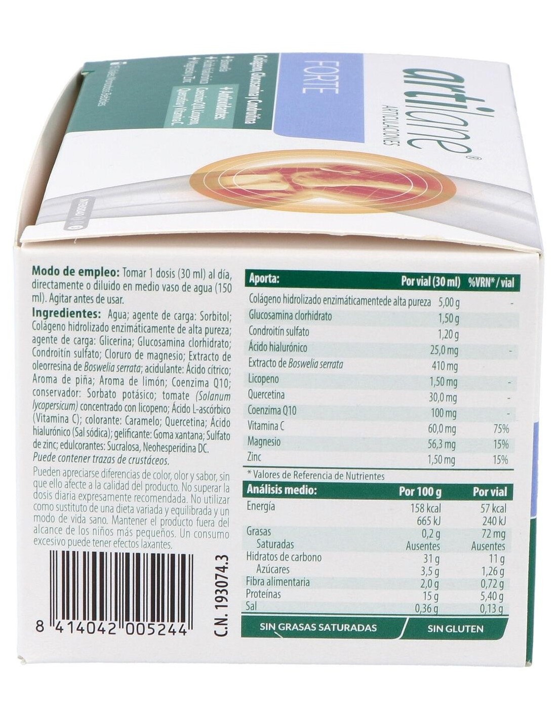 Artilane Forte contiene glucosamina, condroitina, colágeno hidrolizado enzimáticamente, ácido hialurónico, magnesio, zinc, boswelia y antioxidantes como Coenzima Q10, licopeno, quercetina y vitamina C.
