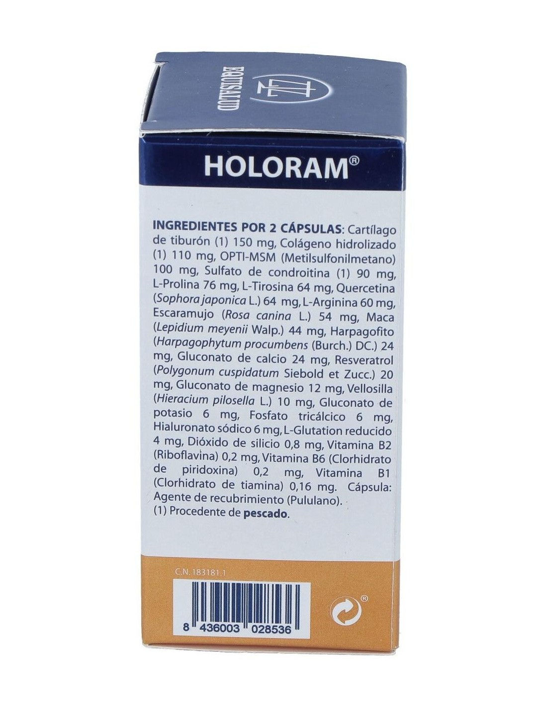 Grupo I. Sustrato activado de micronutrientes articulares: Cartílago de tiburón (8-12% glucosamina sulfato, 14-20% condroitín sulfato) 75 mg, Colágeno hidrolizado de pescado (PeptanTM F 5000 HD) 55 mg, OptiMSM (99.8% metilsulfonilmetano) 50 mg, Condroitín sulfato (tiburón, 90%) 45 mg, Hialuronato sódico 3 mg.
