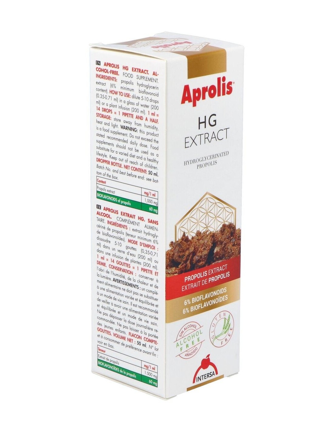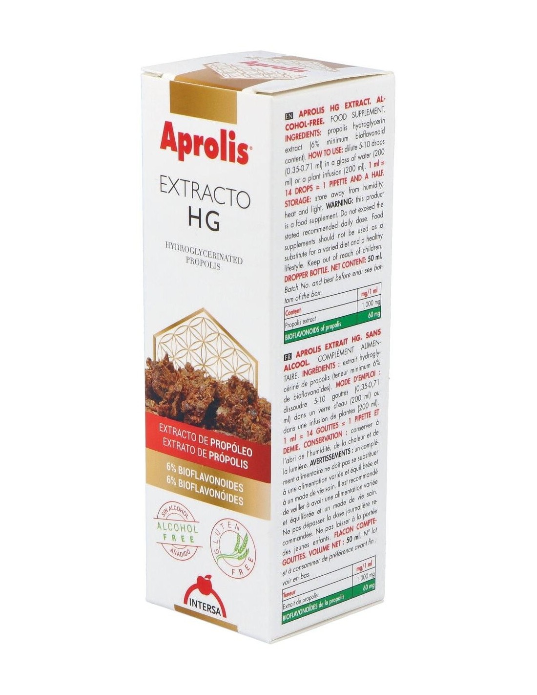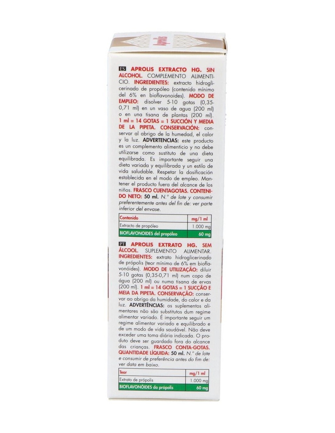 Línea de complementos alimenticios que contienen propóleo como ingrediente principal, asociado a micronutrientes (minerales y oligoelementos), fitoterapia tradicional y otros productos derivados de la colmena, como el polen y la jalea real. El propóleo utilizado es propóleo purificado pero no descerado, para de esta forma, no eliminar una parte importante de su acción biológica. El propóleo o própolis designa algunas sustancias gomosas y resinosas que, segregadas por la corteza y yemas de algunas plantas, son procesadas con secreciones glandulares de las abejas hasta conseguir el producto final conocido como propóleo. Va a ser utilizado para diferentes necesidades de la colmena, tales como pegar fuertemente las partes móviles o rompibles que puedan caer, o evitar posibles infecciones en la colmena, constituyendo de esta manera, una especie de barrera antiinfecciosa en la entrada de la colmena. Ingredientes:Extracto hidroglicerinado de propóleo (contenido mínimo del 6% en bioflavonoides).Composición activa por 1 ml:
