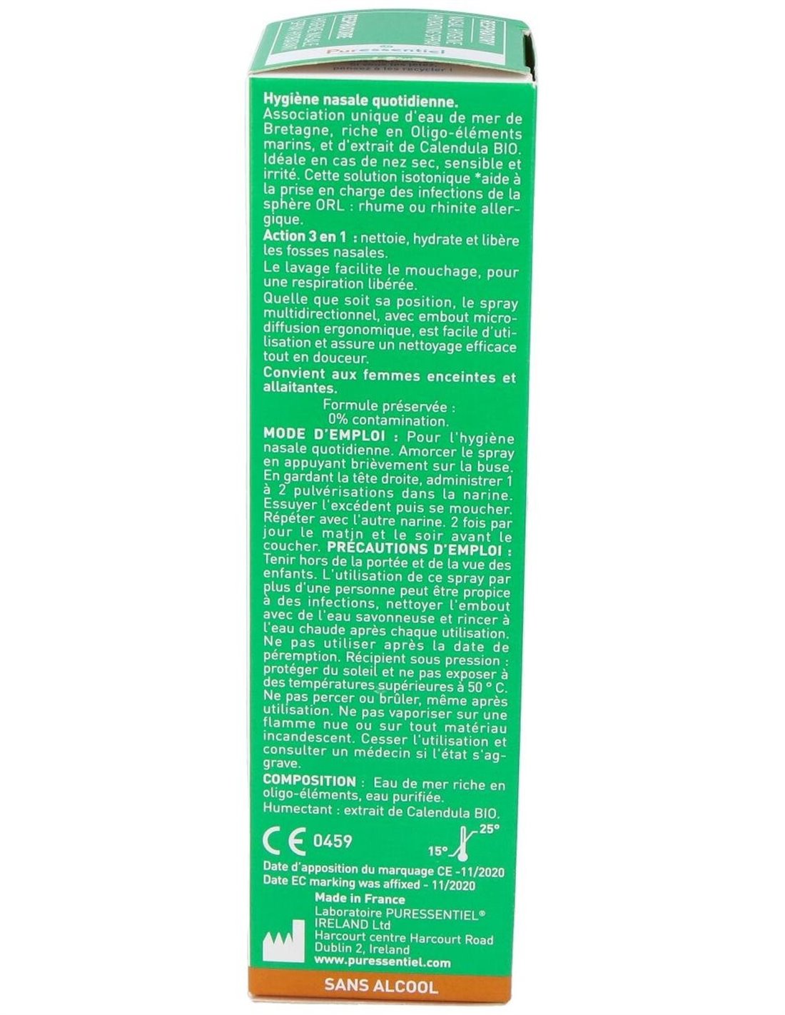 Fórmula isotónica para la higiene nasal 100% de origen natural. Con extracto de caléndula que calma y protege y agua de mar de Bretaña 100% pura y natural, que limpia, hidrata y purifica. 0% gas propulsor, alcohol y conservantes.