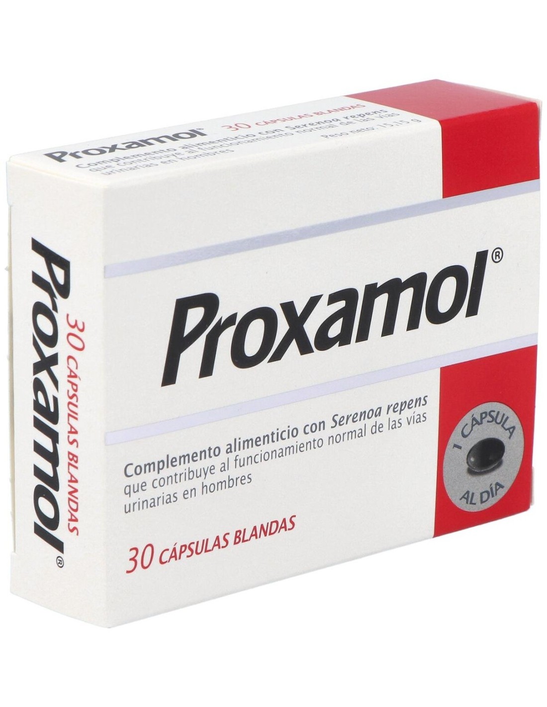 Proxamol 30 Cápsulas complemento alimenticio en forma de cápsulas con extracto lipídico del fruto de Serenoa Repens que colabora en el buen funcionamiento urinario de los hombres.
