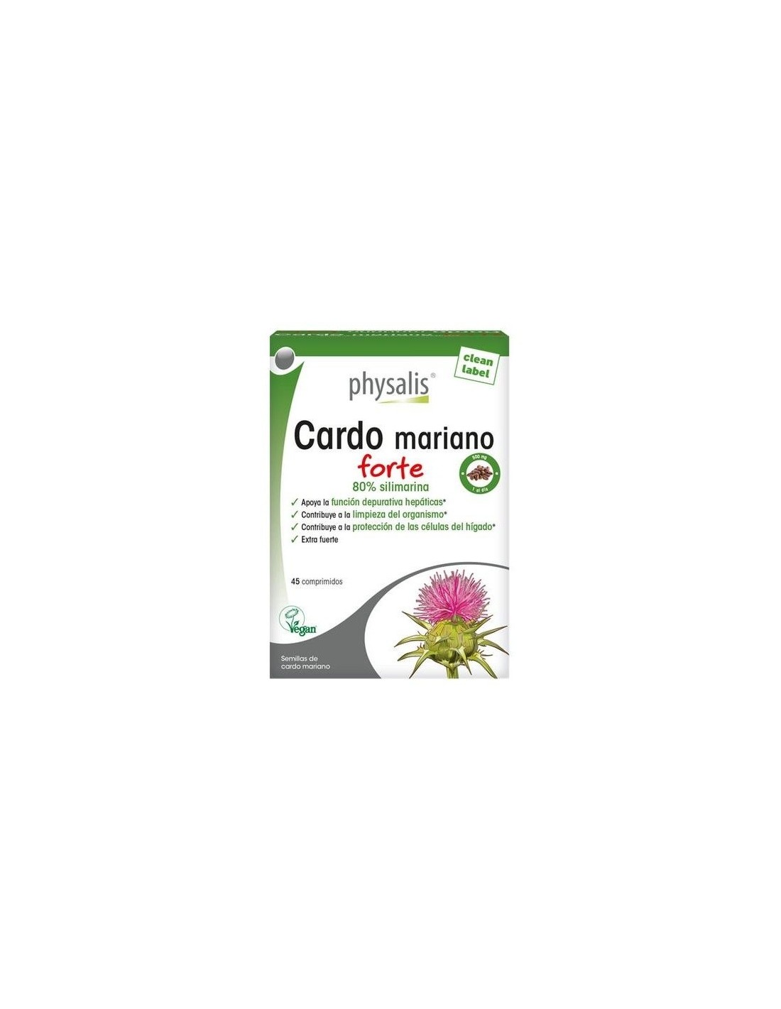 Physalis Cardo Mariano forte contiene 500 mg de extracto superior de cardo mariano, estandarizado a 80% de silimarina. El cardo Mariano que apoya la función depurativa y desintoxicante del hígado, está indicado particularmente para acompañar una dieta de depuración.