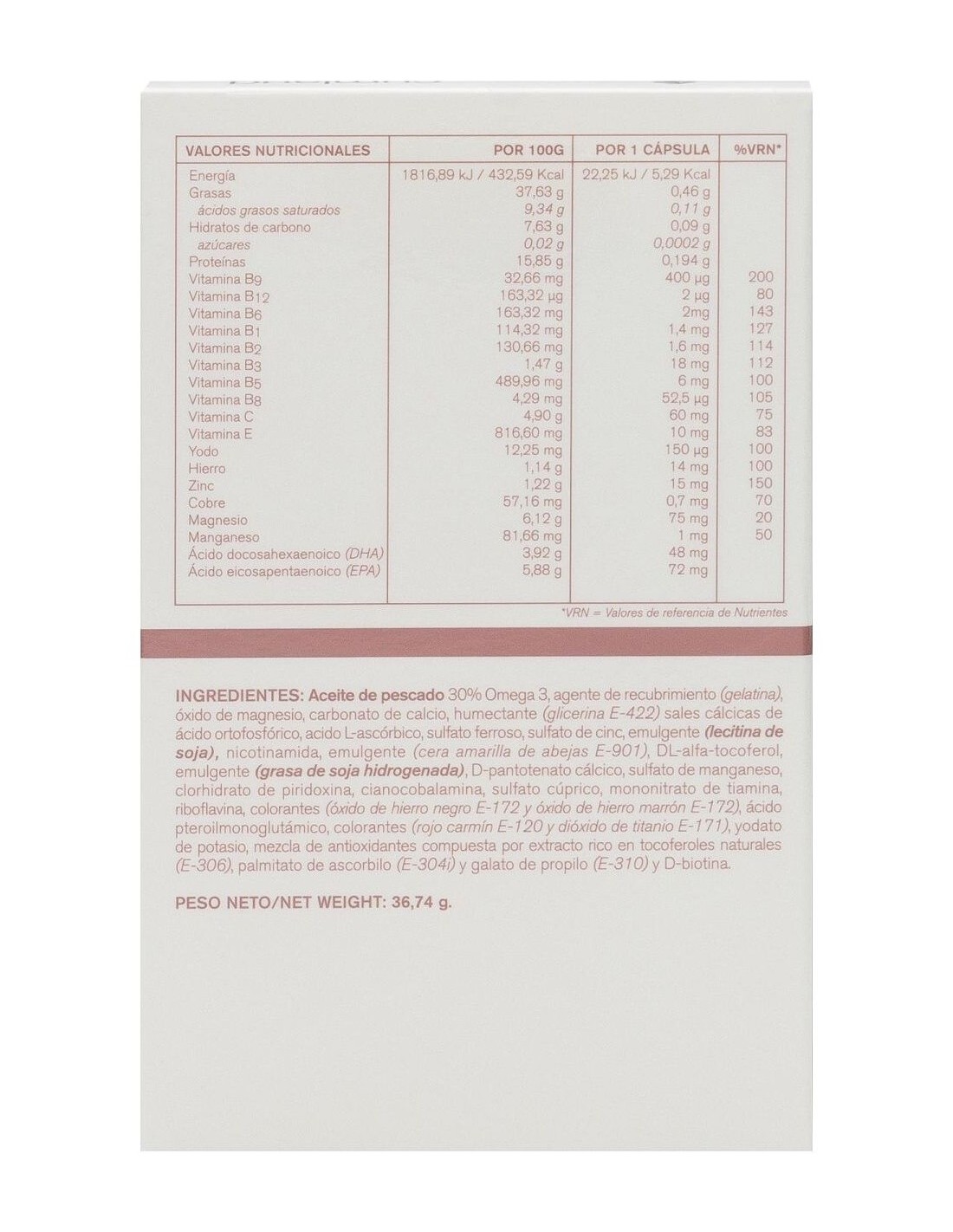 Aceite de pescado 30% Omega 3, agente de recubrimiento (gelatina), óxido de magnesio, carbonato de calcio, humectante (glicerina E-422) sales cálcicas de ácido ortofosfórico, acido L-ascórbico, sulfato ferroso, sulfato de cinc, emulgente (lecitina de soja), nicotinamida, emulgente (cera amarilla de abejas E-901), DL-alfa tocoferol, emulgente (grasa de soja hidrogenada), D-pantotenato cálcico, sulfato de manganeso, clorhidrato de piridoxina, cianocobalamina, sulfato cúprico, mononitrato de tiamina, riboflavina, colorantes (óxido de hierro negro E-172 y óxido de hierro marrón E-172), ácido pteroilmonoglutámico, colorantes (rojo carmín E-120 y dióxido de titanio E-171), yodato de potasio, mezcla de antioxidantes compuesta por extracto rico en tocoferoles naturales (E-306), palmitato de ascorbilo (E-304i) y galato de propilo (E-310) y D-biotina.