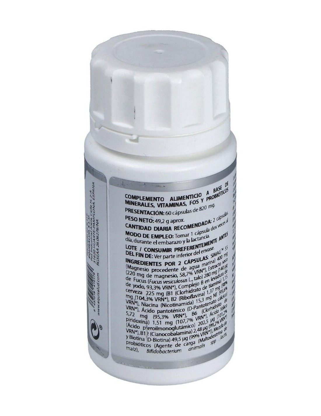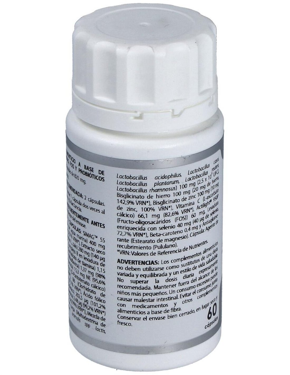 SIMAGTM 55 (magnesio procedente de agua marina, =55% magnesio), 200 mg; fucus extracto seco (Fucus vesiculosus L., talo, 0,05% yodo), 140 mg; complejo de vitaminas B (B1 (tiamina clorhidrato) 51.000 ppm, B2 (riboflavina) 6.100 ppm, niacina (nicotinamida) 68.000 ppm, B5 (D-pantotenato cálcico) 25.400 ppm, B6 (piridoxina clorhidrato) 6.700 ppm, D-biotina 220 ppm, ácido fólico 900 ppm, B12 (cianocobalamina) 11 ppm) en levadura de cerveza, 112,5 mg; mezcla de probióticos Lactagest* (2,5×1010 UFC/g), 50 mg; bisglicinato de hierro (20-23% hierro), 50 mg; bisglicinato de zinc (10% zinc), 50 mg; L-ascorbato cálcico (82,64% vitamina C), 40 mg; Actilight® 950P (Fructo-oligosacáridos (FOS)), 30 mg; levadura enriquecida con selenio (1.000 ppm selenio), 20 mg; beta-caroteno 10%, 2 mg.