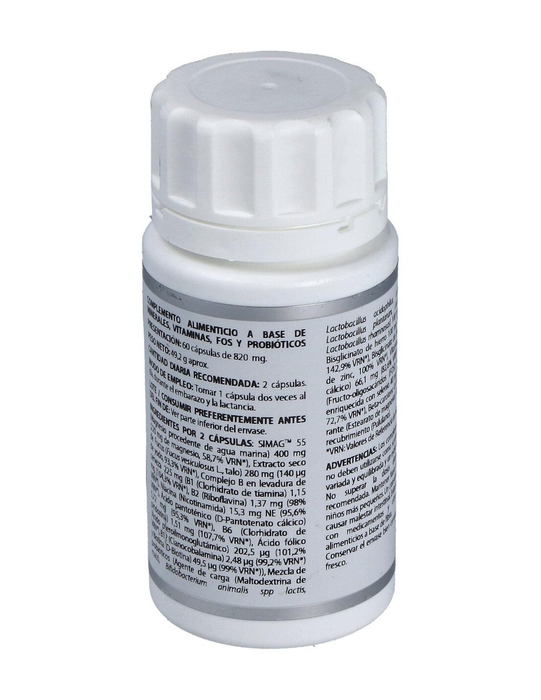 Cápsulas formuladas con vitaminas, minerales y probióticos recomendadas para mujeres durante el embarazo o la lactancia que favorecen el correcto desarrollo del feto y la salud de la madre durante la gestación.