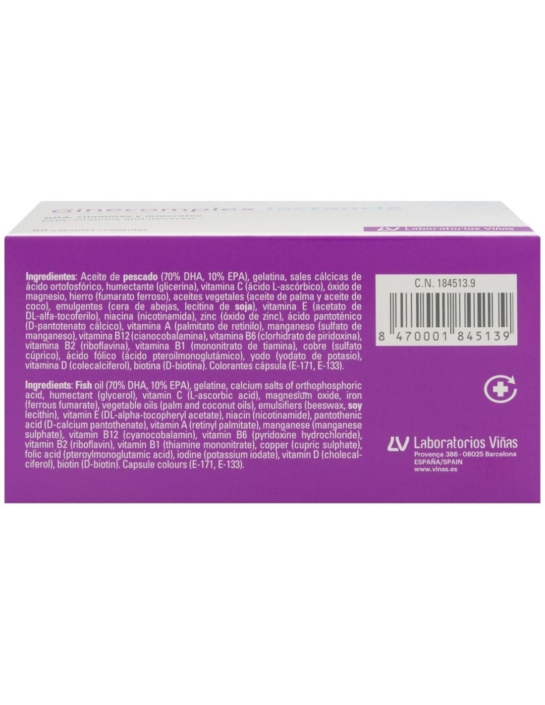 Ginecomplex lactancia es una combinación completa y equilibrada de ácidos grasos omega-3, oligoelementos, vitaminas y minerales que contribuye a cubrir el aumento de necesidades nutricionales durante la etapa de lactancia.\ Ginecomplex lactancia contiene DHA (ácido docosahexaenoico), ácido graso omega-3 que contribuye a mantener el funcionamiento normal del cerebro y la visión, además de oligoelementos esenciales: el zinc contribuye al proceso de división celular y al funcionamiento normal del sistema inmunitario; el hierro ayuda a la formación normal de glóbulos rojos y de hemoglobina y al transporte normal de oxígeno en el cuerpo; el yodo, que desempeña un papel en la función cognitiva normal y el funcionamiento normal del sistema nervioso. Otros minerales como el cobre y el manganeso están también presentes en Ginecomplex lactancia.\ Ginecomplex lactancia también contiene vitaminas: el ácido fólico contribuye al crecimiento de los tejidos maternos durante el embarazo y al proceso de división celular; la vitamina A ayuda al mantenimiento de las visión en condiciones normales y al funcionamiento normal del sistema inmunitario; las vitaminas B1,B2, B3, B6, B8 y B12 contribuyen al metabolismo energético normal y al funcionamiento normal del sistema nervioso; la vitamina E ayuda a la protección de las células frente al daño oxidativo; la vitamina C desempeña un papel en la formación normal de colágeno para el funcionamiento normal de los vasos sanguíneos, el funcionamiento normal del sistema nervioso y la protección de las células frente al daño oxidativo, y la vitamina D, que contribuye a la absorción y utilización normal del calcio y el fósforo, al mantenimiento de niveles normales de calcio en sangre, al mantenimiento de los huesos en condiciones normales y al proceso de división celular.