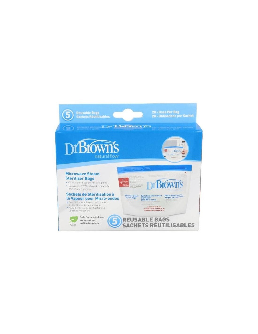 Bolsas para esterilizar en el microondas de forma rápida, fácil y segura los componentes de los biberones (biberones, tetinas y piezas de ventilación interna). También esteriliza chupetes y otros accesorios pequeños. Eliminan el 99,9 % de la mayoría de bacterias y gérmenes domésticos. Ideal para la esterilización fuera de casa o cuando se encuentre de viaje. Reutilizables: 20 usos por bolsa.