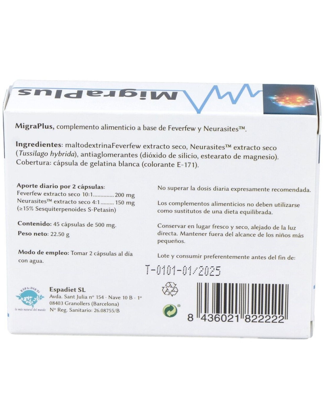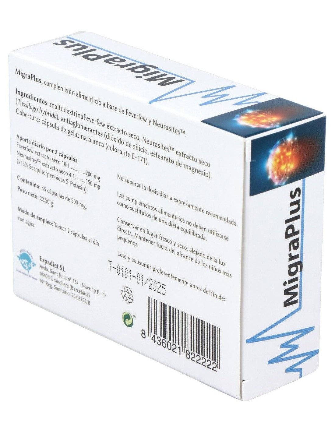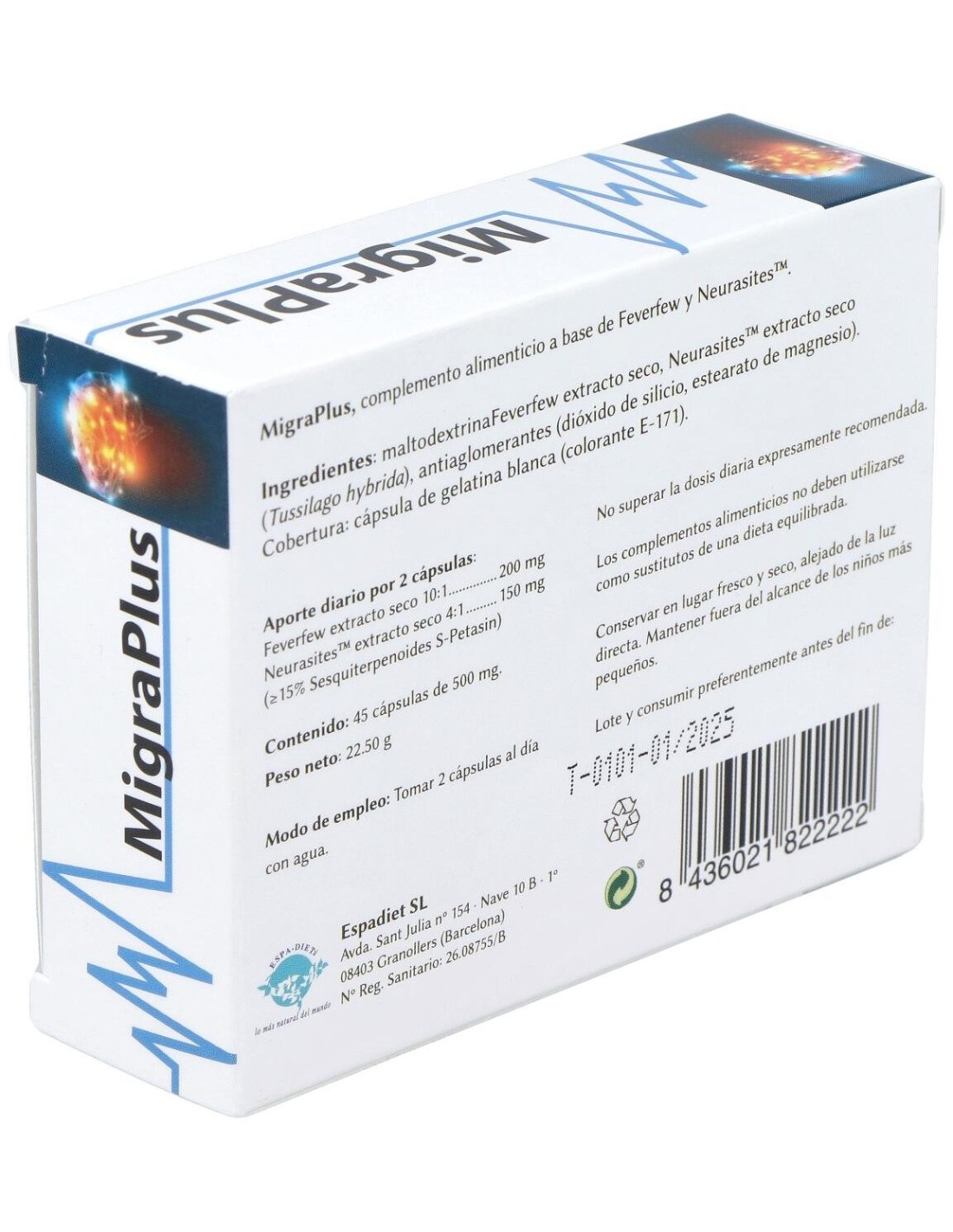 Migraplus 45Cap. de Espadiet es un complemento diseñado para personas que buscan apoyar su bienestar diario con una fórmula cuidadosamente elaborada. Este producto está indicado para quienes desean mantener un equilibrio natural en su rutina habitual.