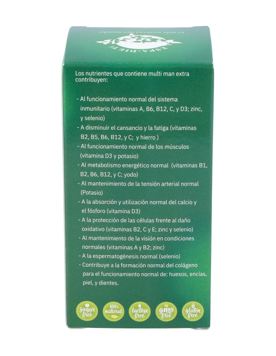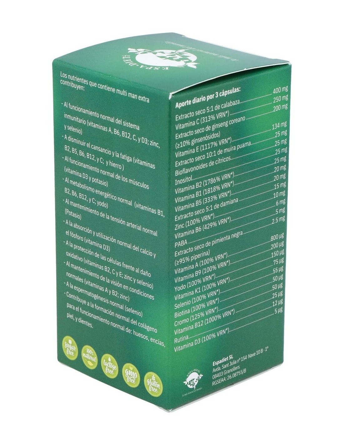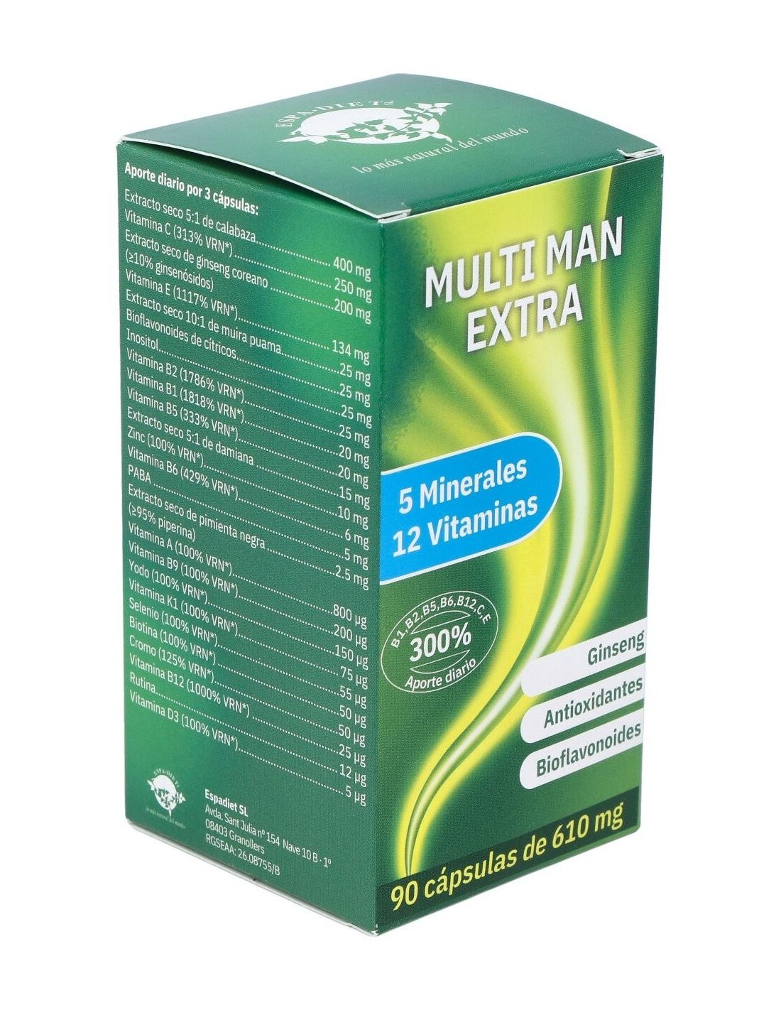 Multi Man Extra 90Cap. Axium de Espadiet es un complemento diseñado para hombres que buscan apoyar su bienestar diario mediante una fórmula equilibrada. Este producto está pensado para quienes desean incorporar nutrientes específicos en su rutina habitual de cuidado personal.