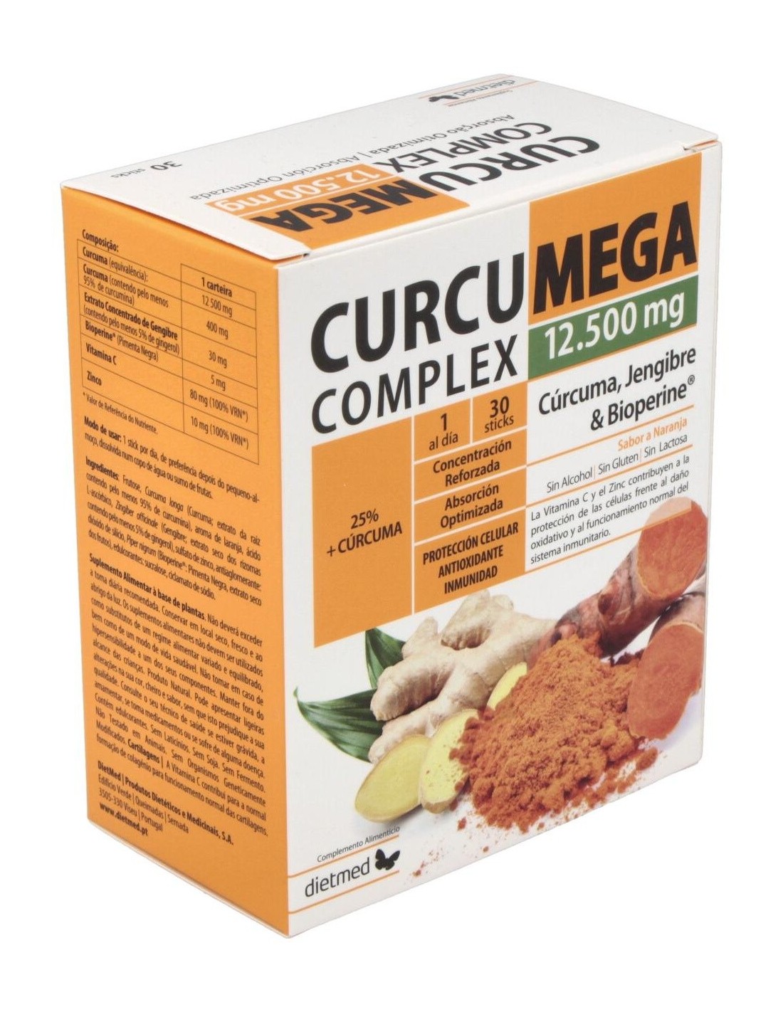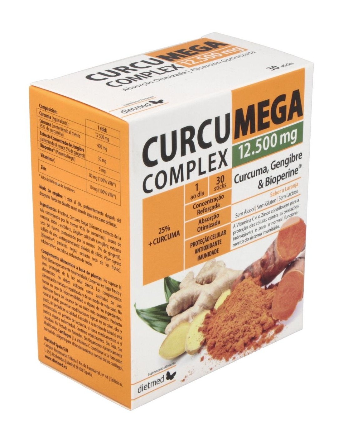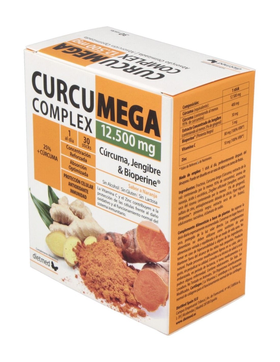 El Curcumega Complex 30Sticks de Dietmed es un suplemento para personas que buscan apoyo antioxidante y bienestar digestivo, formulado con curcumina y extractos naturales que facilitan su absorción y eficacia.