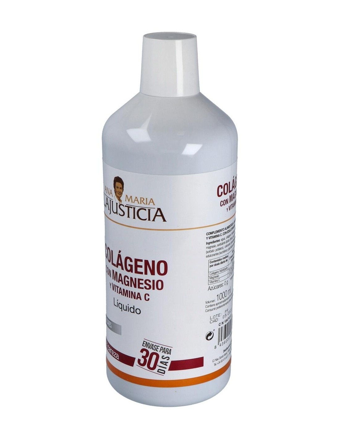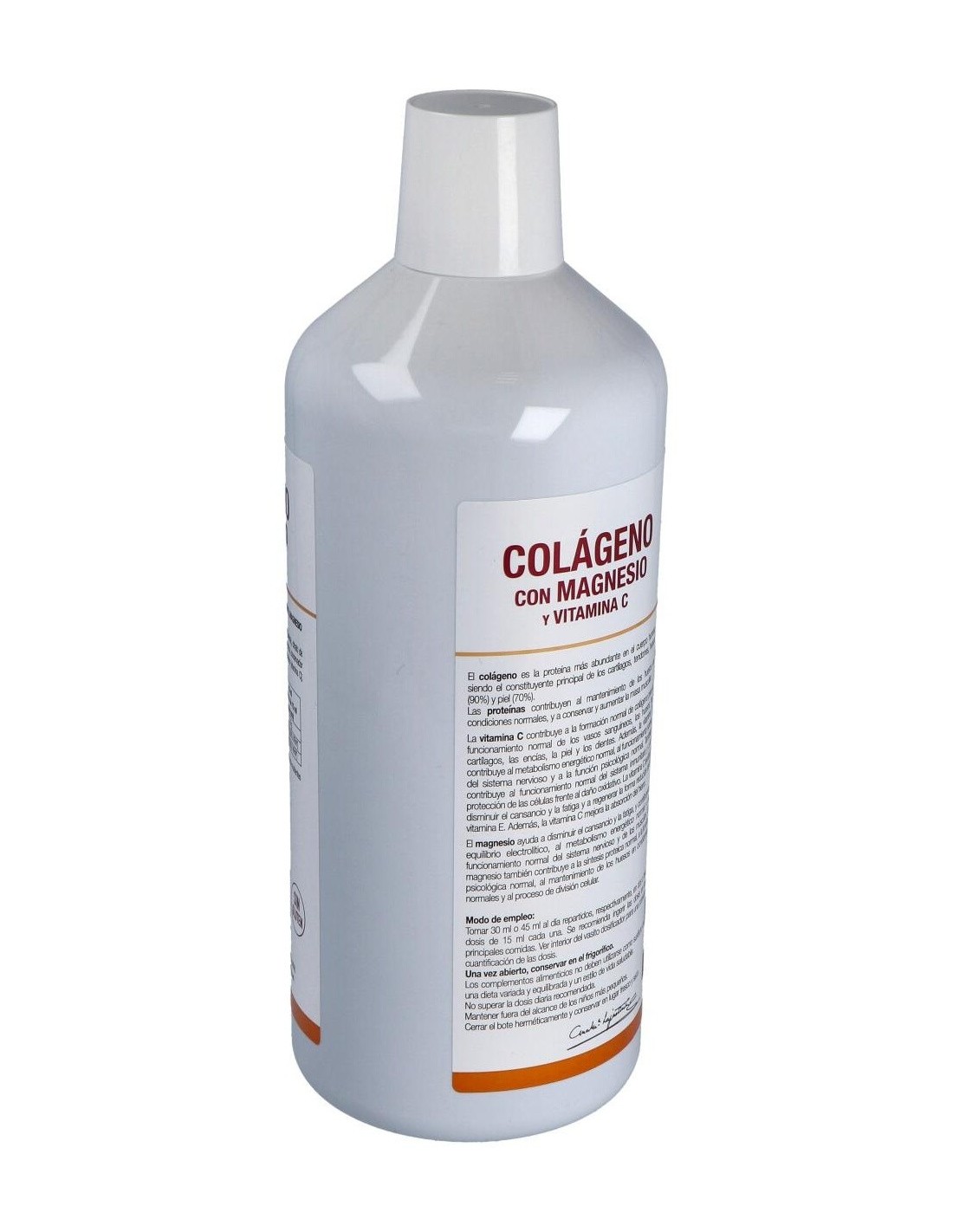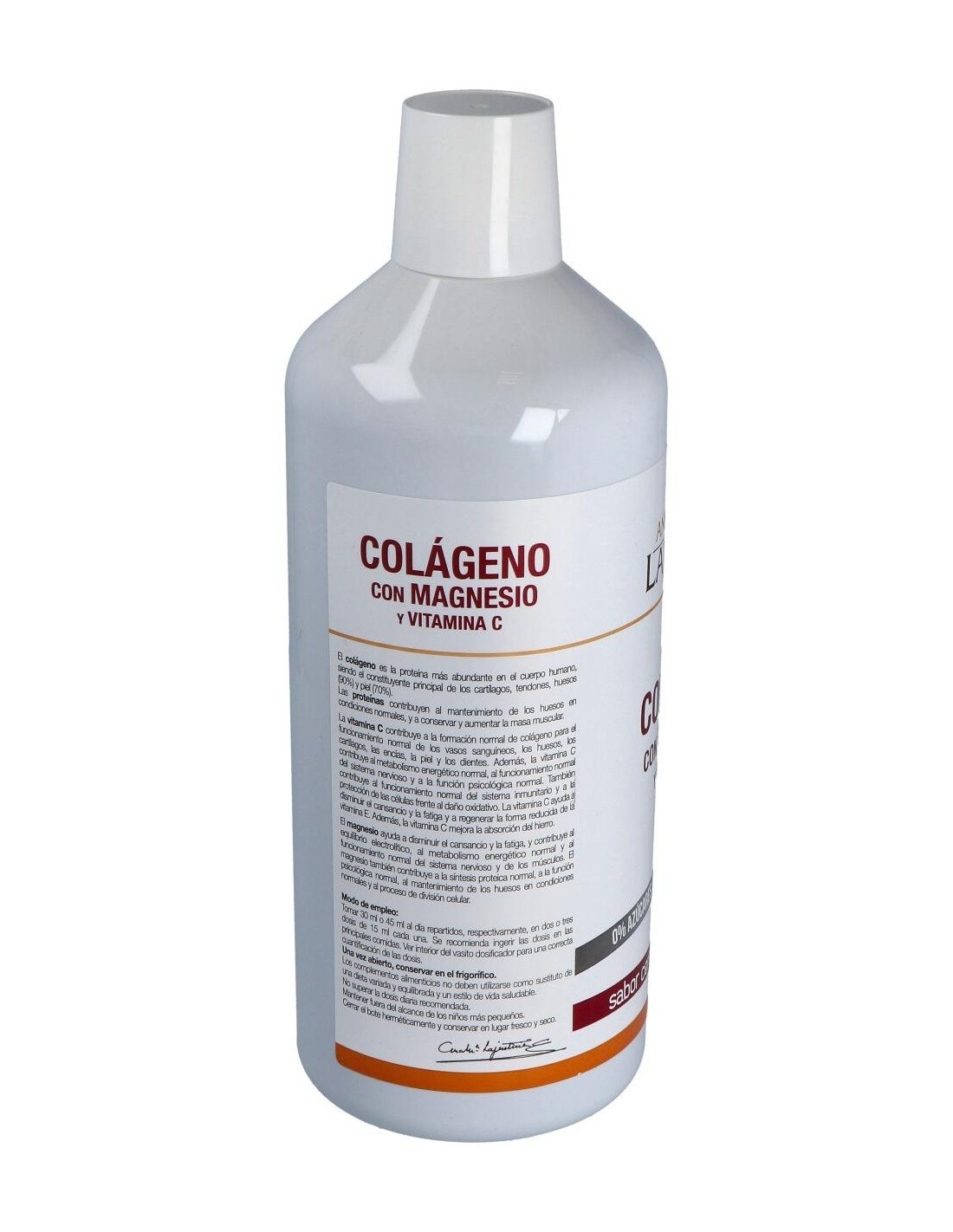 Ingredientes:Agua, colágeno hidrolizado, citrato de magnesio, conservador (glicerina), aroma (cereza), conservador (sorbato potásico), acidulante (ácido cítrico), sal, ácido L- ascórbico (vitamina C), aroma (romero), edulcorante (glucósidos de esteviol), colorante (carmines), edulcorante (sucralosa). Modo de empleo:Se recomienda tomar de 30 a 45 ml al día repartidos en varias tomas de dos a tres dosis cada una. Presentación:Botella de 1 litro.