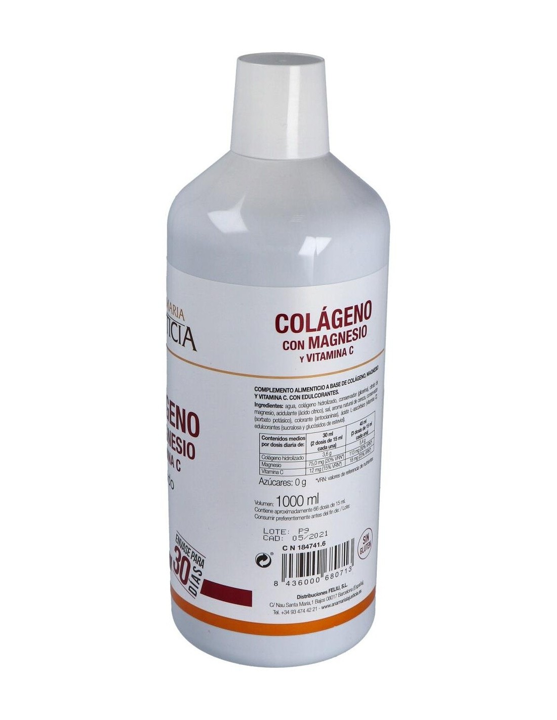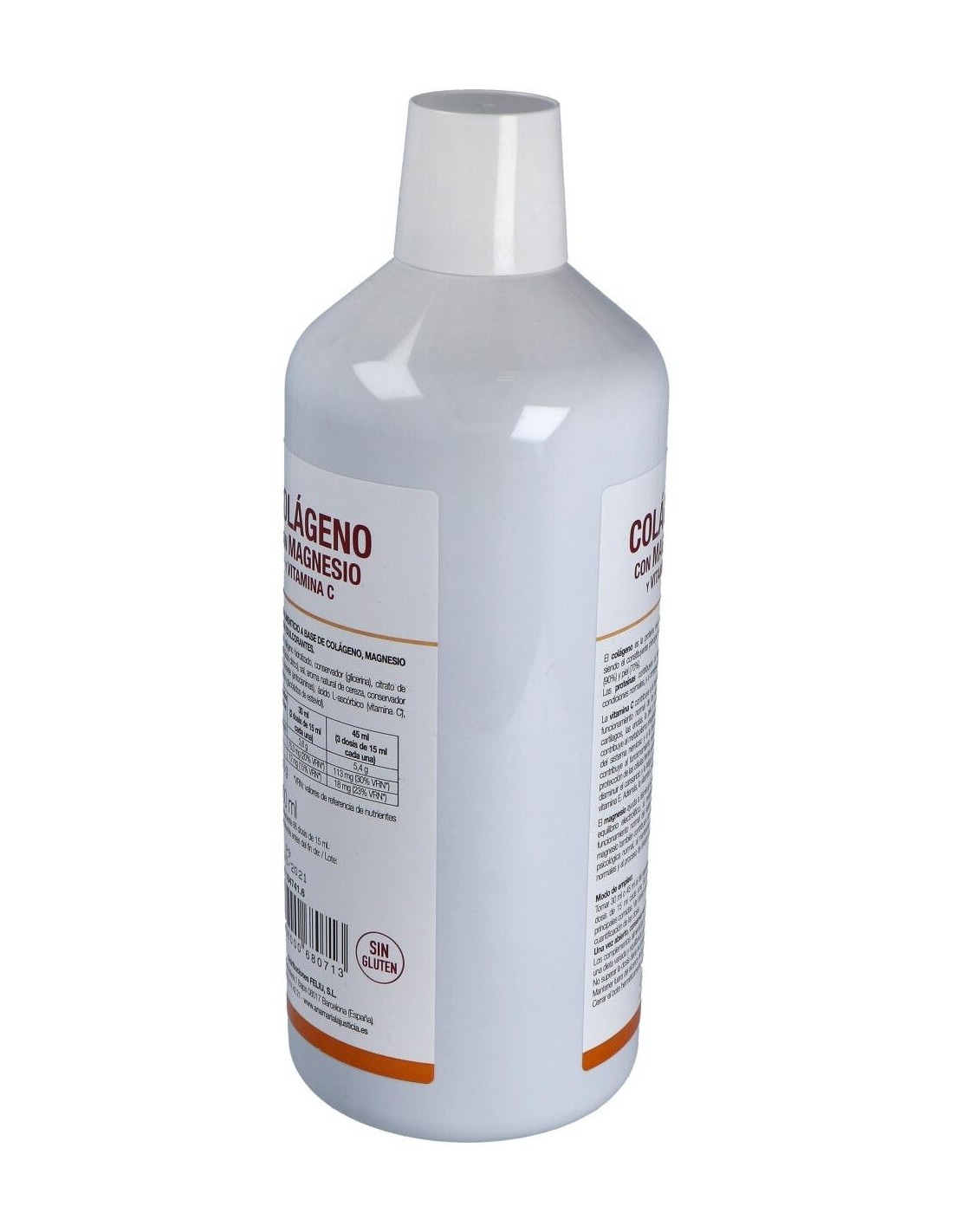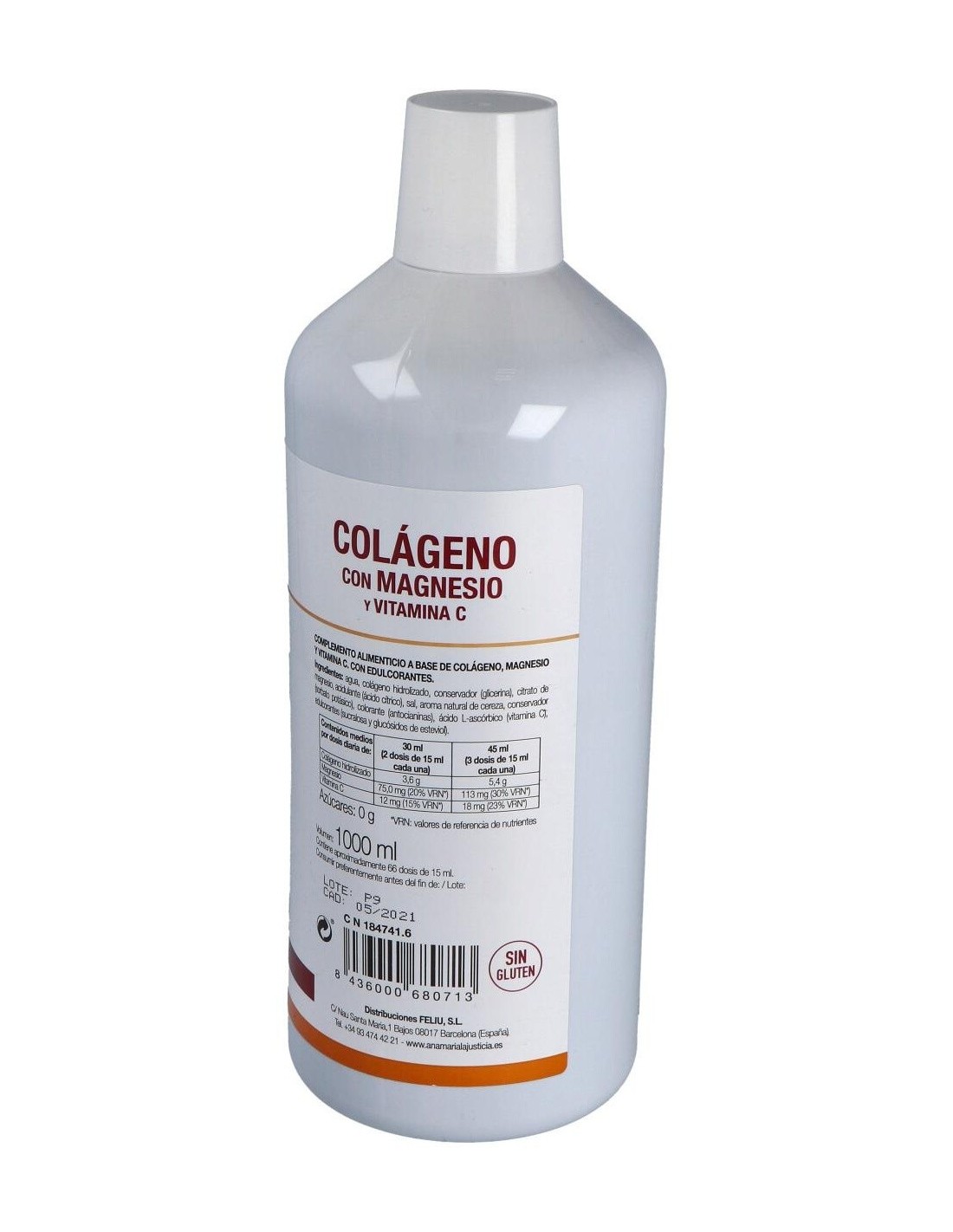 Ingredientes:Agua, colágeno hidrolizado, citrato de magnesio, conservador (glicerina), aroma (cereza), conservador (sorbato potásico), acidulante (ácido cítrico), sal, ácido L- ascórbico (vitamina C), aroma (romero), edulcorante (glucósidos de esteviol), colorante (carmines), edulcorante (sucralosa). Modo de empleo:Se recomienda tomar de 30 a 45 ml al día repartidos en varias tomas de dos a tres dosis cada una. Presentación:Botella de 1 litro.