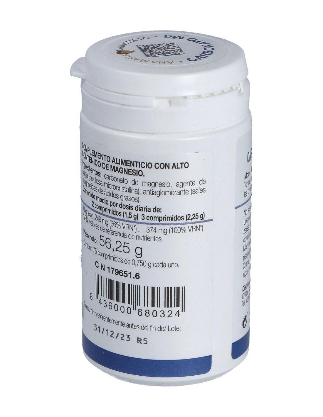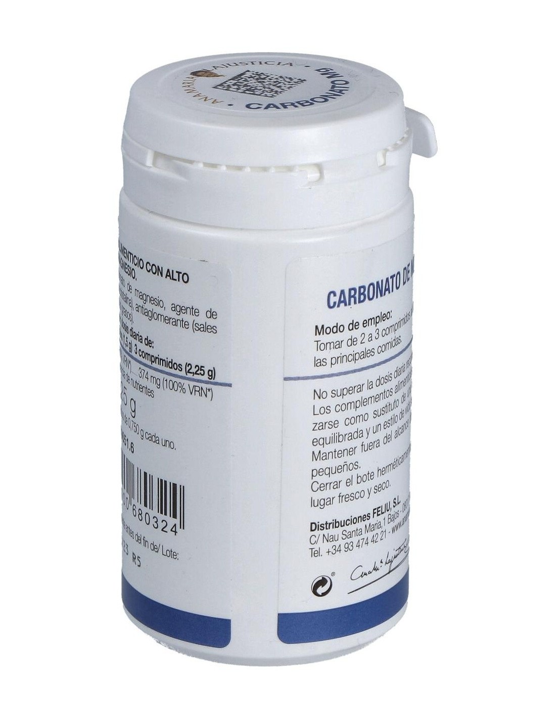 Composición por 2 comprimidos:300 mg de magnesio (carbonato). Modo de empleo:Tomar de 2 a 3 comprimidos al día con las comidas. Presentación:Bote de 75 comprimidos.