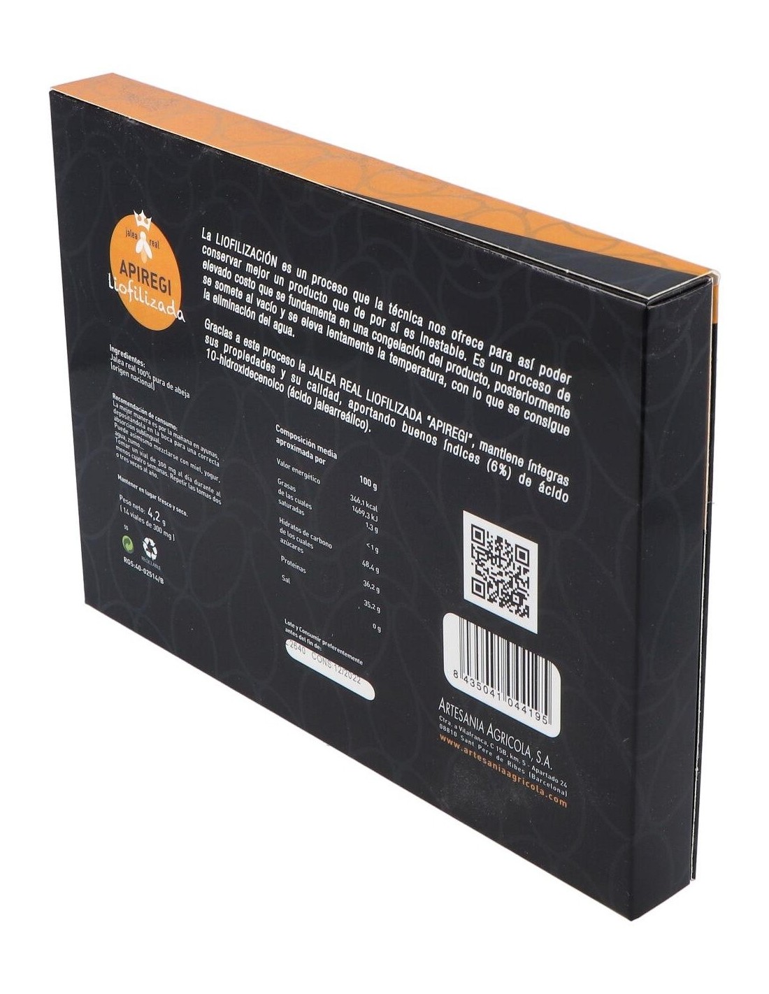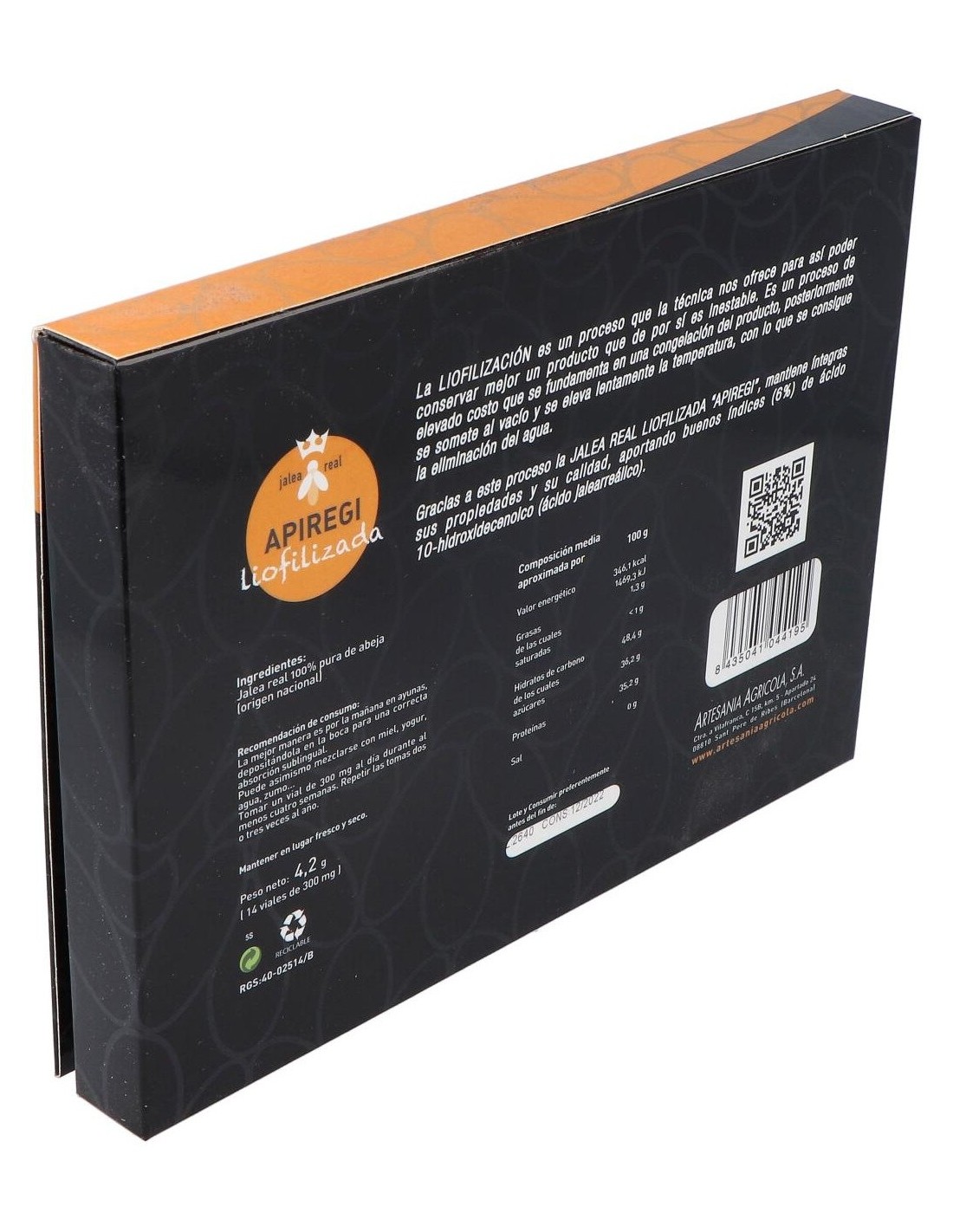 La jalea real es un producto segregado por las glándulas hipofaríngeas y las glándulas mandibulares de las abejas nodrizas (obreras de 5 a 14 días de edad) cuando disponen de polen, agua y miel.La jalea real es de origen endógeno porque la producen exclusivamente las abejas y constituye el alimento de las larvas obreras y zánganos hasta su tercer día y de la reina adulta durante toda su vida.La diferencia en la alimentación entre abejas obreras y reina incide directamente en su ciclo evolutivo, es decir en su desarrollo físico, su capacidad genética y su longetividad: mientras que la abeja reina tiene una vida de unos 5 años, las obreras tan sólo viven de 30 a 45 días.Entre sus propiedades cabe destacar que posee un efecto estimulante, tonificante y reequilibrante del sistema nervioso, mejora la oxigenación cerebral, regulariza los trastornos digestivos. Aporta la energía extra necesaria a niños y adolescentes en edad escolar, sobre todo en época de exámenes y competición deportiva.Contiene ácido petroilglutámico y nicotinamida por lo que se le atribuye una acción vasodilatadora y favorecedora de la proliferación de glóbulos rojos. Por este motivo es utilizada también en casos de anemia o como preventivo de enfermedades cardiovasculares.También posee poder antimicrobiano, por los que puede ser recomendada como preventiva en periodos de epidemias gripales y como refuerzo del sistema inmunitario de los grupos de más riesgo: niños, ancianos y personas debilitadas.Por todas estas propiedades, la jalea real constituye un excelente complemento alimentario en estados de debilidad o agotamiento físico o psíquico.Apiregi Jalea Real Liofilizada se compone de Jalea Real De Alta Calidad: mínimo 5% en ácido 10-hidroxidecenoico (ácido jaleaareálico-10-HDA).Ingredientes:Jalea real 100% pura de abeja.Modo de empleo:Tomar 1 vial diario, preferiblemente por las mañanas y en ayunas. Se puede mezclar en zumo o leche o ingerir directamente.Presentación:Envase de 14 viales.