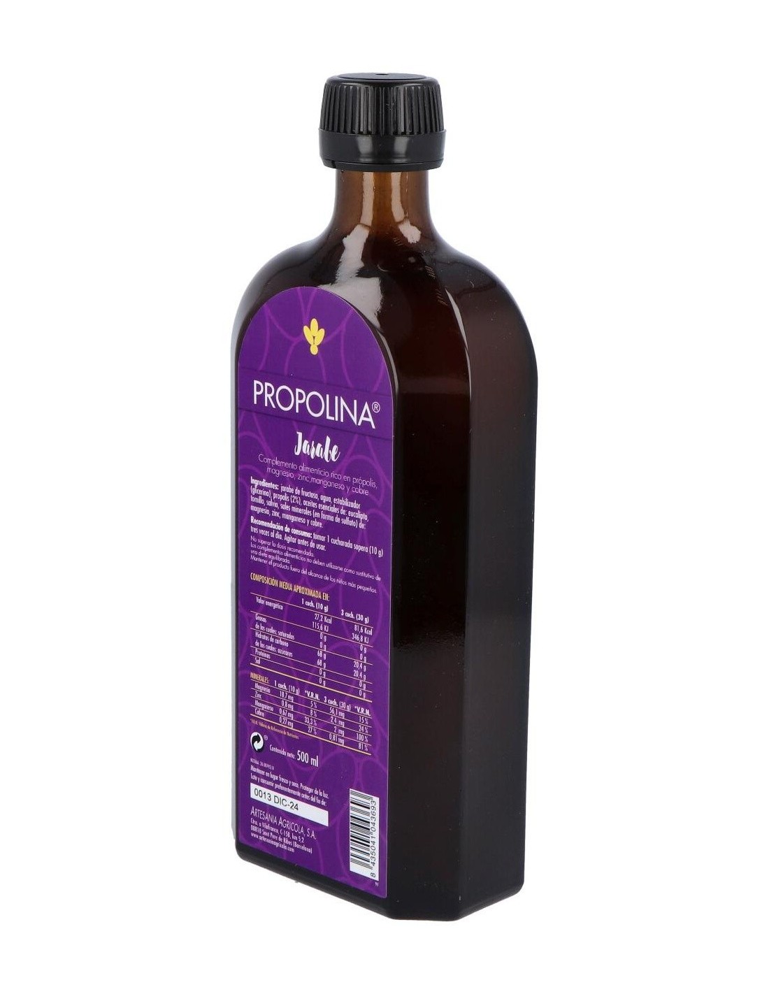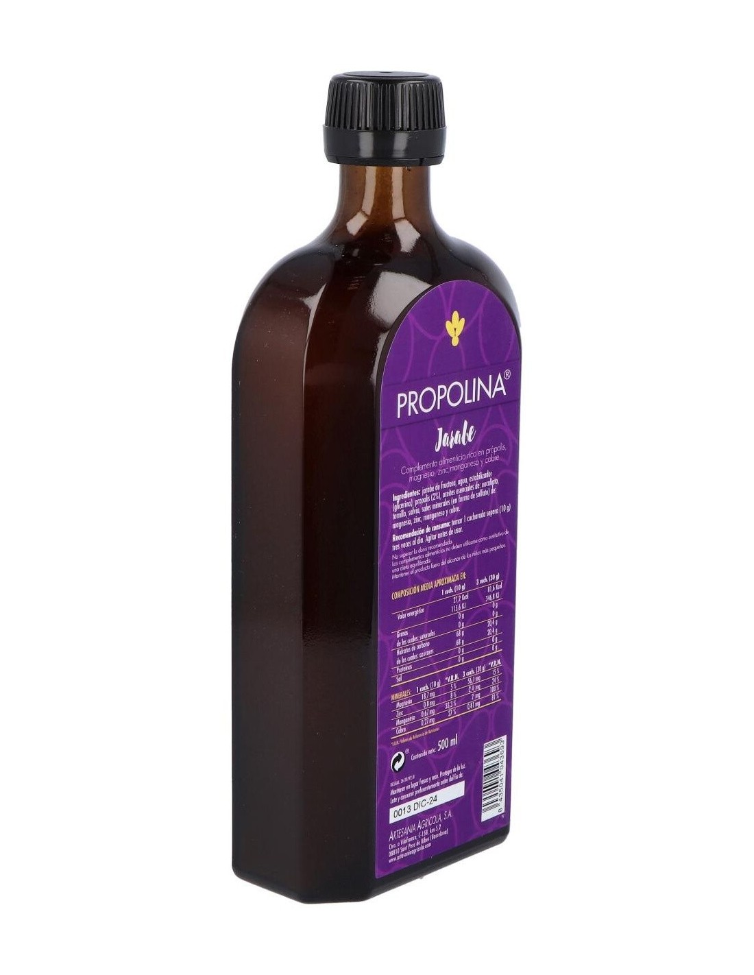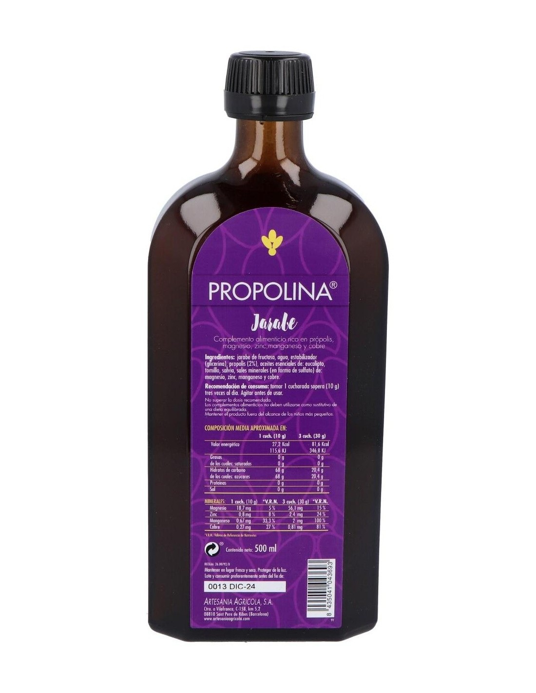 Ingredientes:Jarabe de fructosa, agua, estabilizador (glicerina), propolis (2%), aceites esenciales de: eucalipto, tomillo, salvia, sales minerales (en forma de sulfato) de magnesio, zinc, manganeso, cobre.Modo de empleo:Tomar una cucharada sopera (10 g) 3 veces al día.Presentación:Envase de 500 ml.