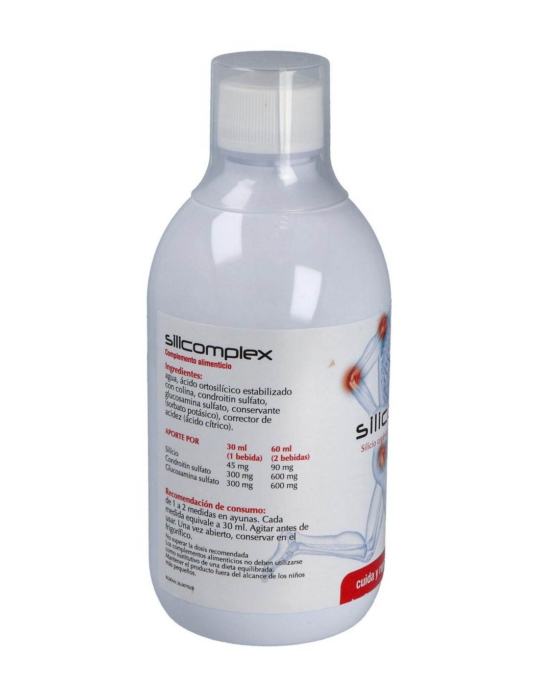Ingredientes:Agua, ácido ortosilícico estabilizado con colina, condroitin sulfato, glucosamina sulfato, conservante (sorbato potasico), corrector de acidez (ácido cítrico).Modo de empleo:Tomar de 1 a 2 medidas 20 minutos en ayunas, antes de desayunar. Cada medida equivale a 30 ml.?Una vez abierto conservar en frigorífico.Presentación:Envase de 500 ml.