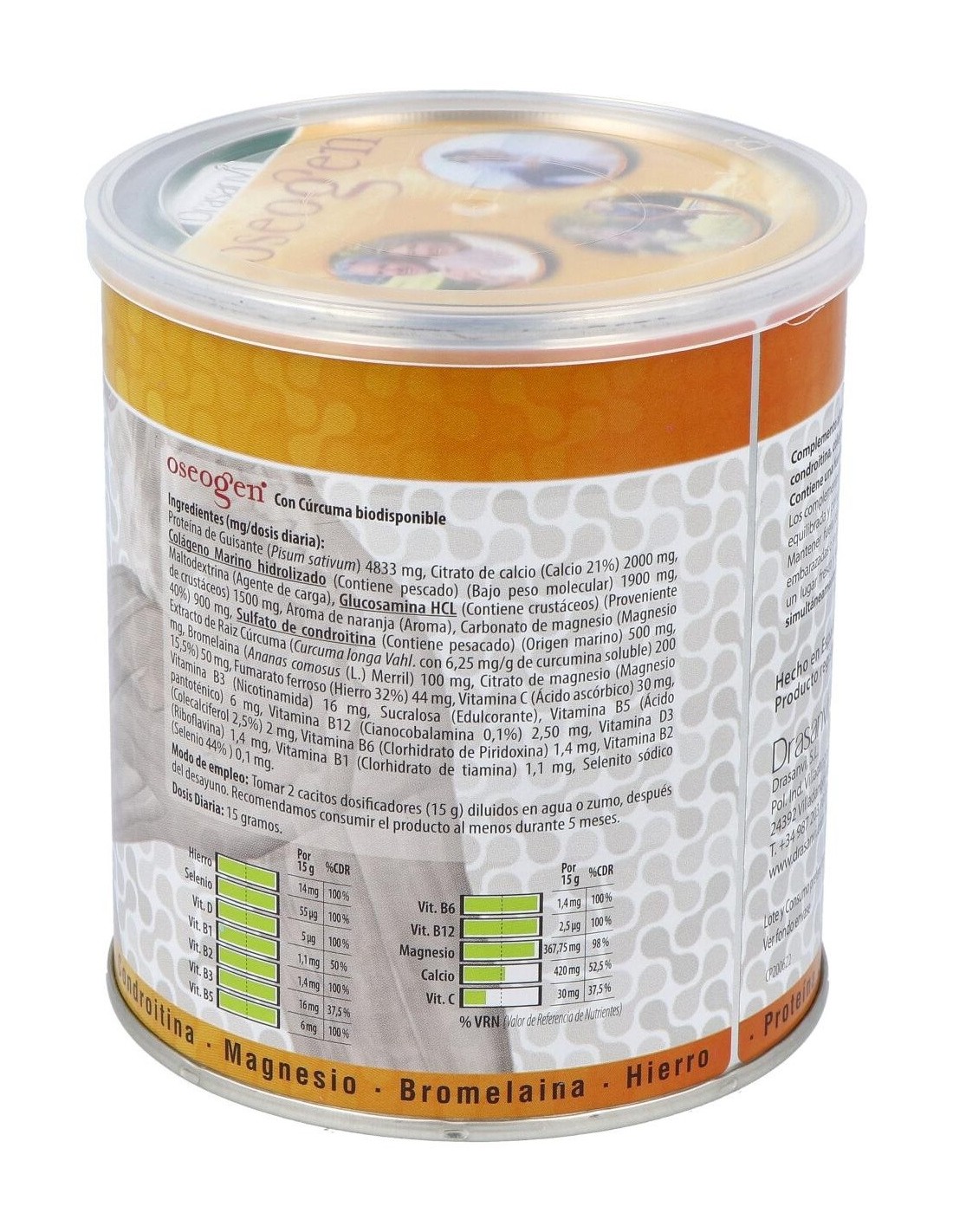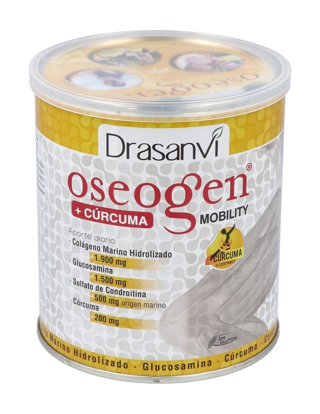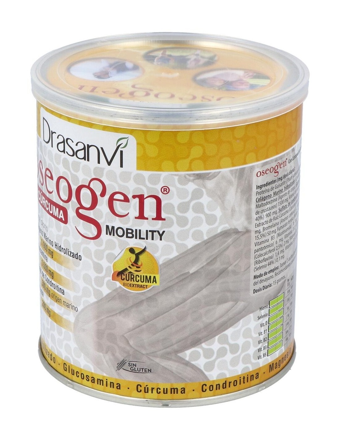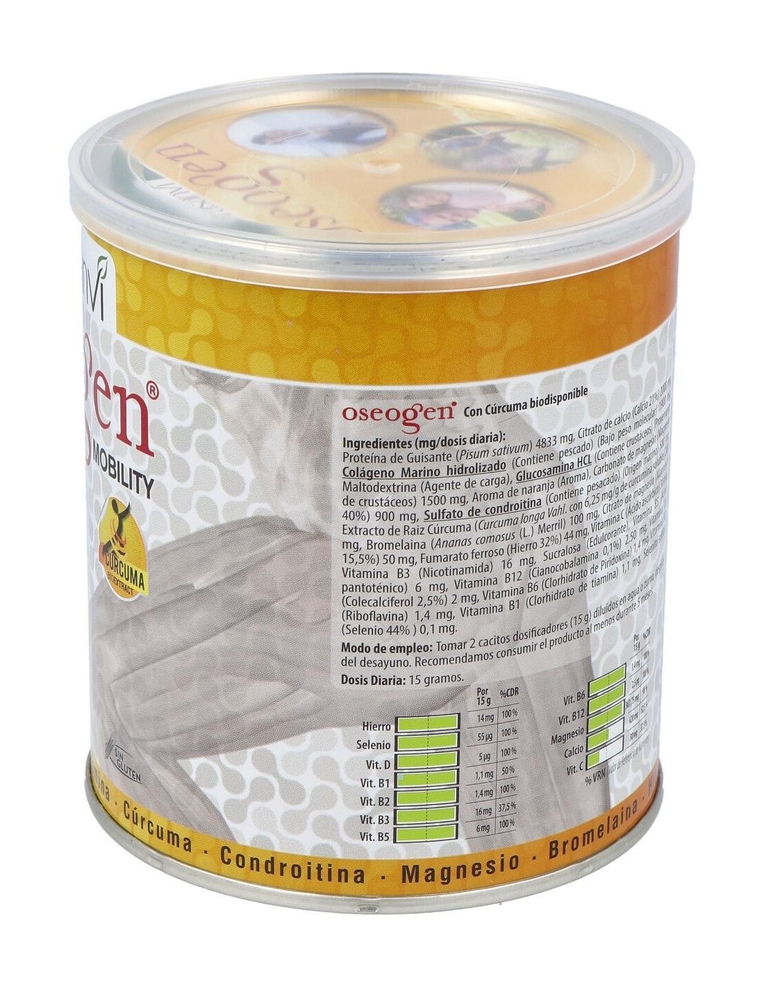 Oseogen Mobility es un complemento alimenticio único que incorpora en su composición nutrientes como el Colágeno Marino, la Condroitina, el Sulfato de Glucosamina y la Cúrcuma.Gracias a la presencia de Cúrcuma, contribuye aliviar los dolores musculares y articulares.Disponemos de estudios de biodisponibilidad, que garantizan la asimilación del producto.Ingredientes activos por dosis diaria: