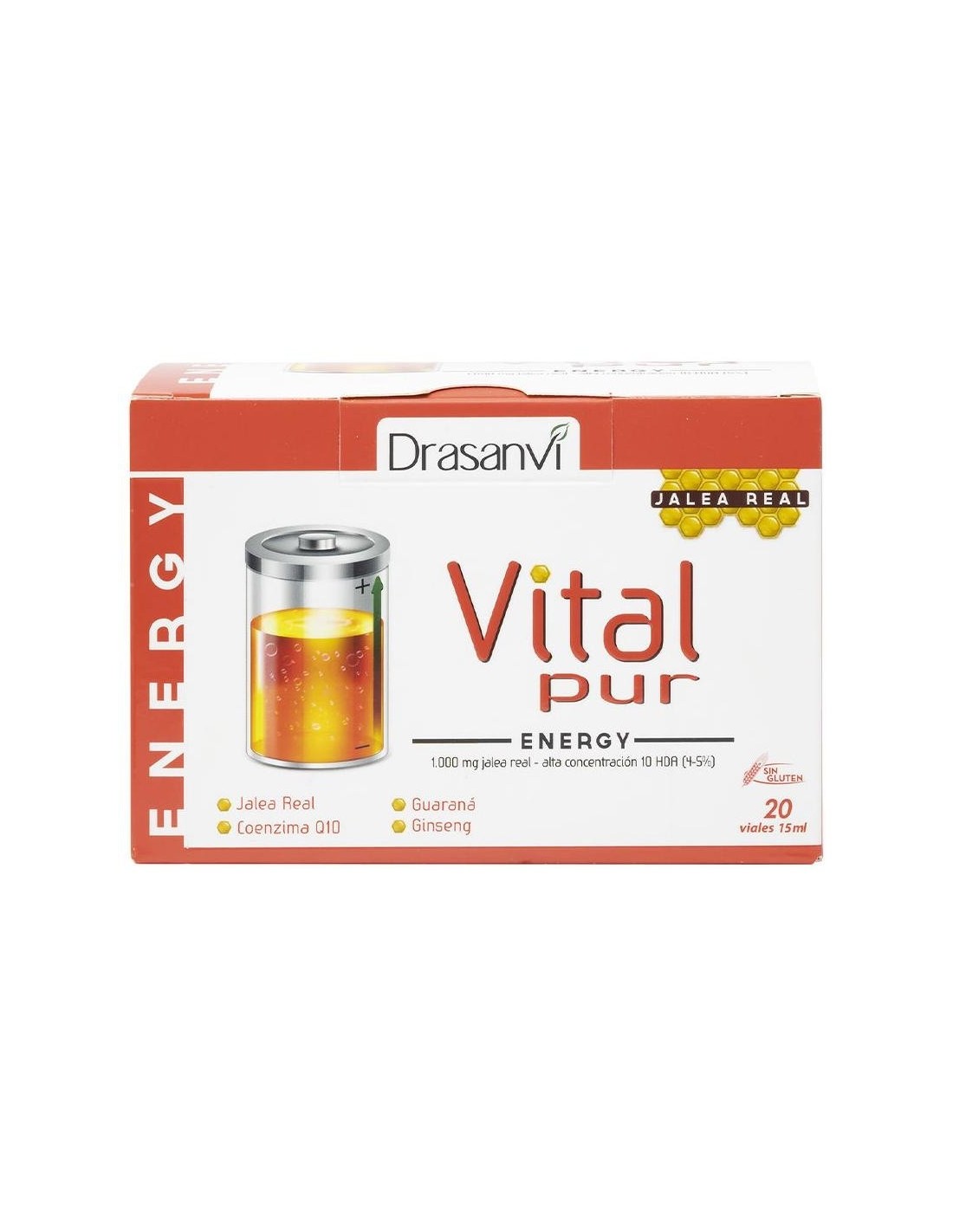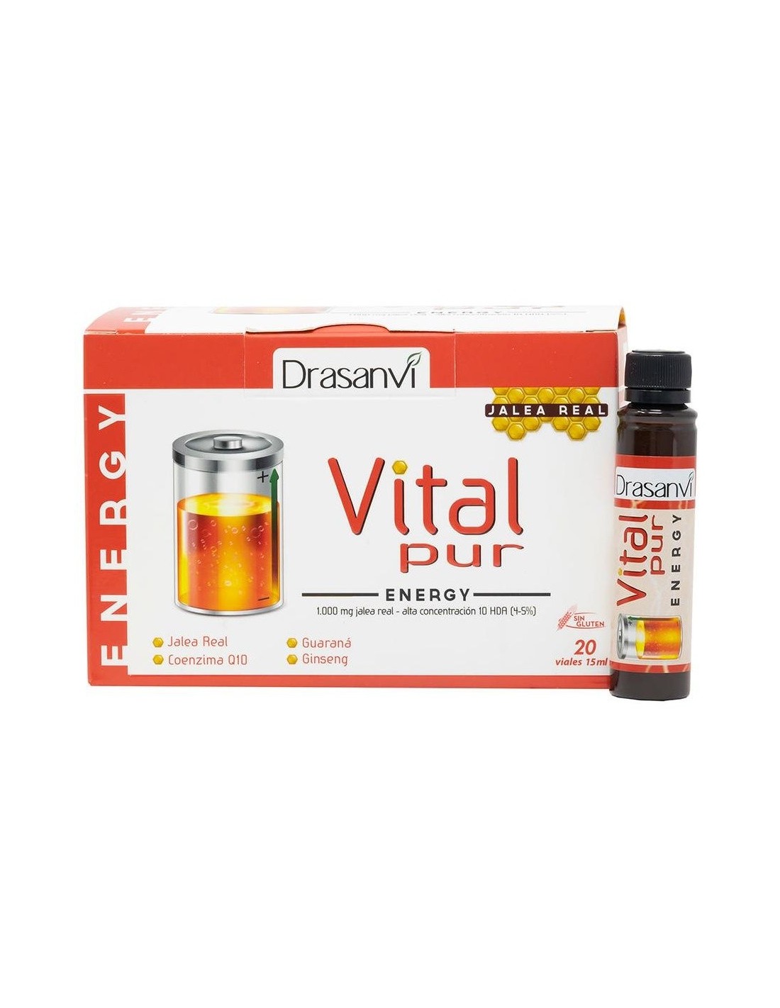 Este producto ayuda a disminuir el cansancio y la fatiga. Vitalpur Energy, es un complemento que basa su formulación en la jalea real (1000 mg) reforzada con minerales como el hierro. El hierro es un mineral de gran importancia ya que ayuda a disminuir el cansancio y la fatiga. Complementan la acción la vitamina B3, vitamina B5, vitamina B1, vitamina B6 (contribuye al metabolismo energético normal) vitamina B2, extractos vegetales como el ginseng, eleuterococco y guaraná. Vitalpur Energy, no lleva azúcares añadidos, y opta por la Stevia (edulcorante extraído de las hojas de una planta).Composición por vial: