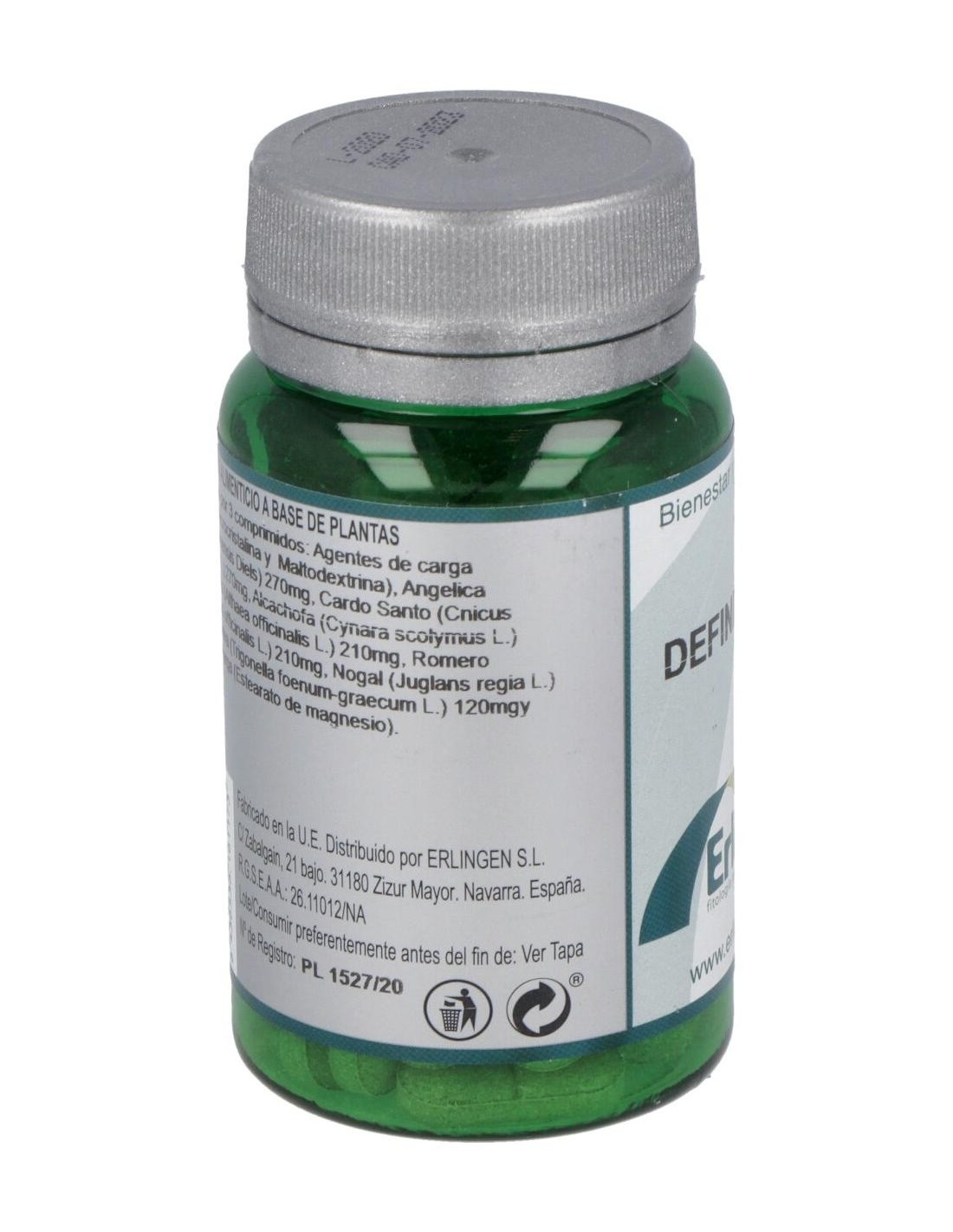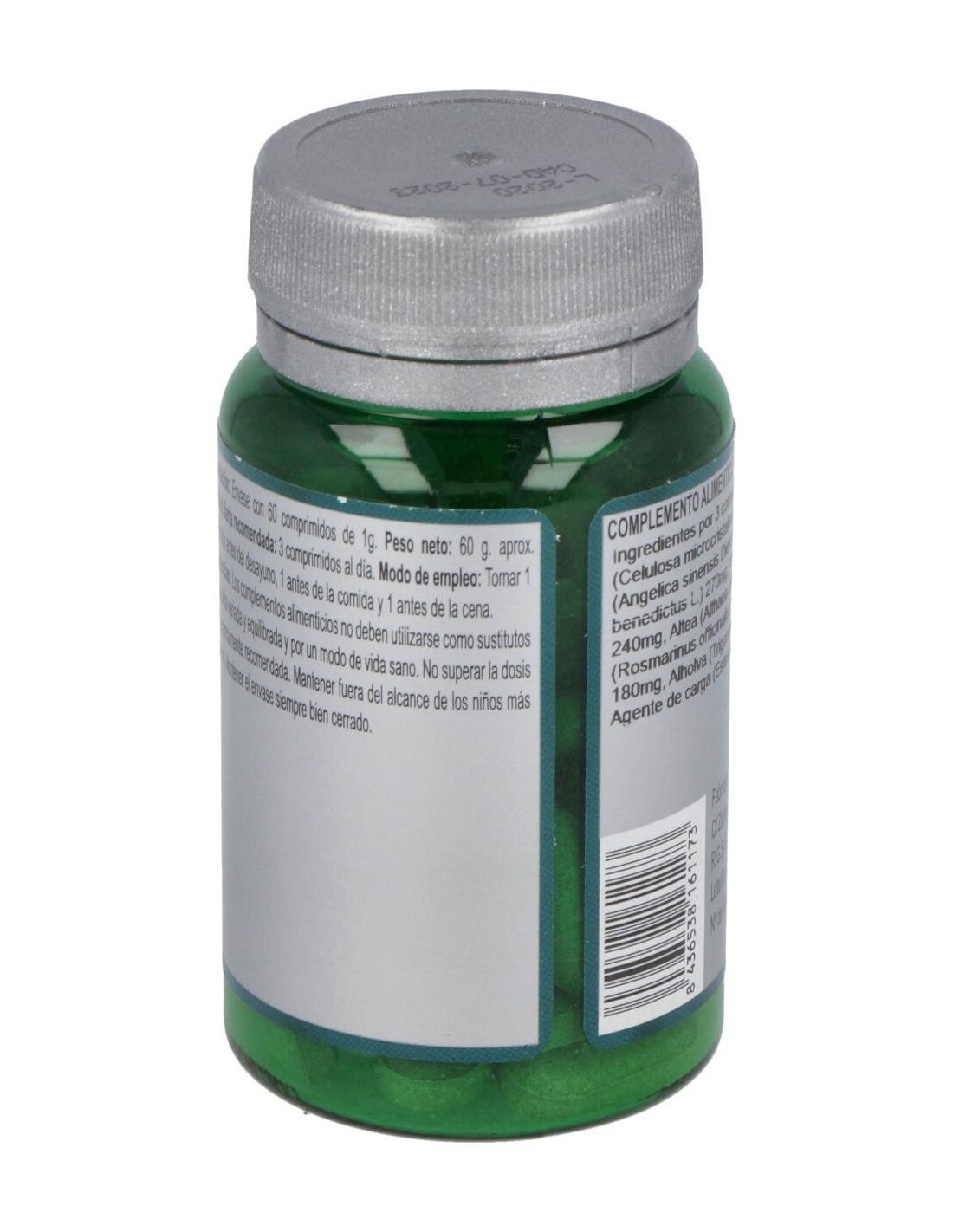 Agentes de carga (Celulosa microcristalina y Maltodextrina), Angélica (Angelica sinensis Diels) 270 mg, Cardo Santo (Cnicus benedictus L.) 270 mg, Alcachofa (Cynara scolymus L.) 240 mg, Altea (Althaea officinalis L.) 210 mg, Romero (Rosmarinus officinalis L.) 210 mg, Nogal (Juglans regia L.) 180 mg, Alholva (Trigonella foenum-graecum L.) 120 mg y Agente de carga (Estearato de magnesio).