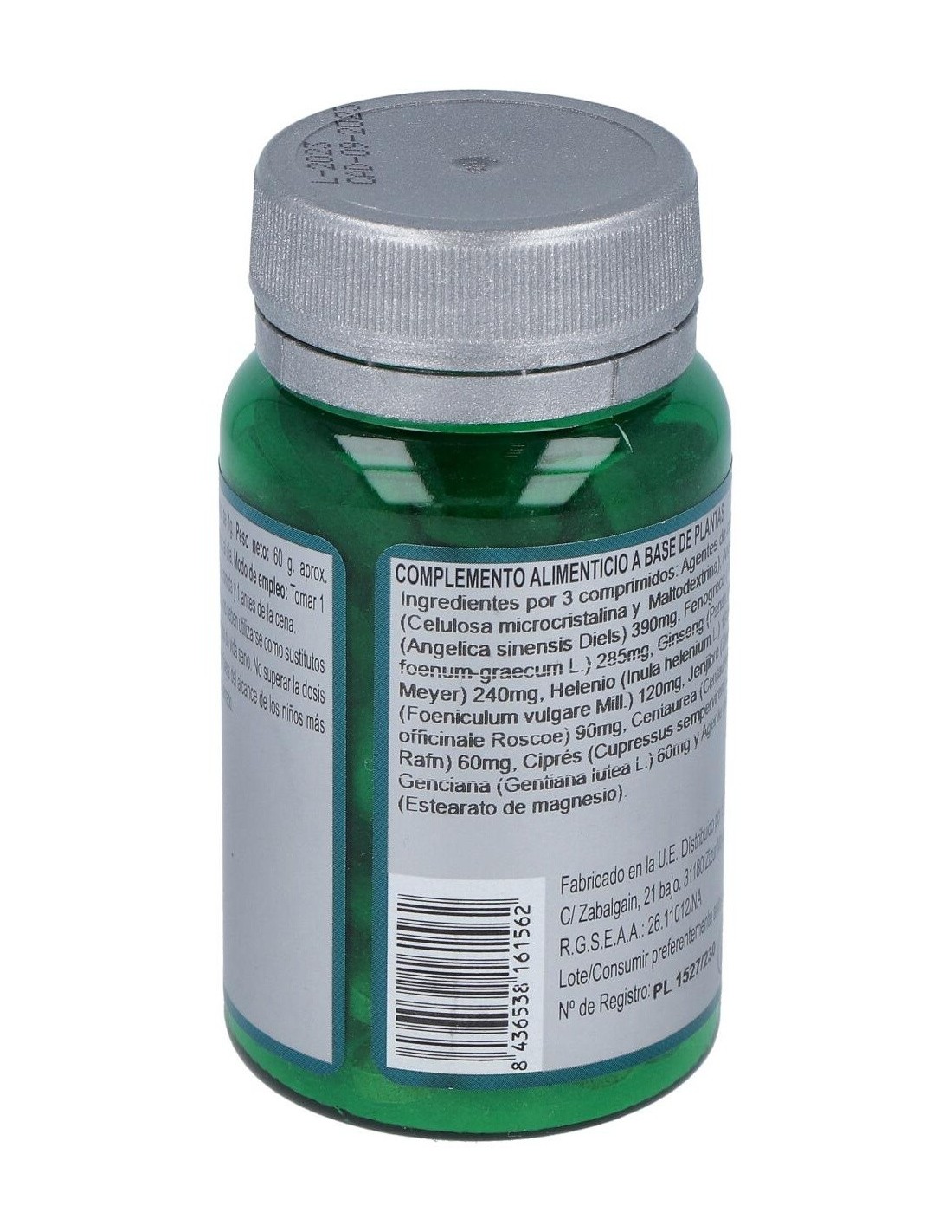 Angélica (Angelica Sinensis Diels), Fenogreco (Trigonella Foenum-Graecum L.), Ginseng (Panax Ginseng C.A. Meyer), Helenio (Inula Helenium L.), Hinojo (Foeniculum Vulgare Miller), Jengibre (Zingiber Officinale Roscoe), Centaurium (Erythraea Centaurium), Ciprés (Cupressus Sempervirens), Genciana (Gentiana Lutea L.) Y Agentes de Carga (Celulosa Microcristalina, Maltodextrina Y Estearato de Magnesio).