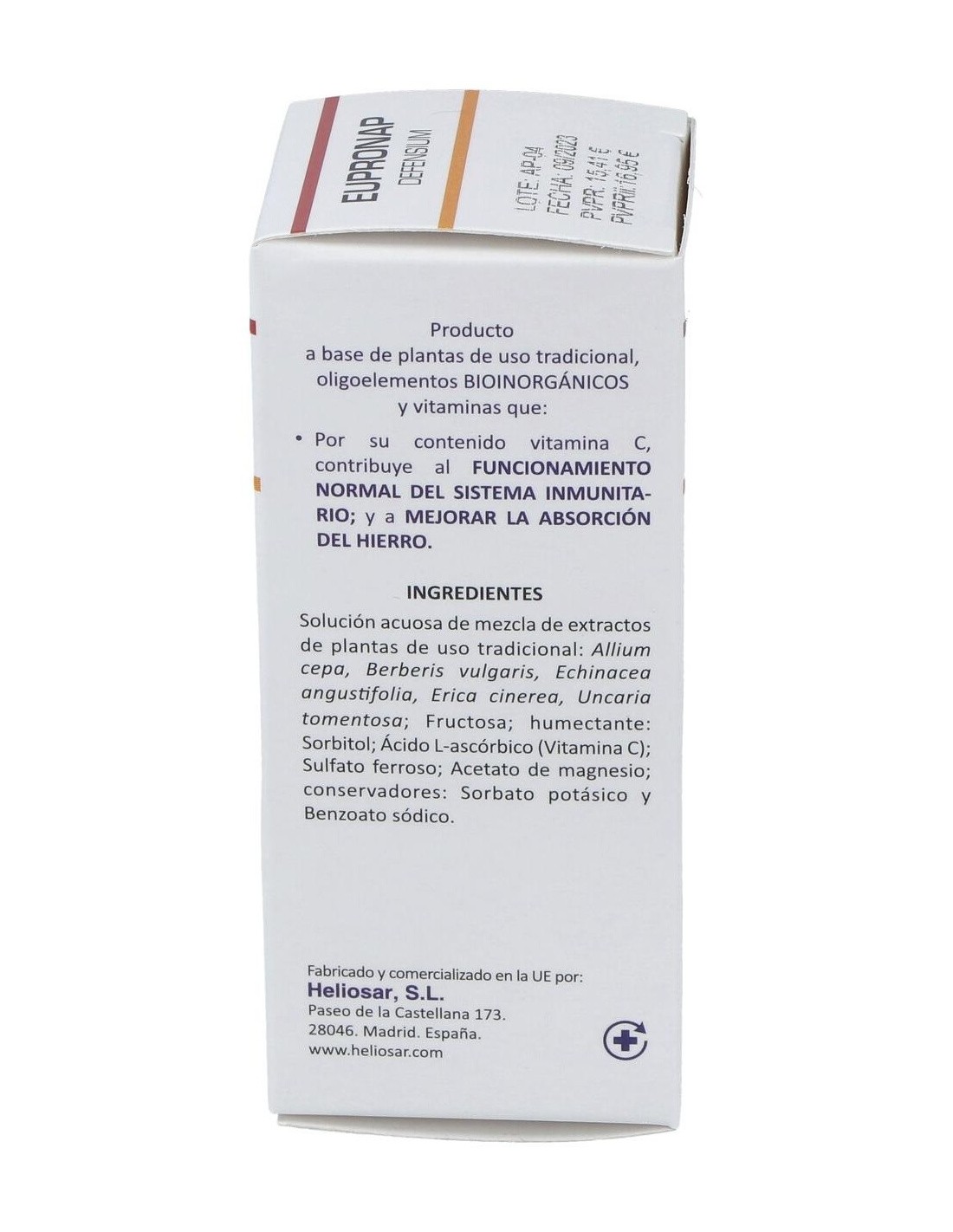 Complemento alimenticio en forma de solución acuosa para tomar en forma de gotas, que contribuyen al buen funcionamiento del sistema inmunitario. Formulado con plantas de uso tradicional, hierro, magnesio y vitamina C.