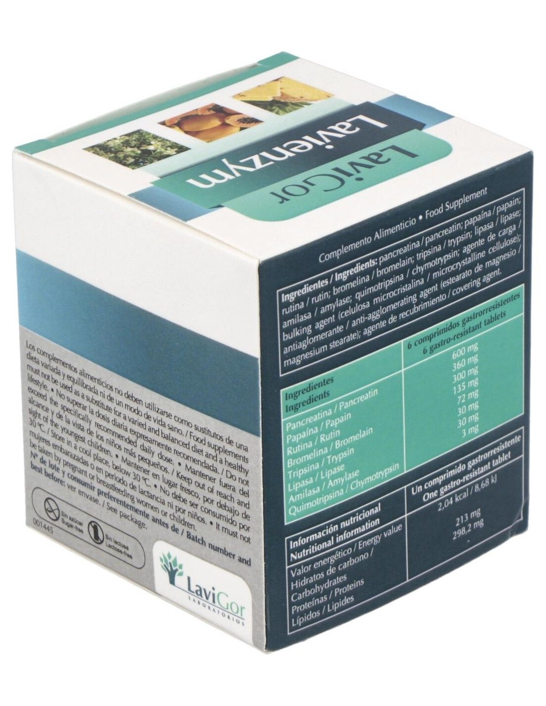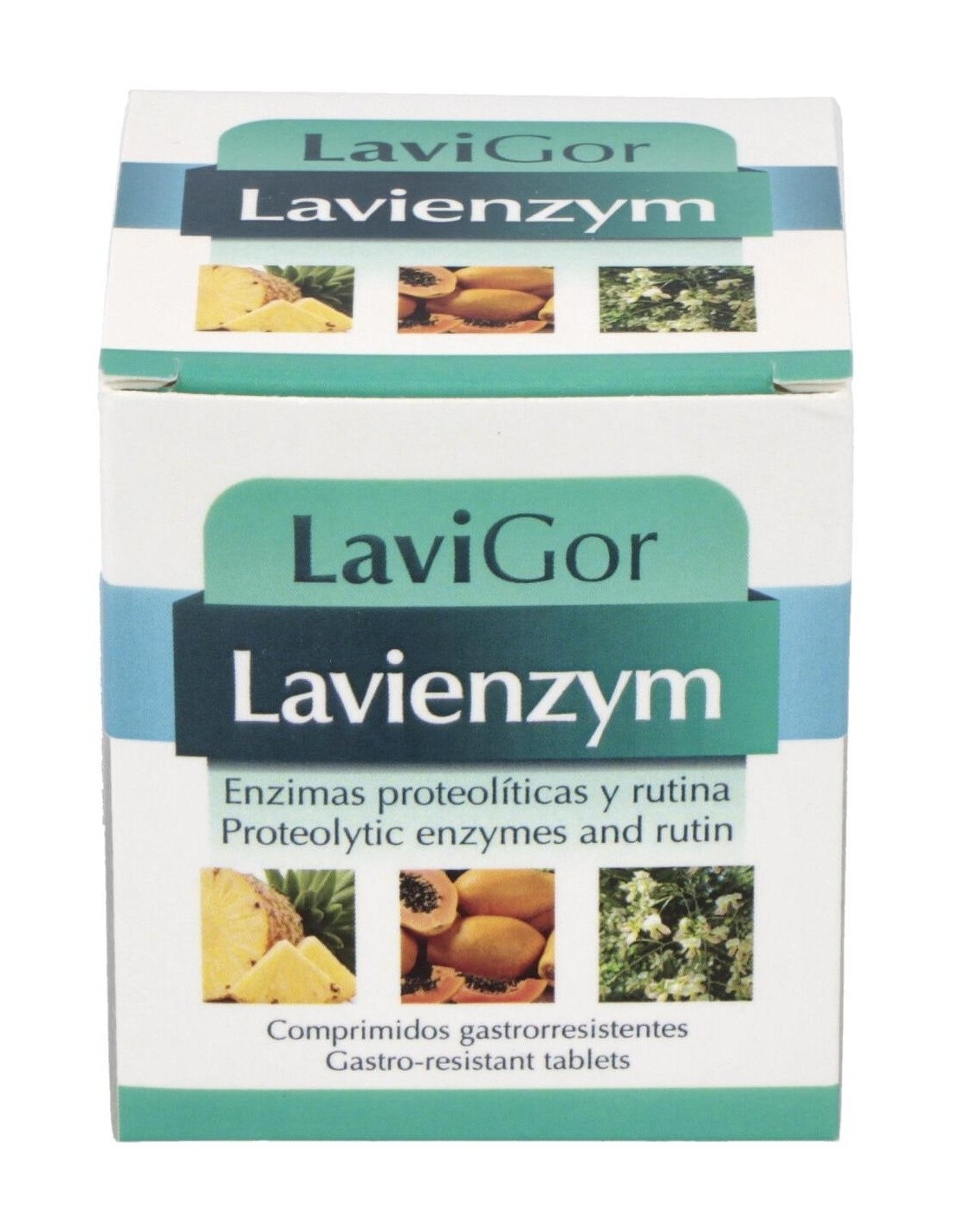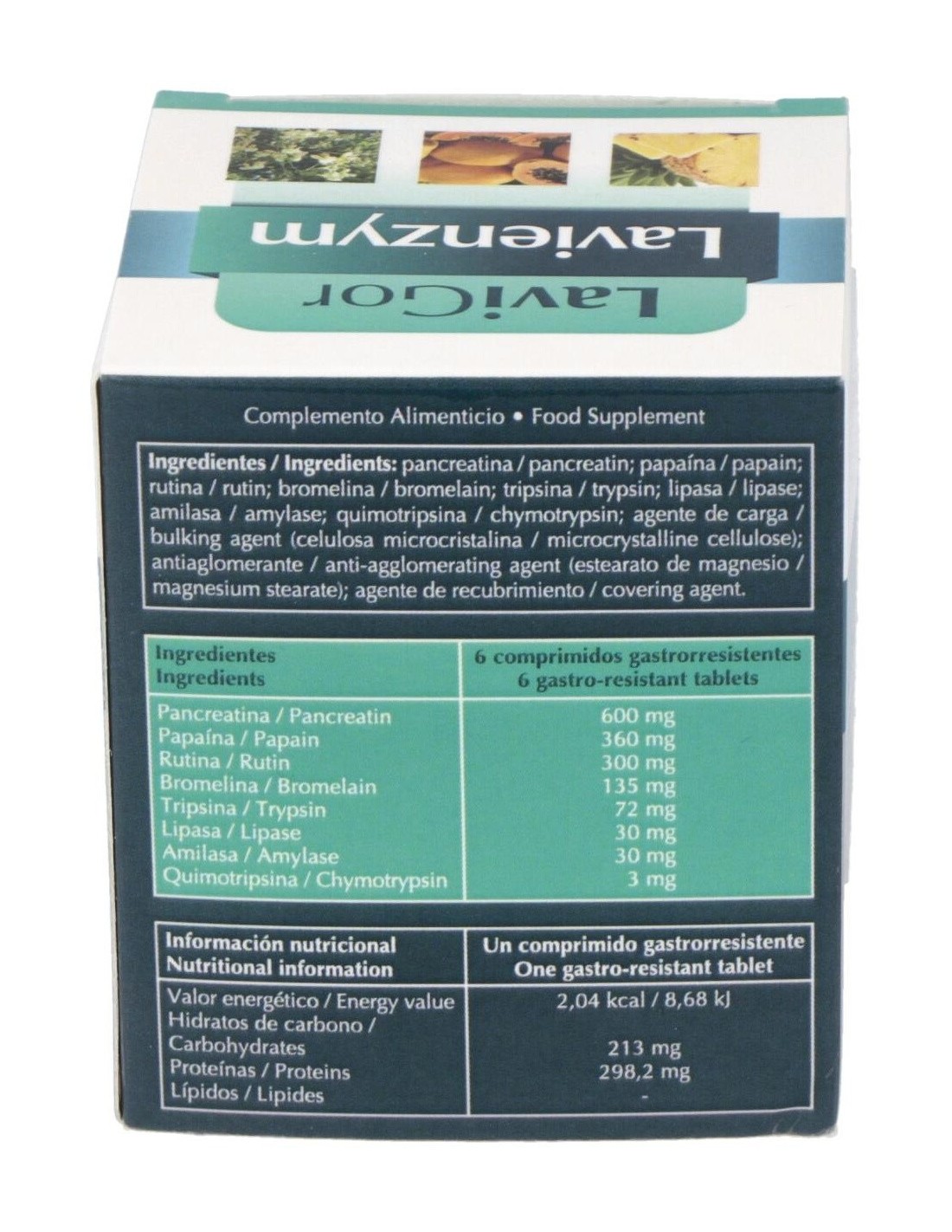 Pancreatina, 100 mg: papaína, 60 mg: rutina, 50 mg: bromelina, 45 mg: tripsina, 24 mg: lipasa, 10 mg: amilasa, 10 mg: quimiotripsina, 1 mg.