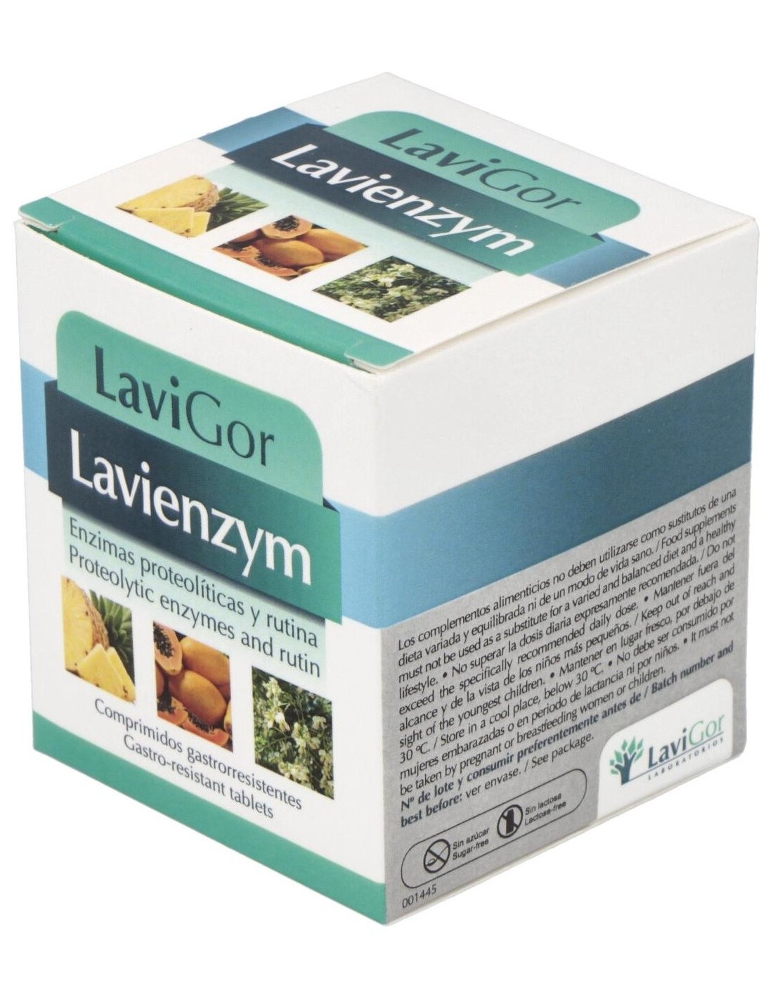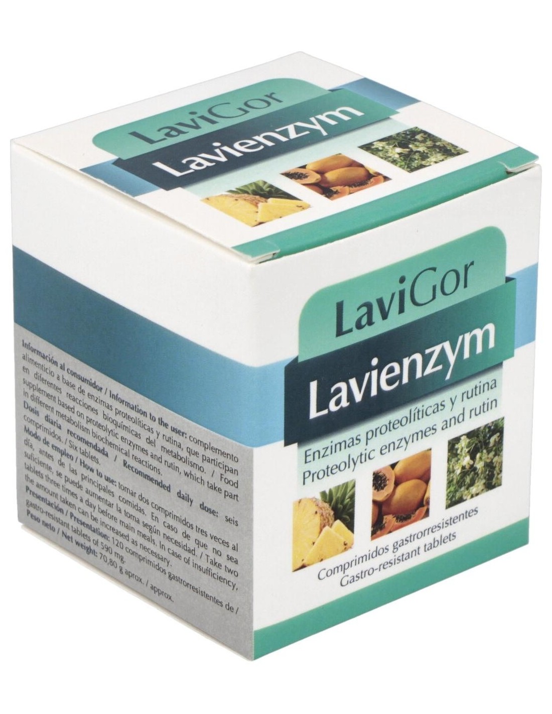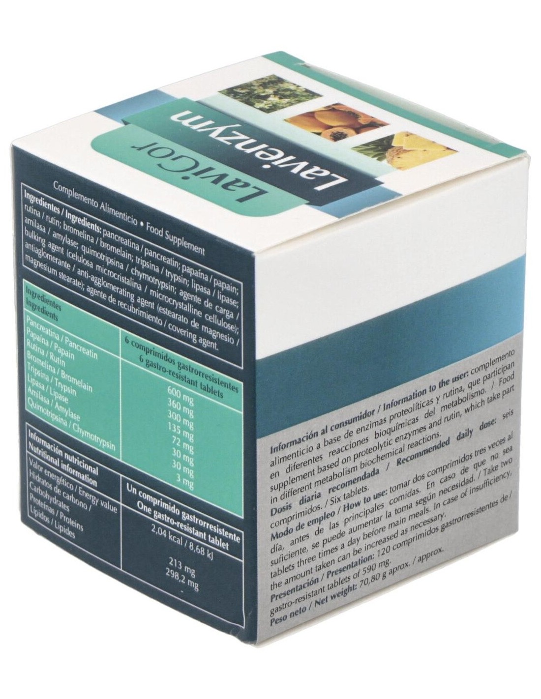 Pancreatina, 100 mg: papaína, 60 mg: rutina, 50 mg: bromelina, 45 mg: tripsina, 24 mg: lipasa, 10 mg: amilasa, 10 mg: quimiotripsina, 1 mg.