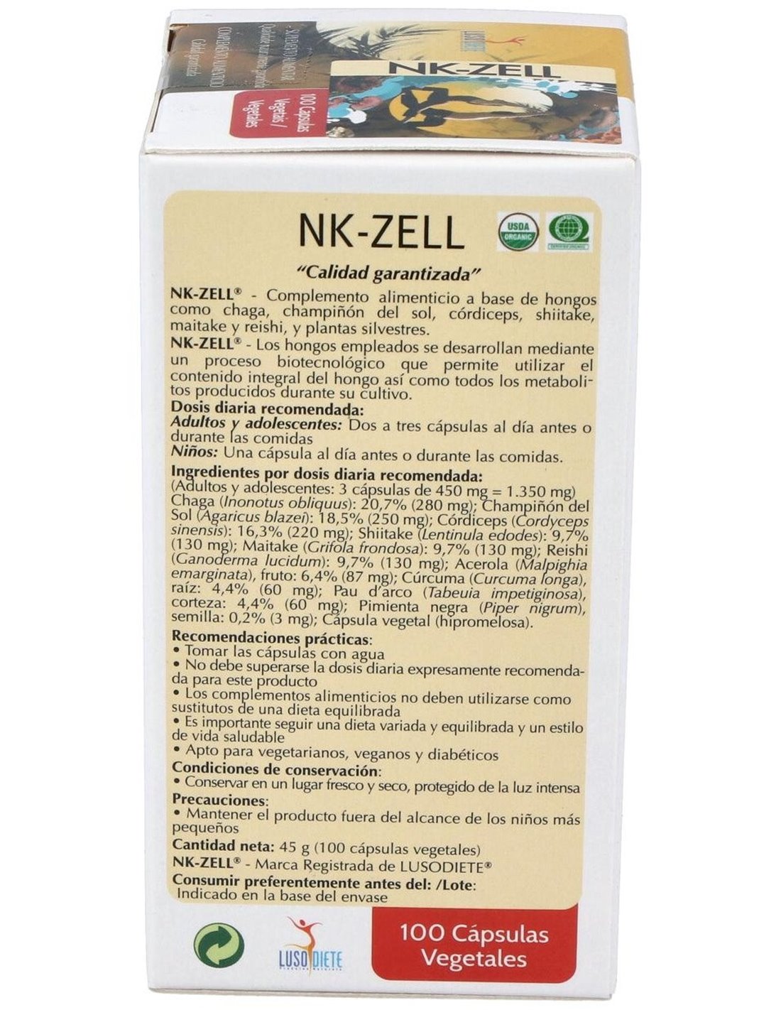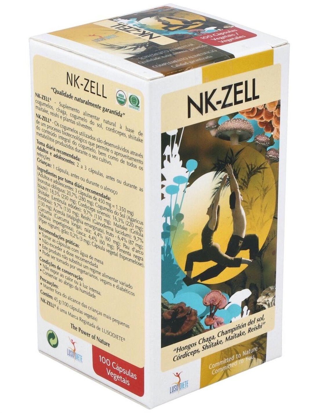 NK-Zell de Lusodiete es un complemento alimenticio que estimula la respuesta inmunológica y refuerza la actividad de las células inmunitarias. Fabricado con hongos de cultivo ecológico y plantas silvestres, ricos en aminoácidos esenciales, proteínas, enzimas, polisacáridos, vitaminas, minerales y oligoelementos.NK-Zell aporta una combinación de varios hongos (Inonotus obliquus, Agaricus blazei, Cordyceps sinensis, Lentinula edodes, Grifola frondosa y Ganoderma lucidum) que maximizan la respuesta inmune del organismo.Principios activos: