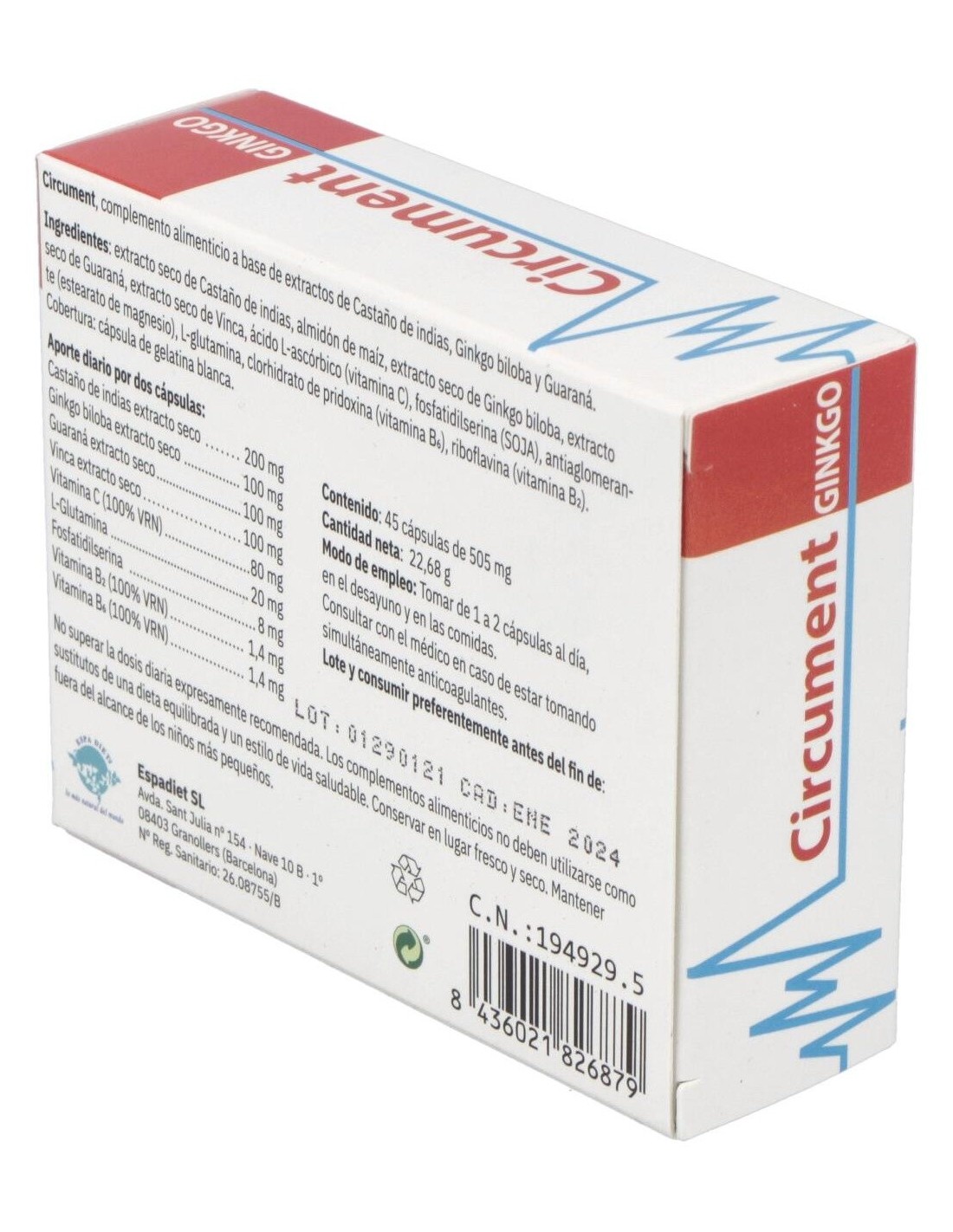 Ingredientes:Extracto seco de Castaño de indias, almidón de maíz, extracto seco de Ginkgo biloba, extracto seco de Guaraná, extracto seco de Vinca, ácido L-ascórbico (vitamina C), fosfatidilserina (SOJA), antiaglomeran-te (estearato de magnesio), L-glutamina, clorhidrato de pridoxina (vitamina Bs), riboflavina (vitamina B2). Cobertura: cápsula de gelatina blanca. Modo de empleo:Tomar de 1 a 2 cápsulas al día, en el desayuno y en la merienda. Presentación:Envase de 45 cápsulas.