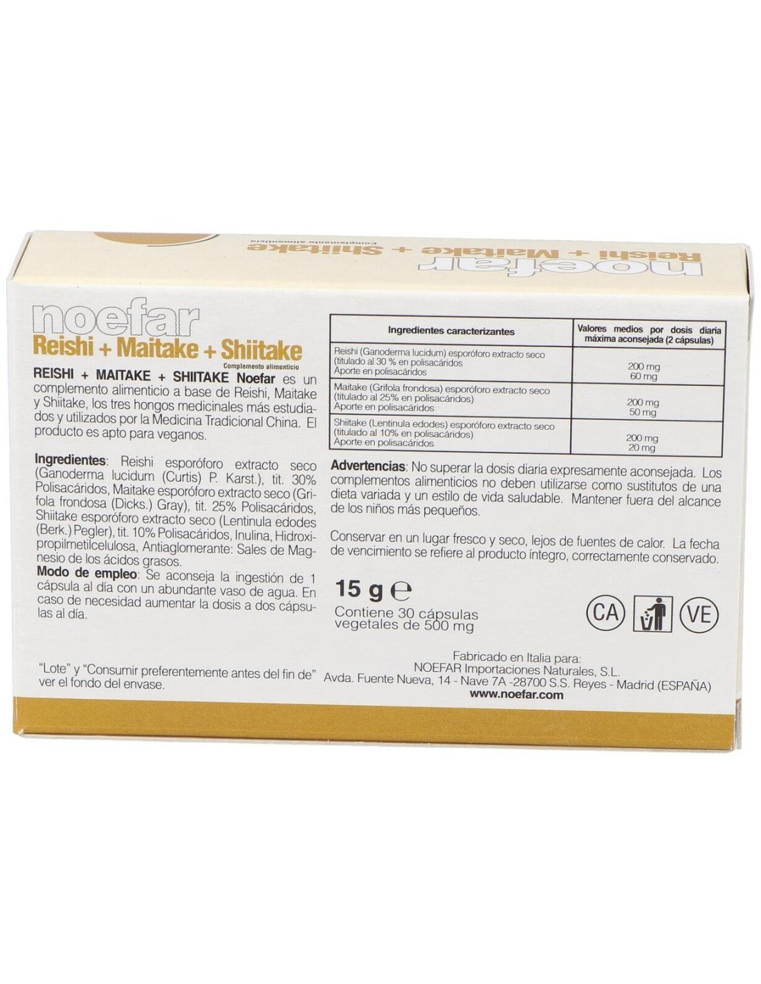 Propiedades de los principios activos:- Reishi:Diversos estudios han demostrado que los polisacáridos tienen propiedades inmunoestimulantes (favorecen la proliferación de linfocitos B y T, e incrementan la actividad de estos últimos), anticancerosas (estimula producción citocinas antitumorales y protegen la rotura del ADN) y antioxidantes (disminuyen oxidación de colesterol-LDL). Las glicoproteínas inhiben la replicación del virus herpes simplex (HSV). Los triterpenos incrementan la citotoxicidad e inducen apoptosis (anticancerosos), son hepatoprotectores (reducen los niveles de aspartato transaminasa, alanina transaminasa, lactodeshidrogenasa, fosfatasas alcalinas y bilirrubina total), inhiben liberación de histamina (antialérgico y antiinflamatorio), disminuyen la absorción y síntesis de colesterol (hipocolesterolemiante), inhiben la agregación plaquetaria (anticoagulante) y la actividad proteasa HIV-1 (anti-SIDA). También se han descrito propiedades analgésicas, hipoglucemiantes (antidiabéticas), relajantes musculares (espasmolíticas) e inhibidoras de la enzima conversora de la angiotensina (antihipertensivas). - Maitake: Al igual que sucede con otros hongos ricos en polisacáridos (Ganoderma lucidum, Lentinus edodes), el maitake destaca por sus cualidades inmunoestimulantes.