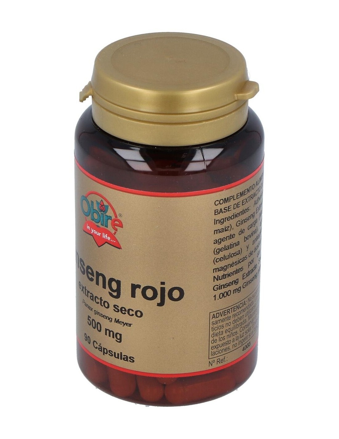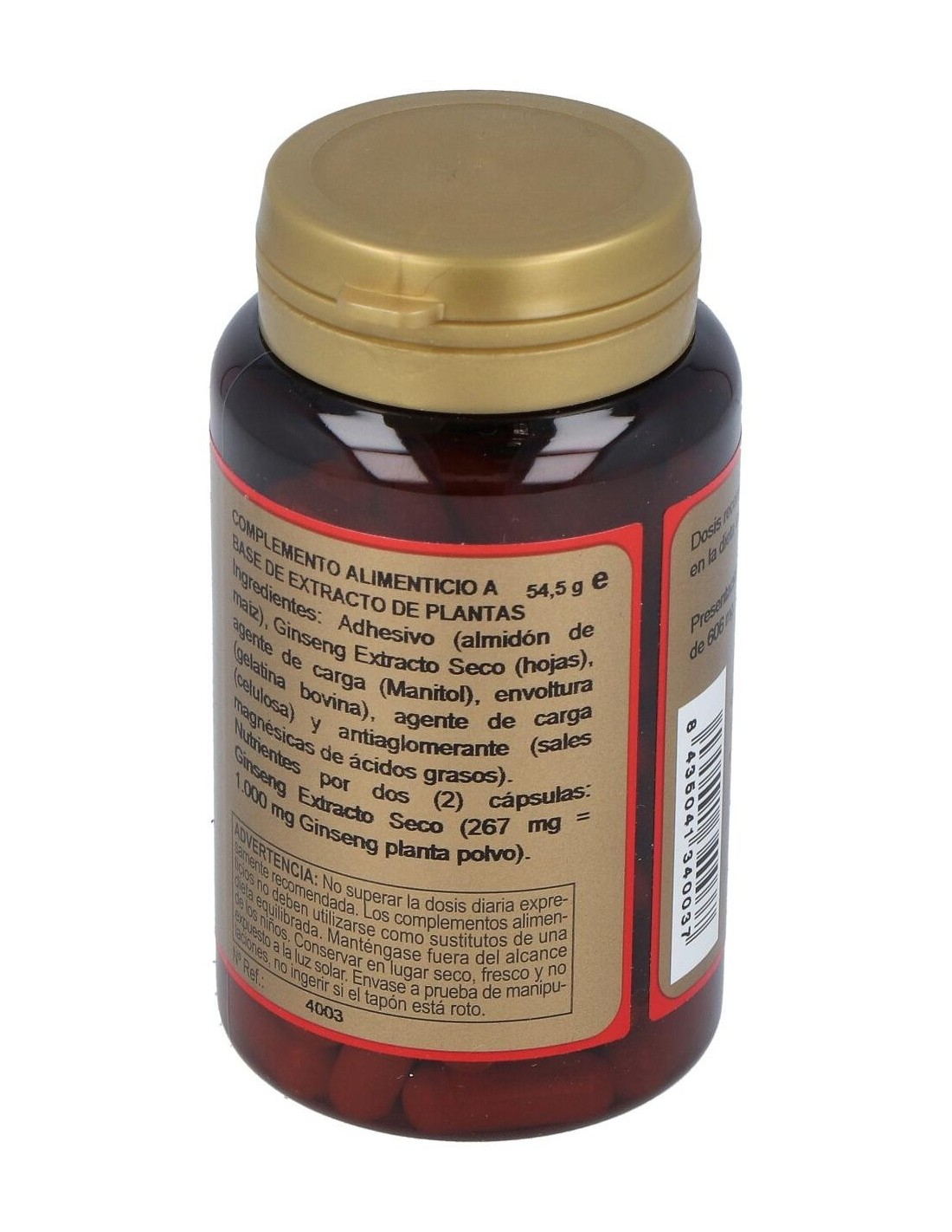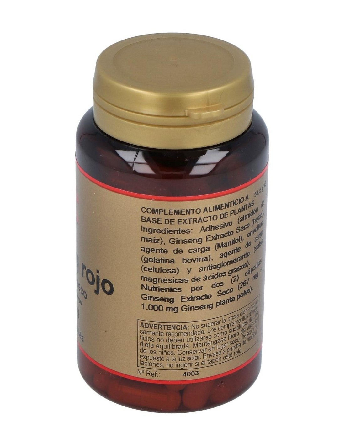 Adhesivo (Almidón de Maiz), Ginseng Extracto Seco Hojas (133.5 mg = 500 mg Ginseng Fresco), Agentes de Carga (Manitol y Celulosa Microcristalina), Antiaglomerante (Estearato Magnésico Vegetal) y Envoltura (Gelatina).