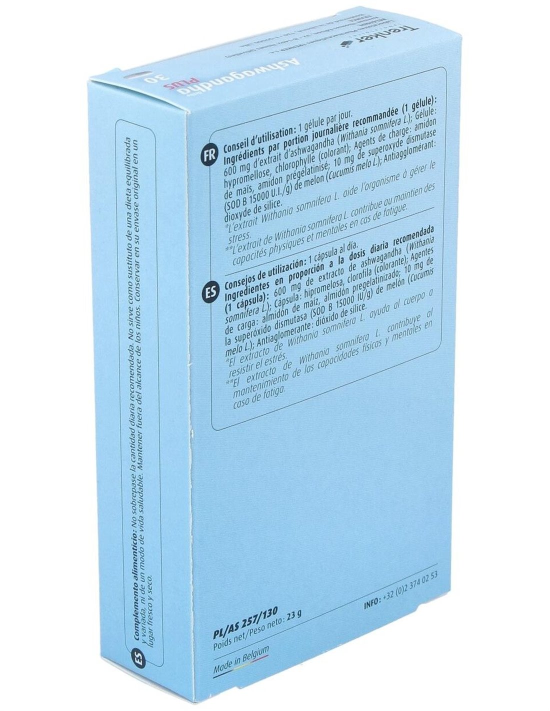 600 mg Ashwagandha KSM-66®estandarizada (raíz) con un porcentaje de withanólidos superior al 5% y witaferina A, inferior al 0,1 %