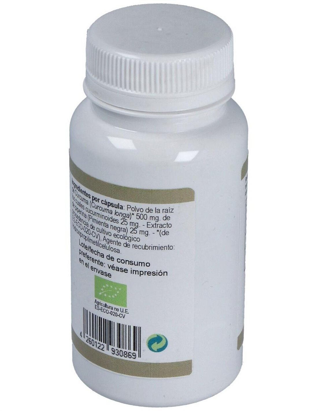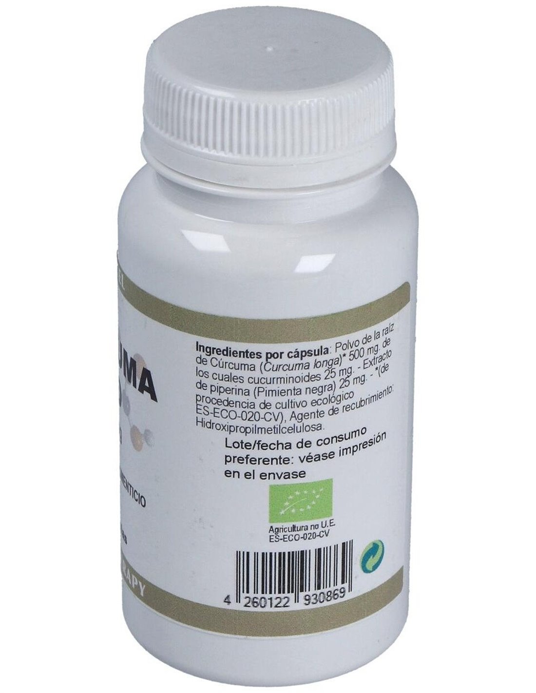 Polvo de la raíz de Cúrcuma (Curcuma longa), 500 mg de los cuales curcuminoides 25 mg, Extracto de piperina (Pimienta negra) 25 mg (BIOPERINE® 95% de piperina) (Piper nigrum) Aditivos con función tecnológica: Hidroxipropilmetilcelulosa (cápsula) y Estearato de magnesio.