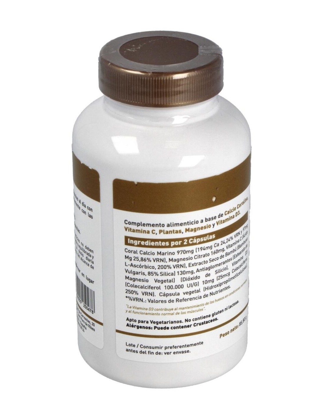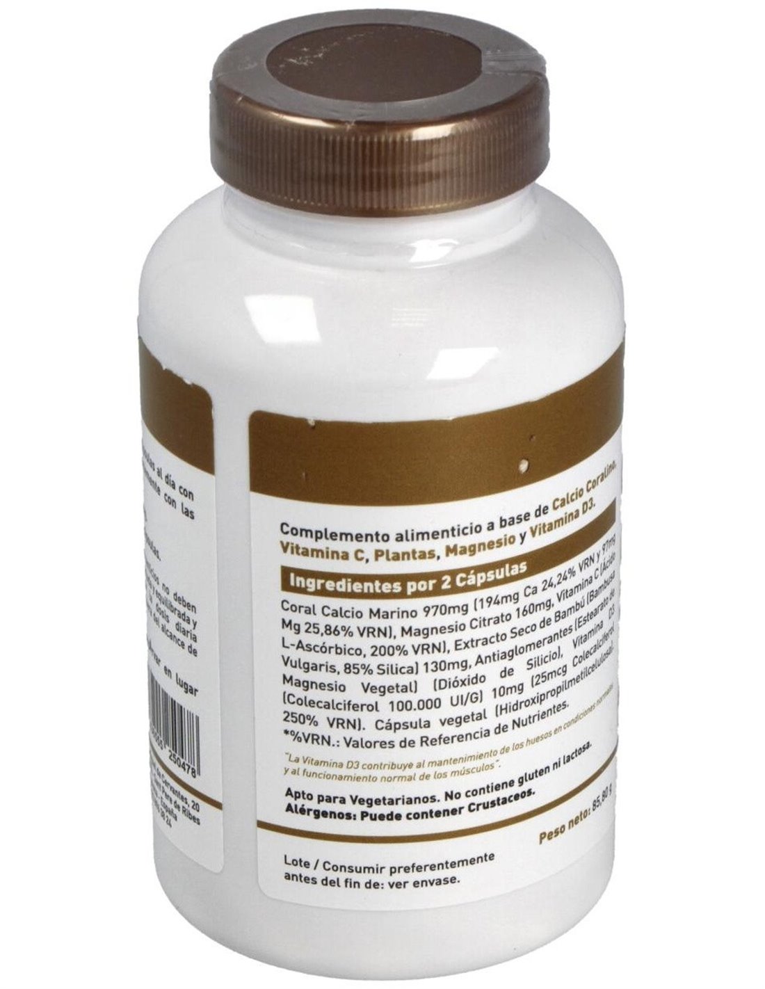 Complemento alimenticio en forma de cápsulas, elaborado a base de calcio coralino marino, extractos de bambú, y vitaminas C y D3, que ayuda en la correcta formación y mantenimiento en buen estado de huesos y dientes. El calcio coralino también contiene calcitonina, que junto a la vitamina D3, ayuda a fijar y aprovechar mejor el calcio.