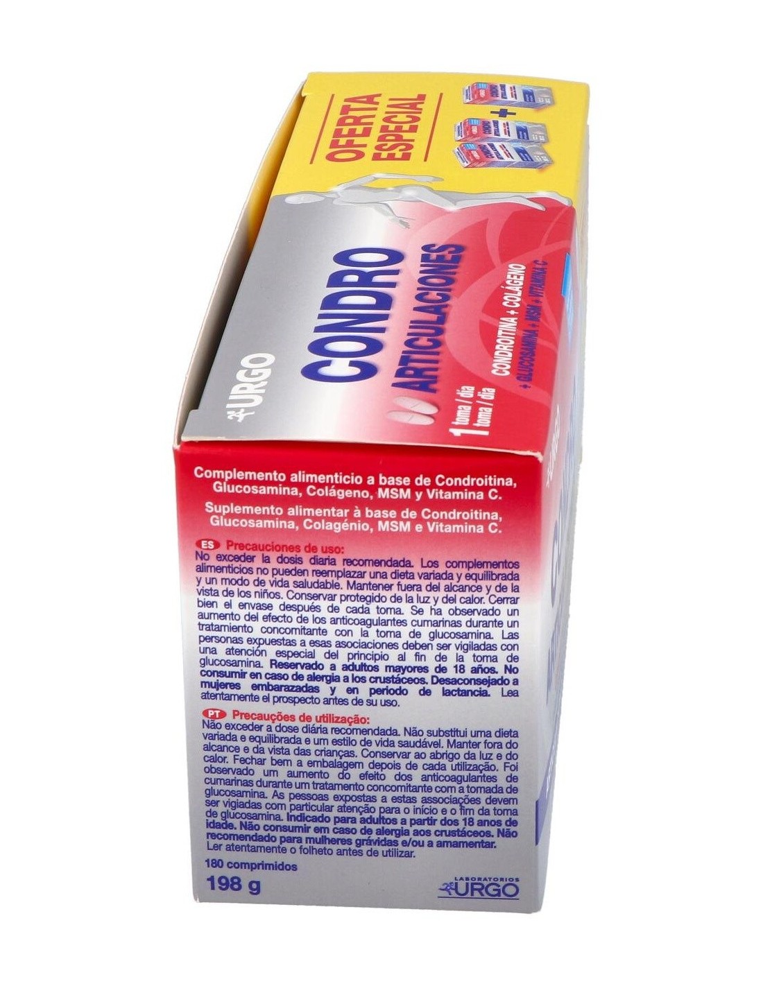 Complemento alimenticio formulado para contribuir al cuidado y bienestar de las articulaciones. Resulta en una mezcla de minerales y compuestos que resultan adecuados en la constitución del cartílago, ligamentos, tendones, uniones óseas y los huesos. La composición contiene: condroitina, glucosamina, colágeno, MSM y vitamina C con otros excipientes.