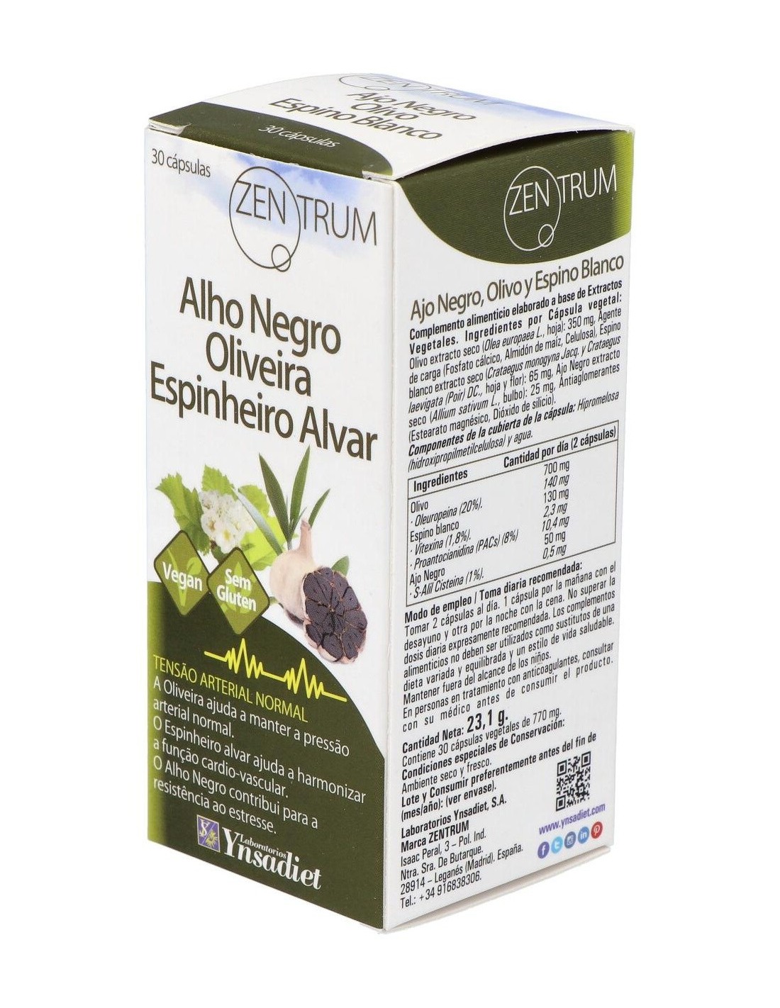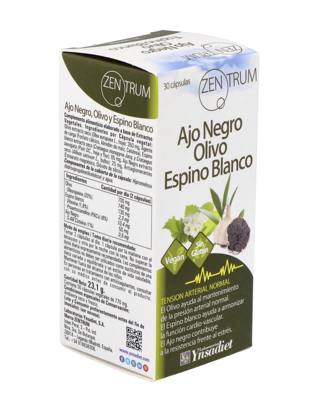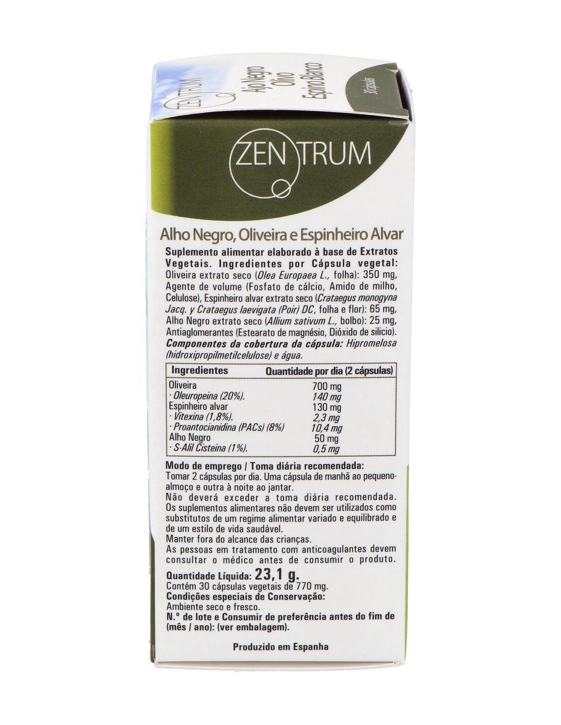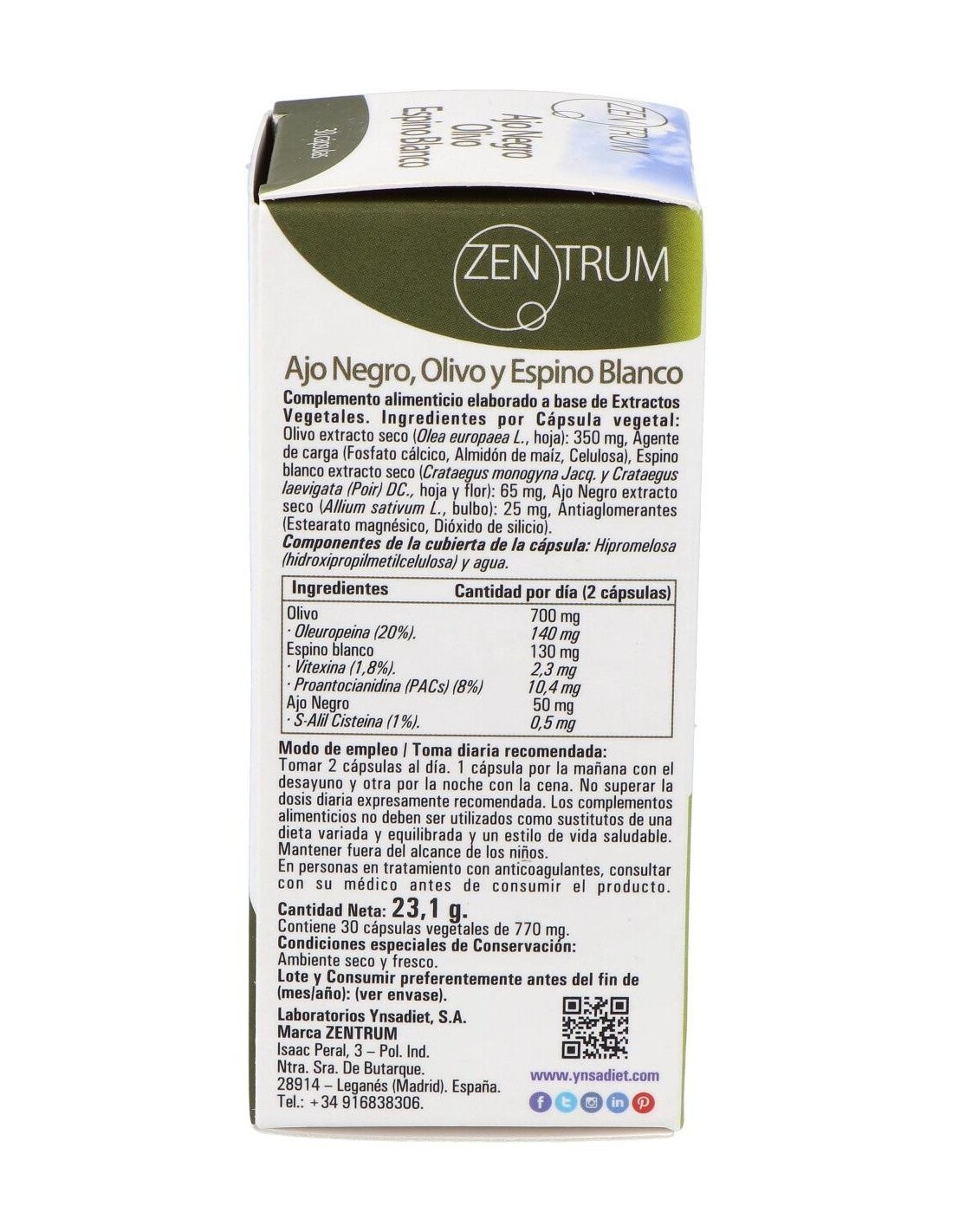 Complemento alimenticio en forma de cápsulas, elaborado a base de ajo negro, olivo y espino blanco, que contribuyen a la buena salud del sistema cardiovascular.