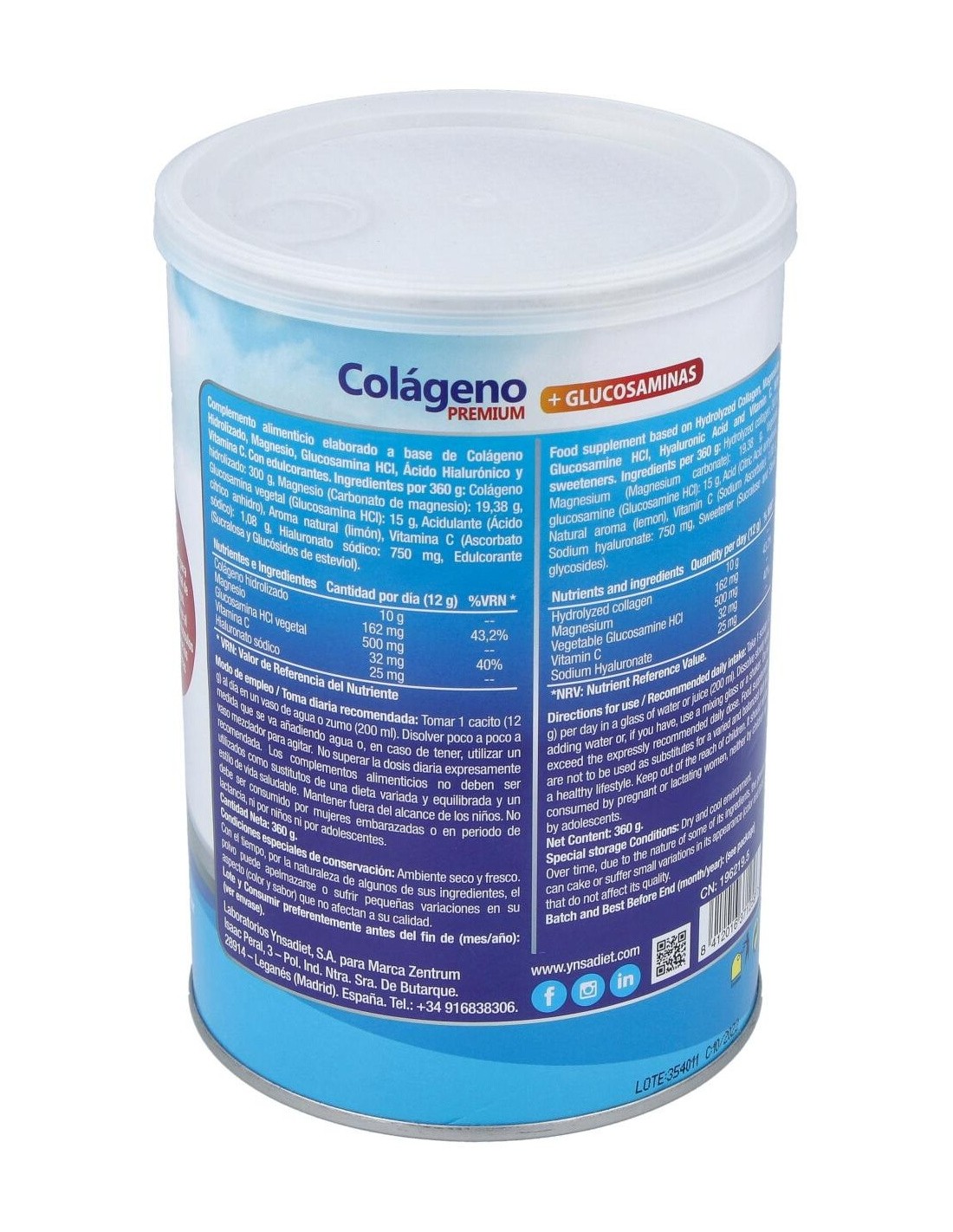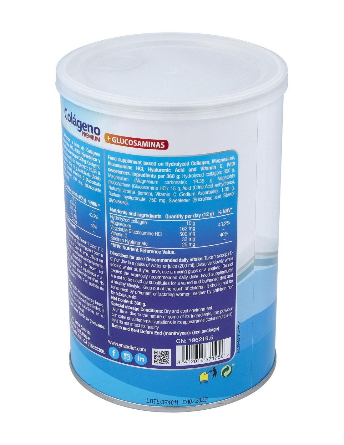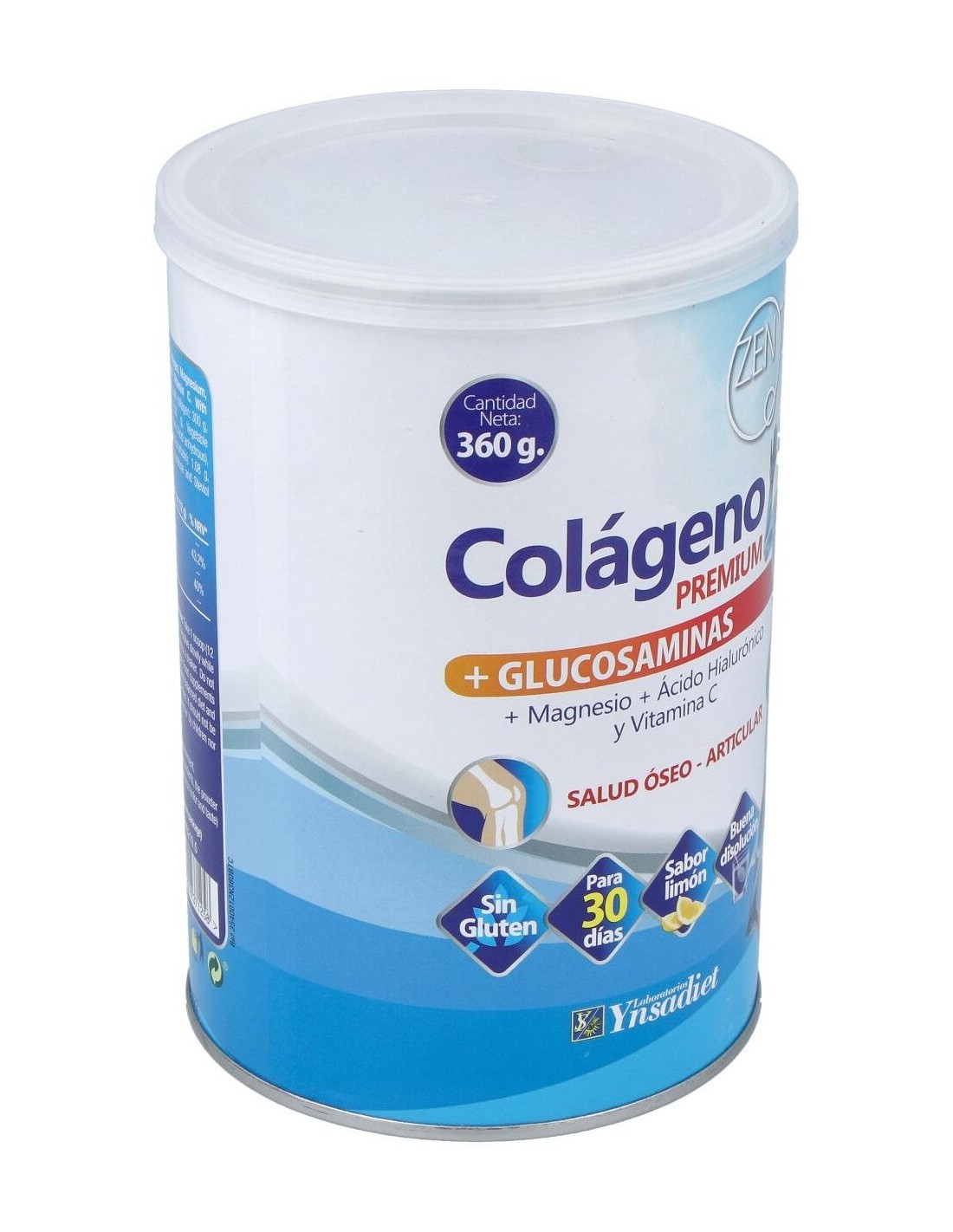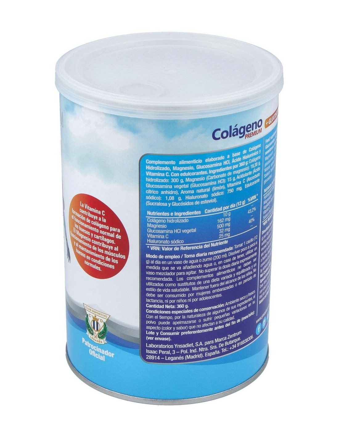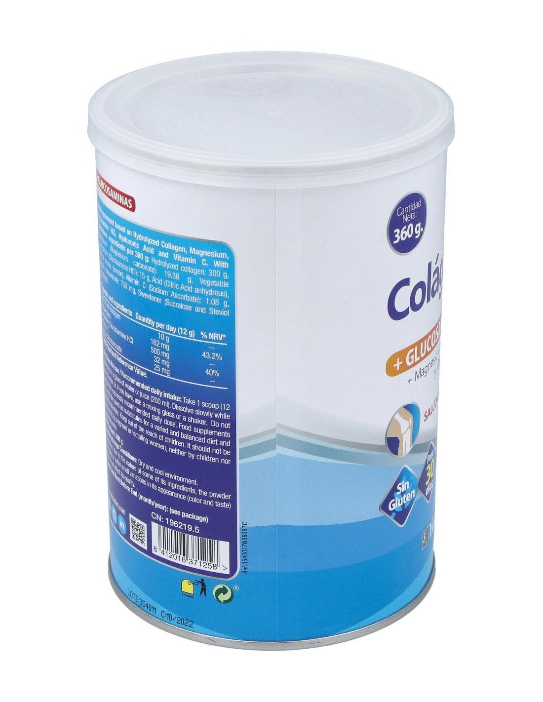 Colágeno hidrolizado, Magnesio (Carbonato de magnesio), Glucosamina vegetal (Glucosamina HCl), Acidulante (Ácido cítrico anhidro), Aroma natural (limón), Vitamina C (Ascorbato sódico), Hialuronato sódico. Edulcorante (Sucralosa y Glucósidos de esteviol).