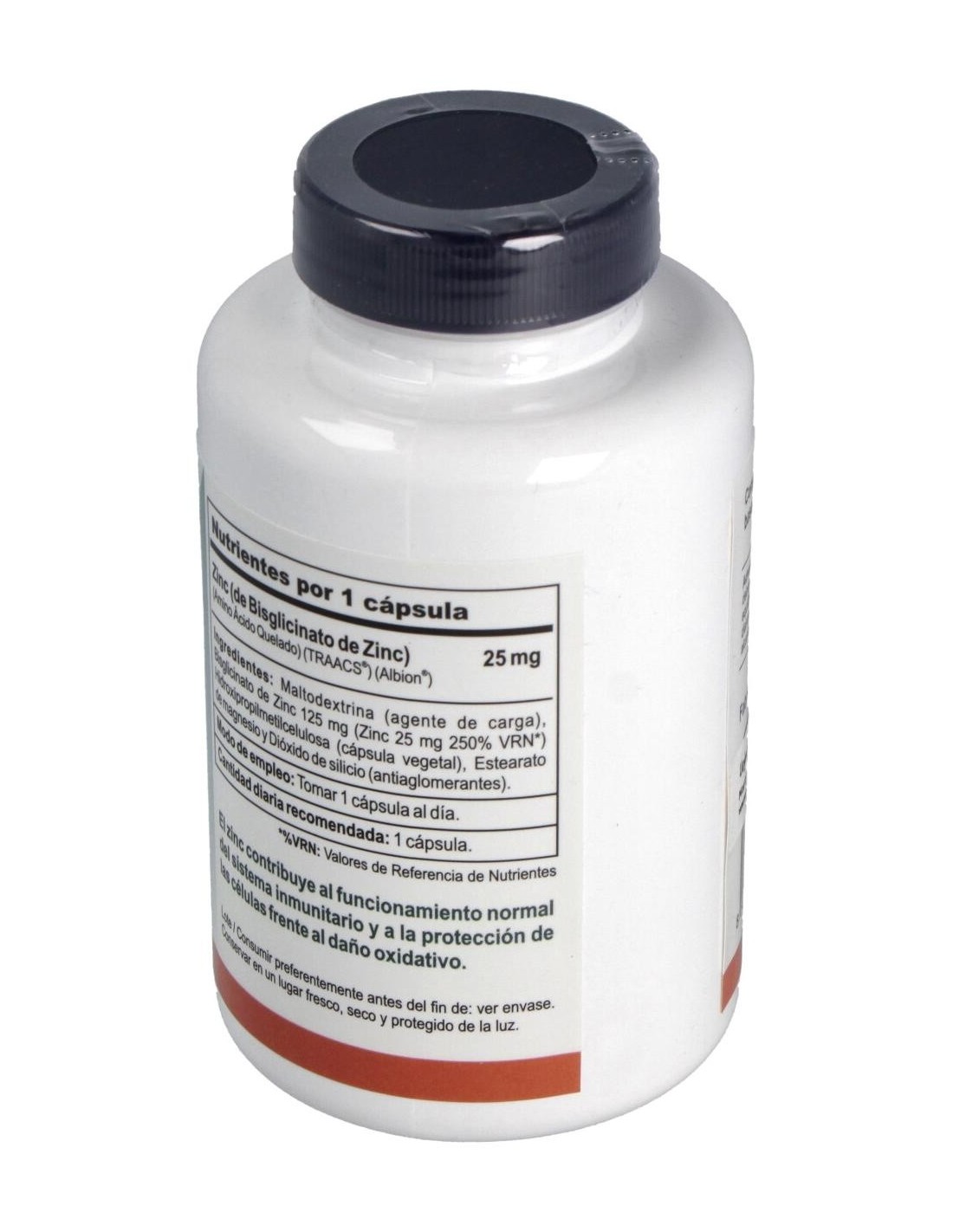 Zinc (Bisglicinato de Zinc), Maltrodextrina (agente de carga), Hidroxipropilmetilcelulosa (cápsula vegetal), Estearato de magnesio y dióxido de silicio (antiaglomerantes).