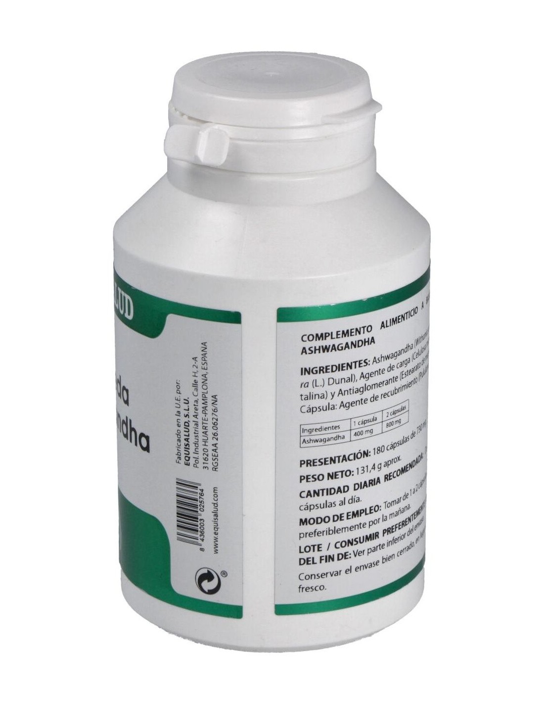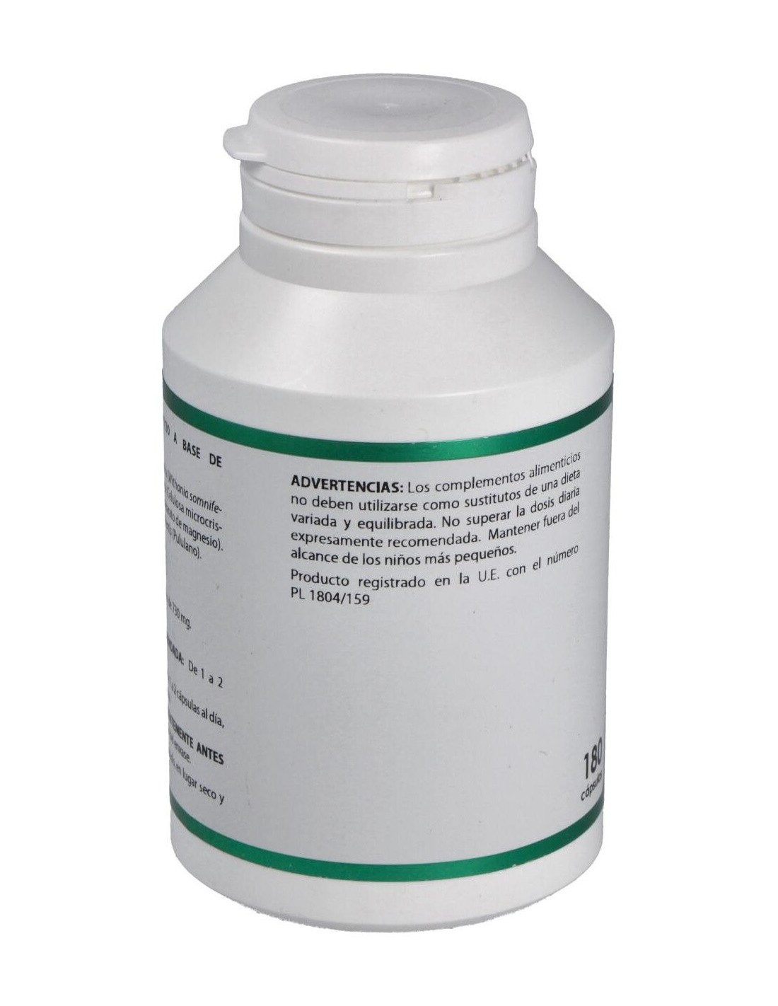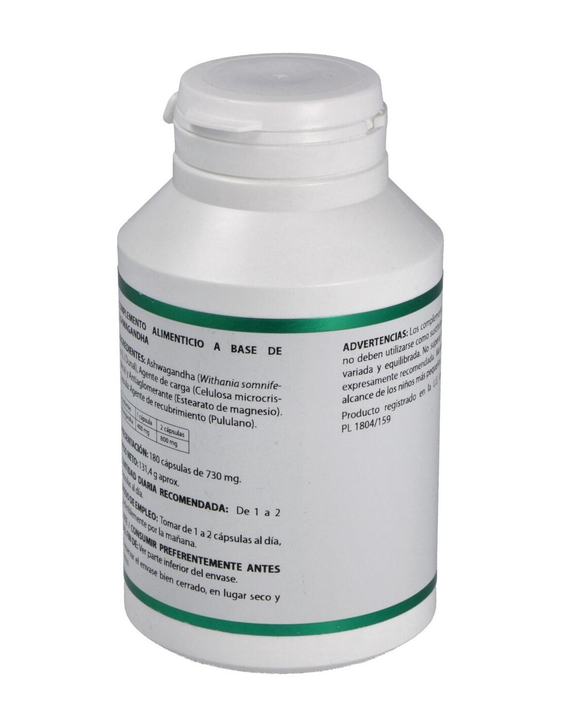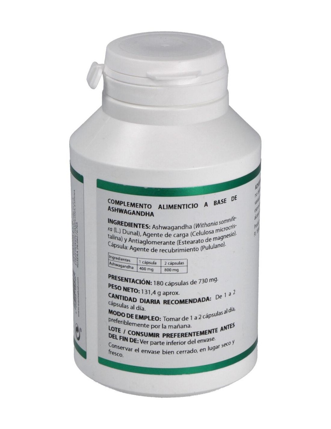 Ingredientes por cápsula:Ashwagandha extracto seco (Whitania somnifera, raíz, =1,5% whitanólidos), 400 mg; celulosa microcristalina (E-460) 205 mg y estearato de magnesio (E-572) 6 mg.Modo de empleo:Tomar de 1 a 2 cápsulas al día, preferentemente por la mañana.Presentación:Bote de 180 cápsulas.